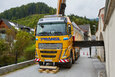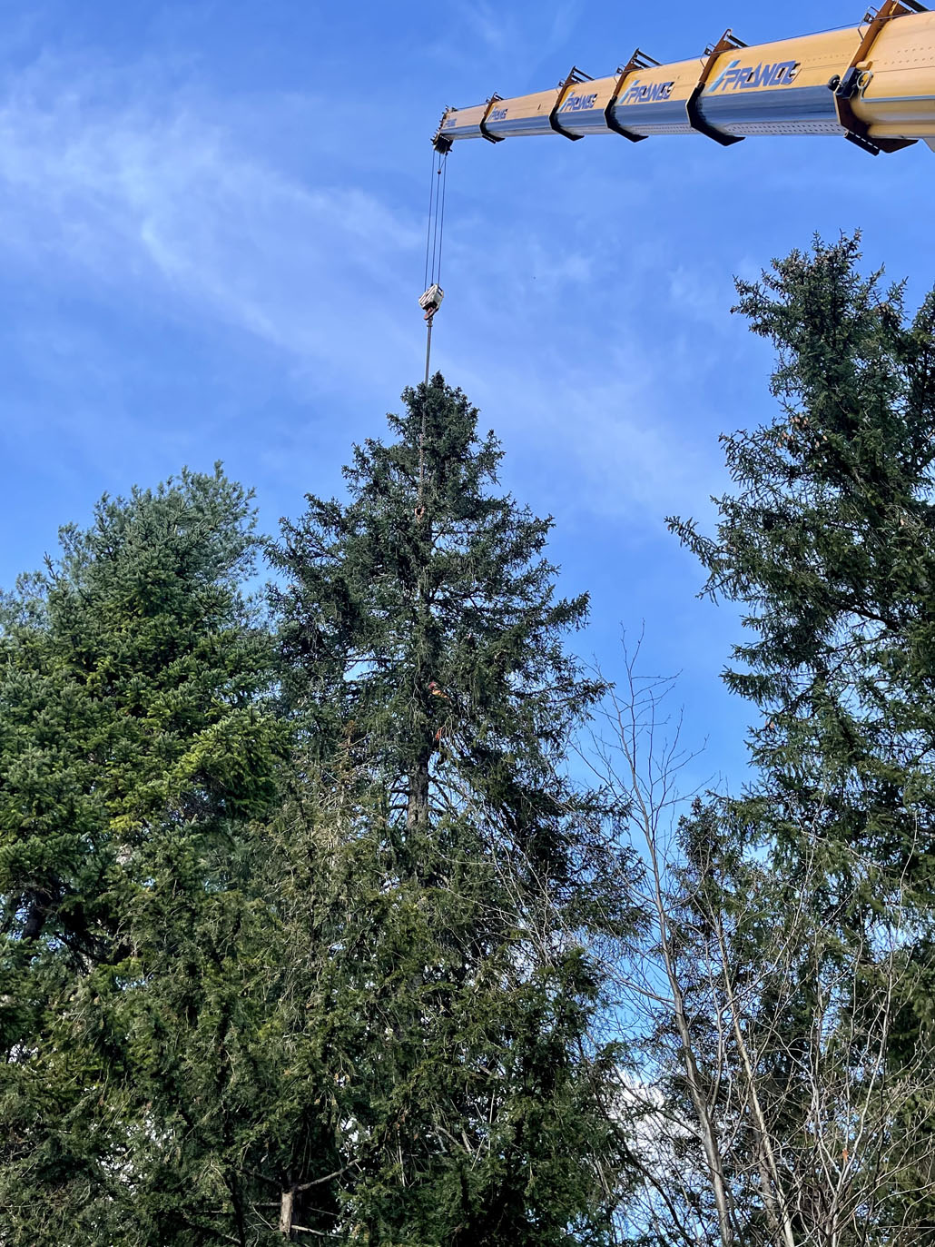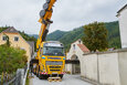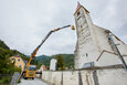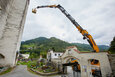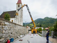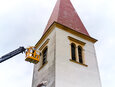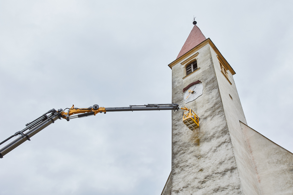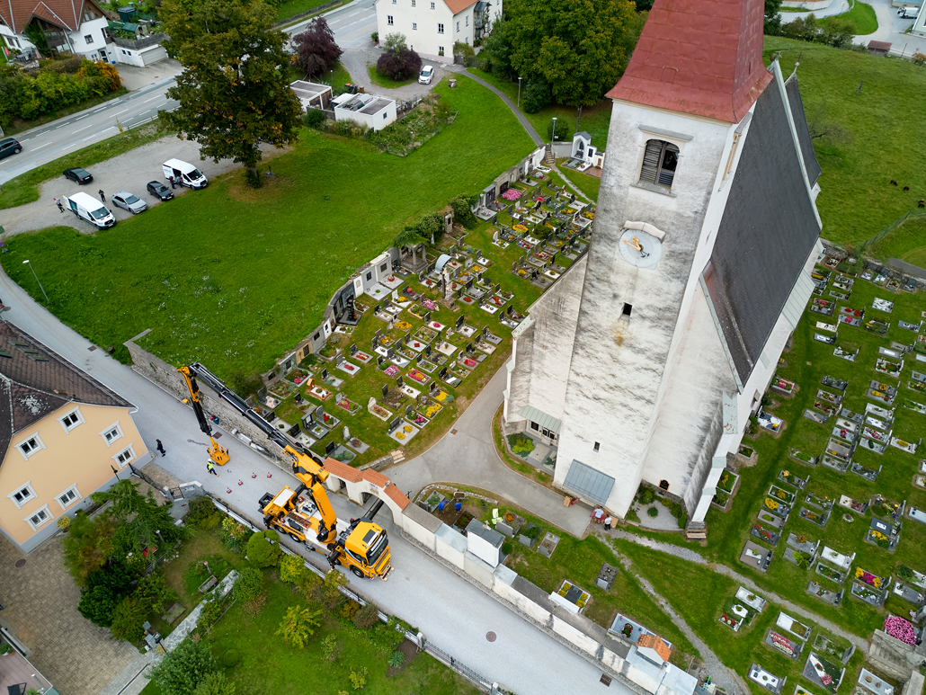 Novo kamionsko dvigalo s pogonom na vsa štiri kolesa in nosilnostjo 225 tonmetrov je s svojimi tehničnimi lastnostmi idealno za prenovo oddajnika v cerkvenem stolpu. Zaradi omejenega prostora – ozke dostopne ceste, pokopališkega zidu in ograj sosednjih parcel – ni bilo mogoče v celoti razpreti vseh podpor dvigala. Rešitev je bila domiselna: glavna opora dvigala je bila speljana skozi vrata v pokopališkem zidu, kar je zagotovilo stabilno in varno postavitev. Po natančni namestitvi kamionskega dvigala so se lahko začela dela v skladu z naročilom. Prvi korak je bilo temeljito čiščenje cerkvenega stolpa.