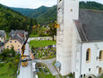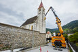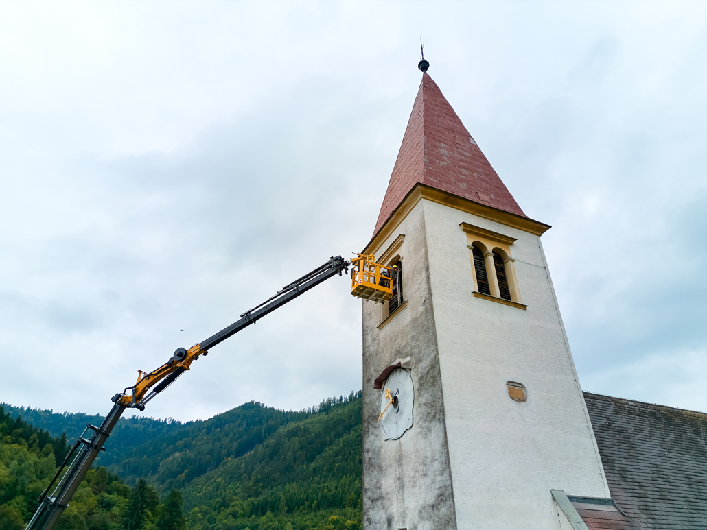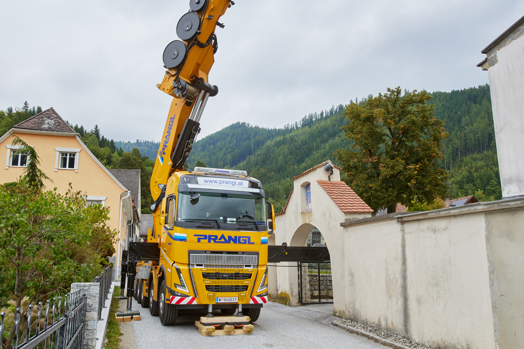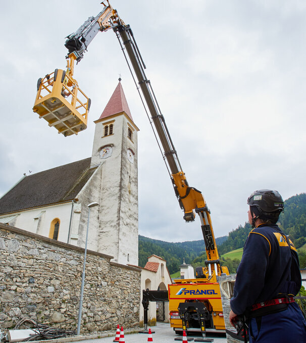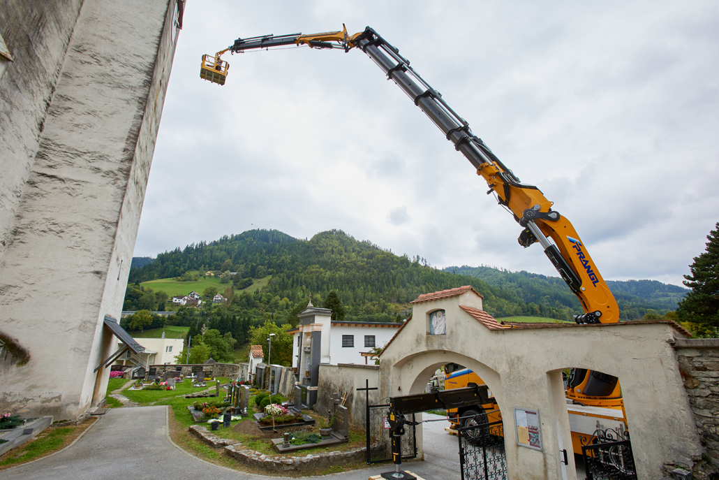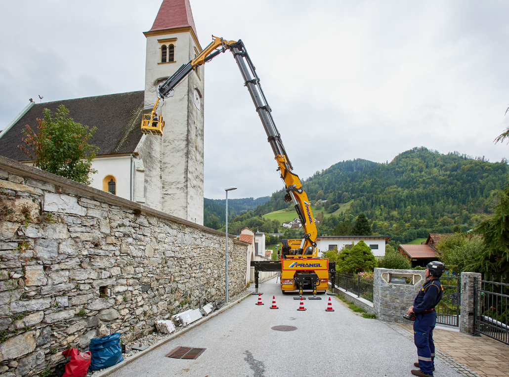 Župnijska cerkev v Übelbachu je poznogotska cerkev. Na obeh straneh jo obdaja pokopališče, dostop pa je mogoč le po ozki cerkveni poti. Ta okoliščina je za ekipo Prangl predstavljala poseben izziv. Po eni strani je bilo treba opremo varno namestiti na cerkveni poti, po drugi strani pa je morala doseči potrebno višino in hkrati nositi zahtevano težo. Nova naprava v voznem parku podjetja Prangl je omogočila, da je bila naloga izpolnjena enostavno in učinkovito.