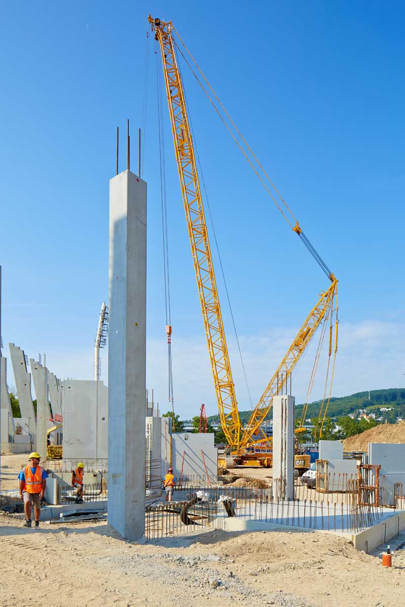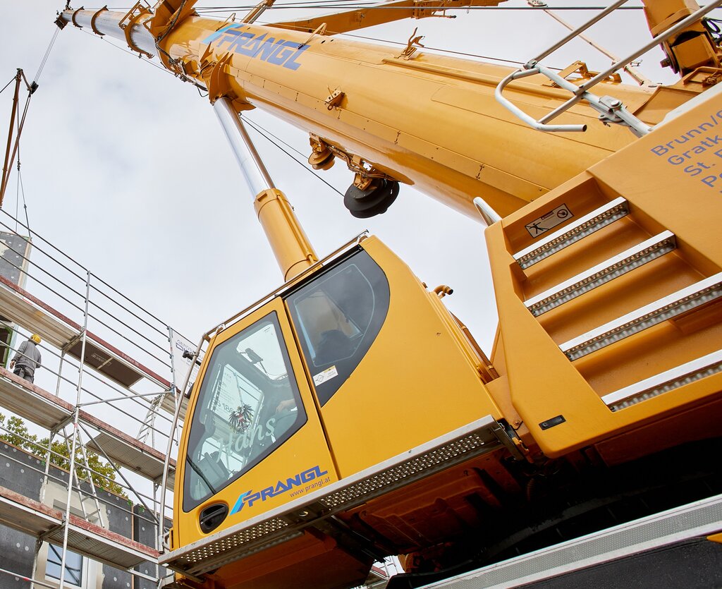 Gosenično dvigalo je posebej primerno za gospodarno premeščanje številnih betonskih montažnih elementov v kratkem času. Vožnja z natovorjenim dvigalom zagotavlja optimizirane čase montaže oz. postavitve dvigal. Skupaj z naročnikom smo se že zelo zgodaj odločili za ta koncept. To pa še ni vse. Družba Prangl že »šari« po začetnih luknjah za naslednjo gradbeno fazo – montažo strehe tribune. Za ta namen bo treba obstoječo opremo še dopolniti – z najmanj enim dodatnim goseničnim dvigalom nosilnosti 200 t.