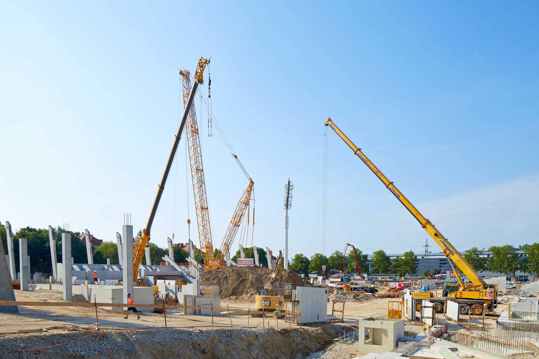 Najprej smo dvignili in namestili 18 m dolge in do 44 t težke podpornike, 23 m dolge in 39 t težke nosilce ter 10 m dolge in 15 t težke tribunske plošče. Dodatno smo dvignili montažne stene in strope iz lesa. Za to smo sočasno uporabili več naprav družbe Prangl – mojstra v dviganju in premeščanju težkih tovorov: gosenično dvigalo nosilnosti 400 t ter teleskopska dvigala nosilnosti 100 t, 95 t in 50 t.