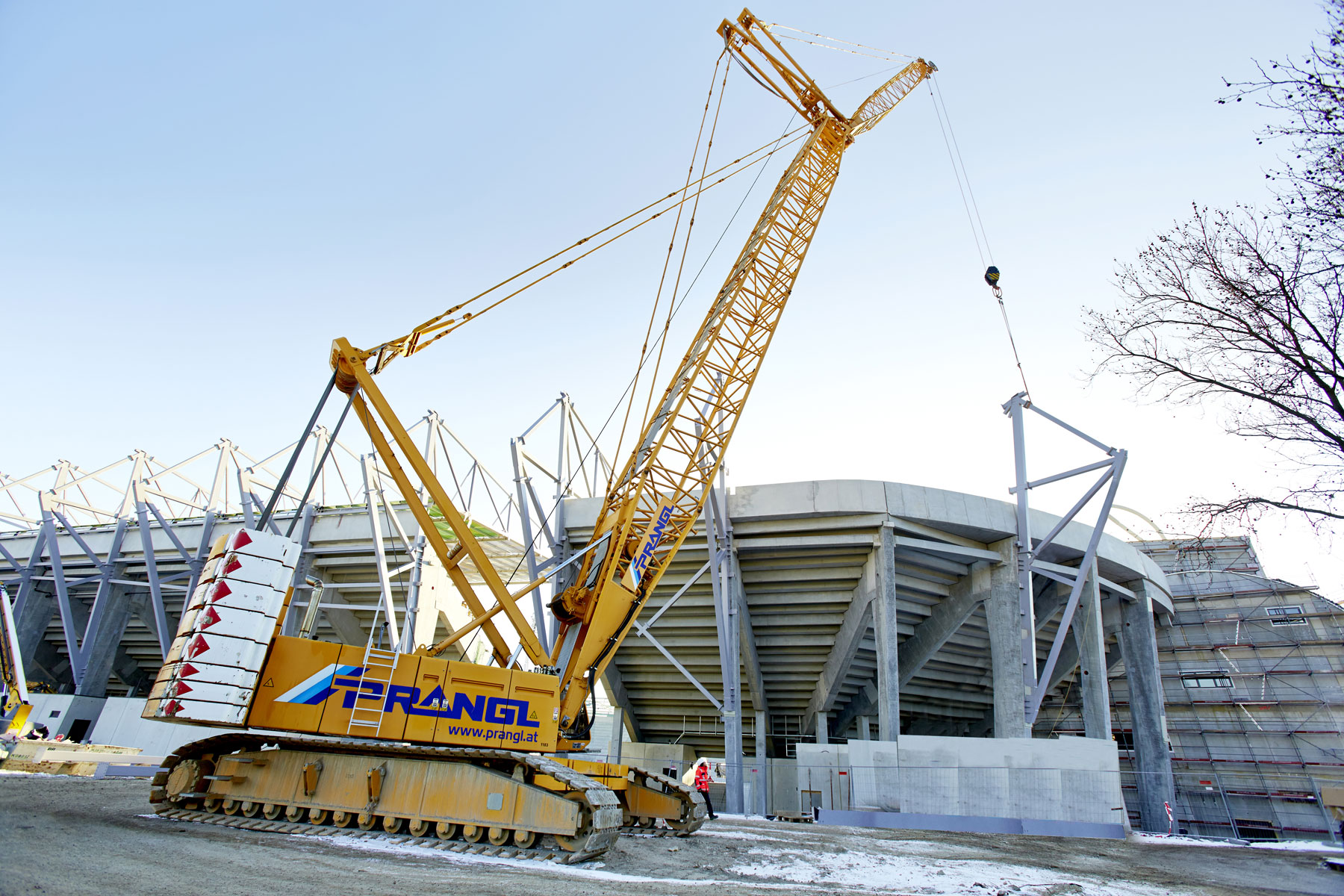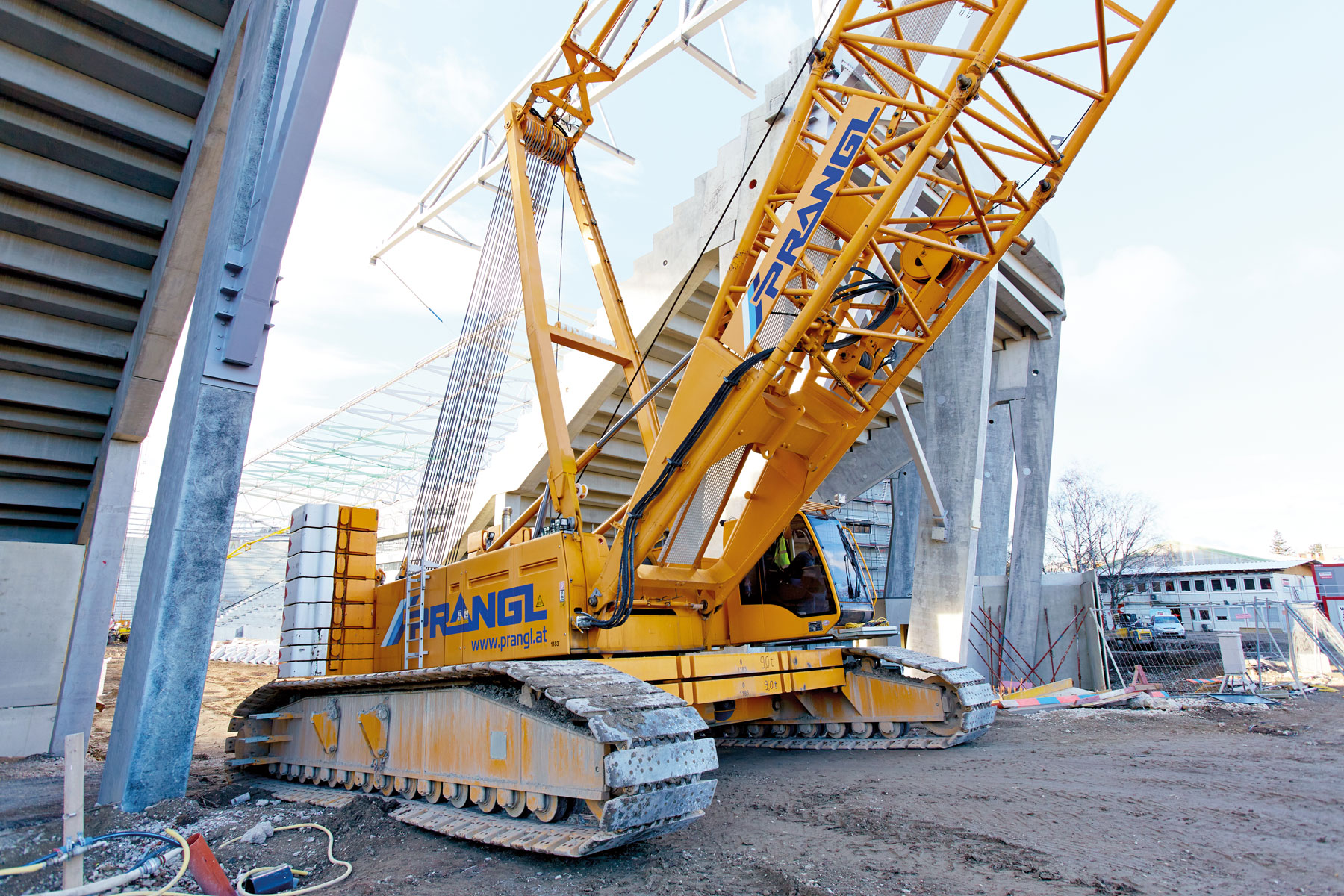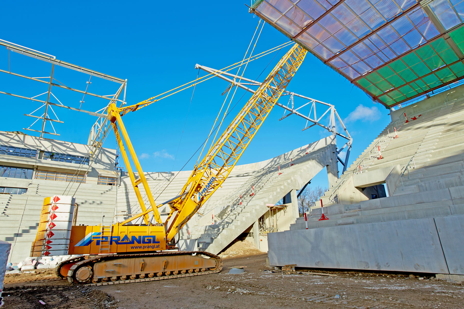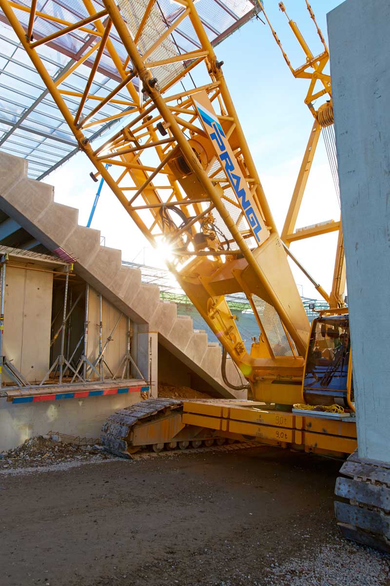 Avstrijski rekordni prvak NK Rapid Dunaj bo od sezone 2016/2017 naprej spet gostoval na novem domačem igrišču. Da bi lahko upoštevali ambiciozno zastavljen časovni načrt, smo morali čim prej začeti s kopanjem na igrišču. Vendar pa bi gosenično dvigalo nosilnosti 280 t pri tem predstavljalo oviro. Torej je moralo dvigalo pred zaključkom zanj določenega dela zapustiti stadion. Upravljavec dvigala je moral velikana na milimeter natančno prepeljati skozi ozek dovoz, preko klančine z 10-odstotnim naklonom.