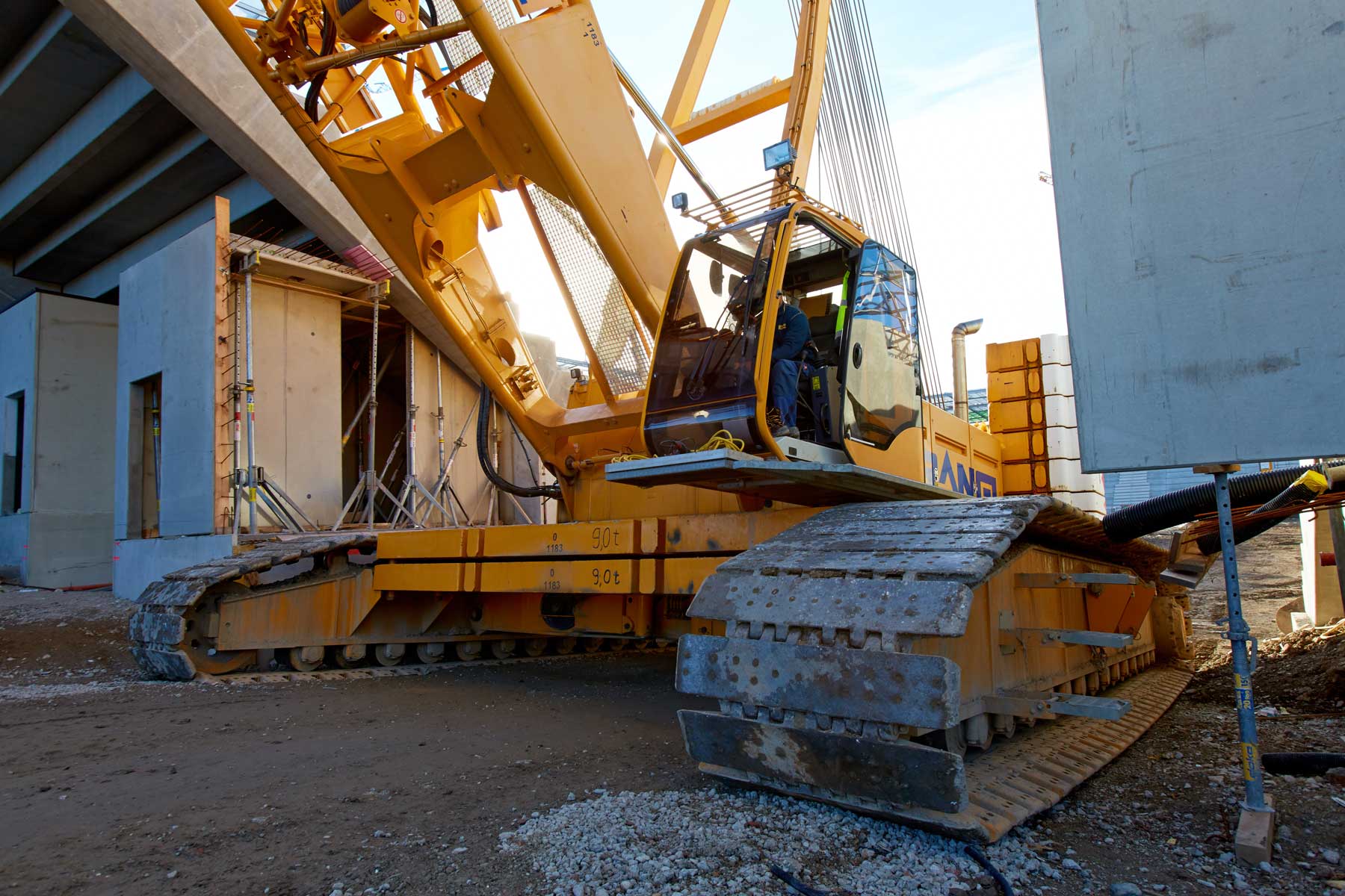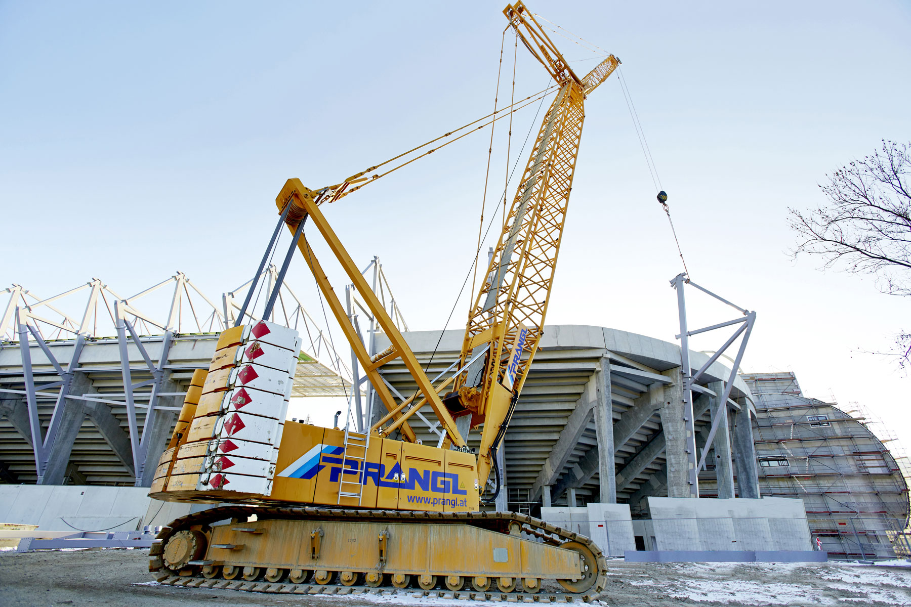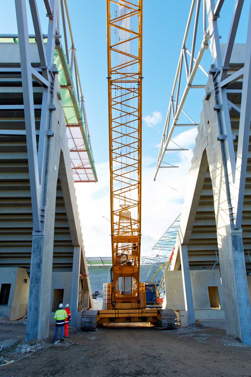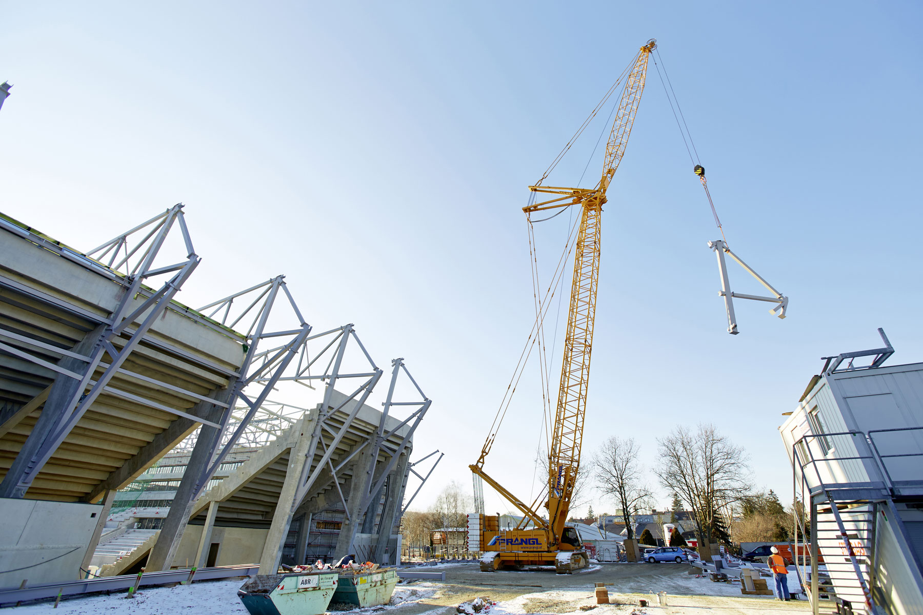 Avstrijski rekordni prvak NK Rapid Dunaj bo od sezone 2016/2017 naprej spet gostoval na novem domačem igrišču. Da bi lahko upoštevali ambiciozno zastavljen časovni načrt, smo morali čim prej začeti s kopanjem na igrišču. Vendar pa bi gosenično dvigalo nosilnosti 280 t pri tem predstavljalo oviro. Torej je moralo dvigalo pred zaključkom zanj določenega dela zapustiti stadion. Upravljavec dvigala je moral velikana na milimeter natančno prepeljati skozi ozek dovoz, preko klančine z 10-odstotnim naklonom.
