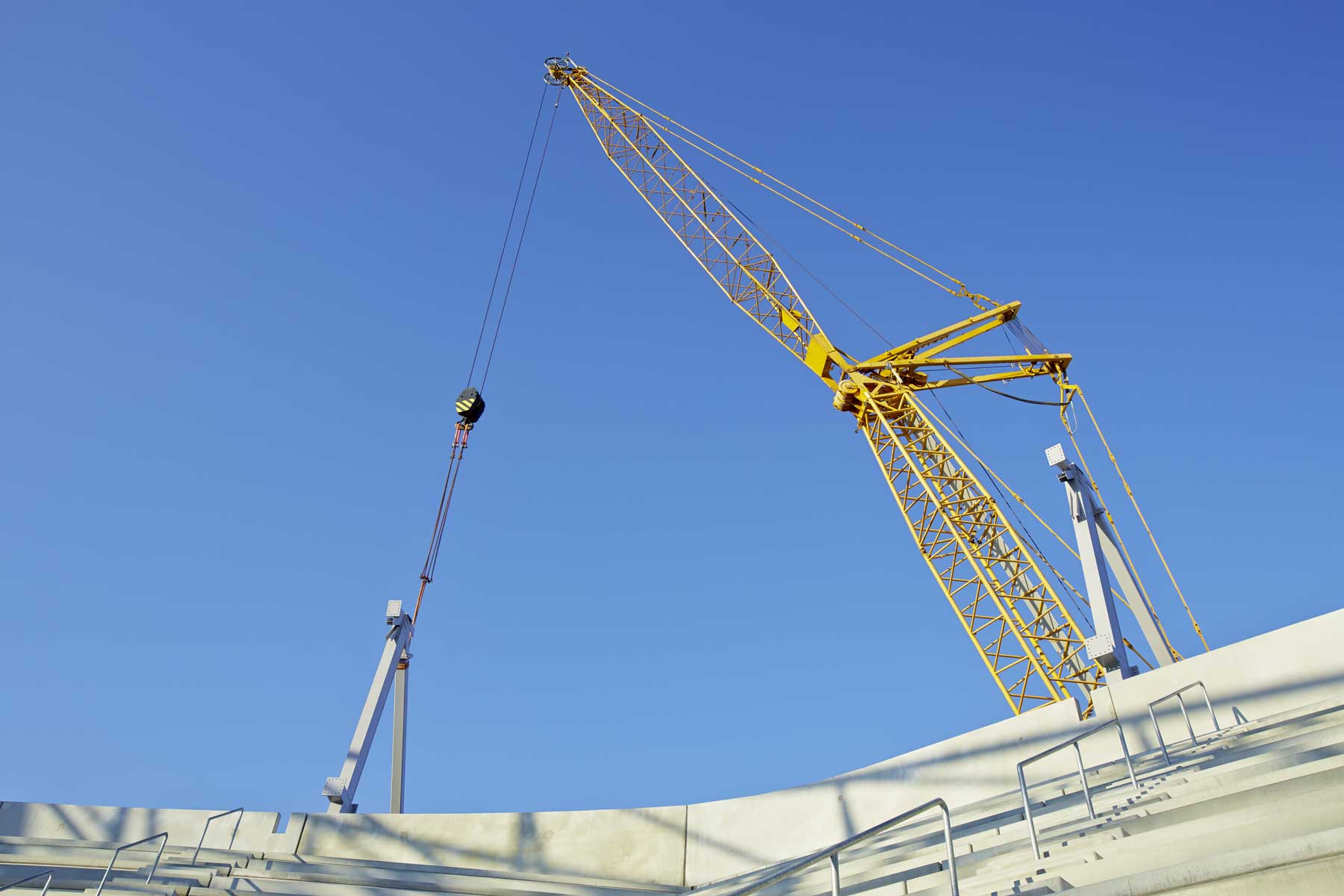 Za preprečevanje prevrnitve je bilo treba rešetkasto roko opremiti z natančno količino protiuteži. Zaradi naklona terena je bilo nujno razporediti težo goseničnega dvigala po njegovi celotni dolžini. To je zahtevalo največjo natančnost in občutek upravljavca goseničnega dvigala. Po uspešnem odvozu, je dvigalo zunaj prejšnjega območja sodelovalo pri nadaljnjih dvižnih delih. Tako npr. je z nihajno roko z zunanje strani, preko zadnje stene tribune, dvignilo in namestilo še zadnje težke jeklene konstrukcije.