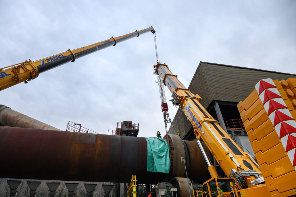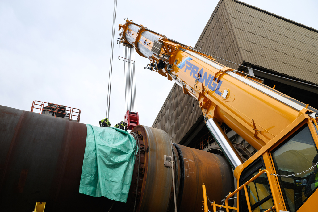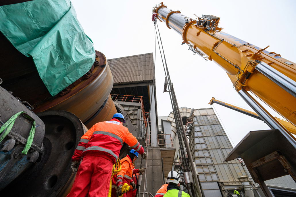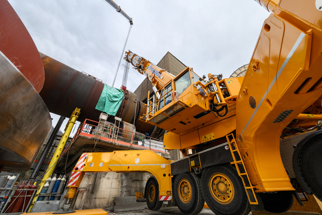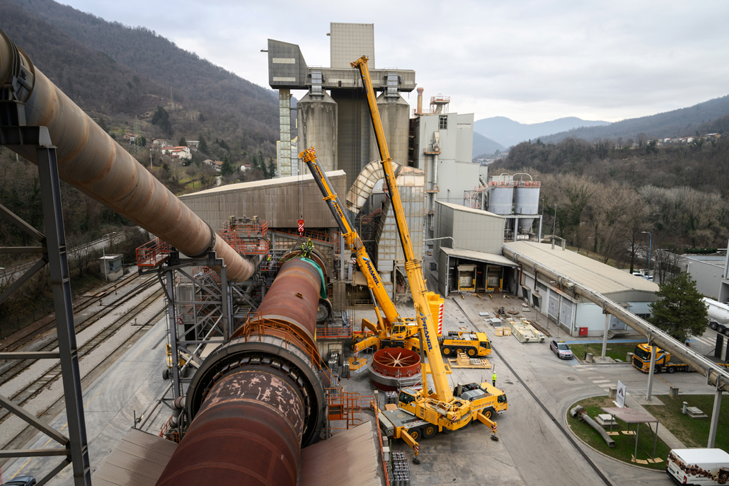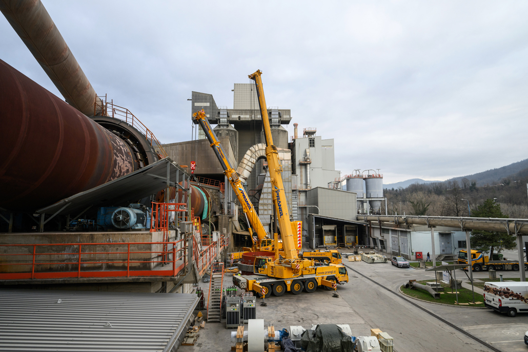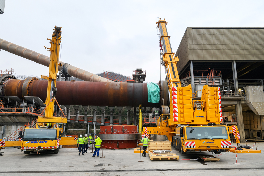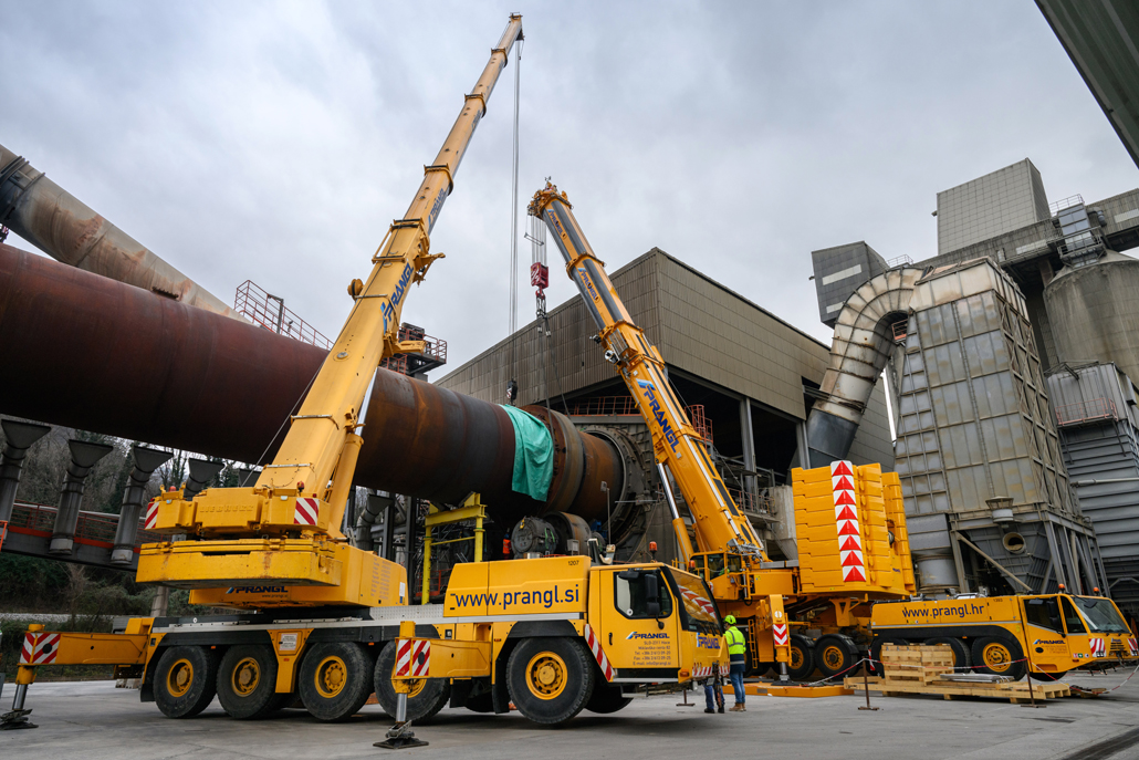 Naročnik za vzdrževalna dela v cementarni (to je edina cementarna v Sloveniji in največji zaposlovalec v osrednjem Posočju) je nalogo dodelil rumenim strokovnjakom. Sodelavci podjetja Prangl so po natančni študiji izbrali novo 500-tonsko mobilno dvigalo kot glavnega izvajalca za to nalogo. Kot pomožno dvigalo je služilo 160-tonsko teleskopsko dvigalo. Med občutljivimi deli na rotacijskem pečnem sistemu je bila proizvodnja seveda ustavljena. Preden so lahko dvigi sploh potekali, je bilo treba najprej prerezati cevni del z starim opornim kolesom.