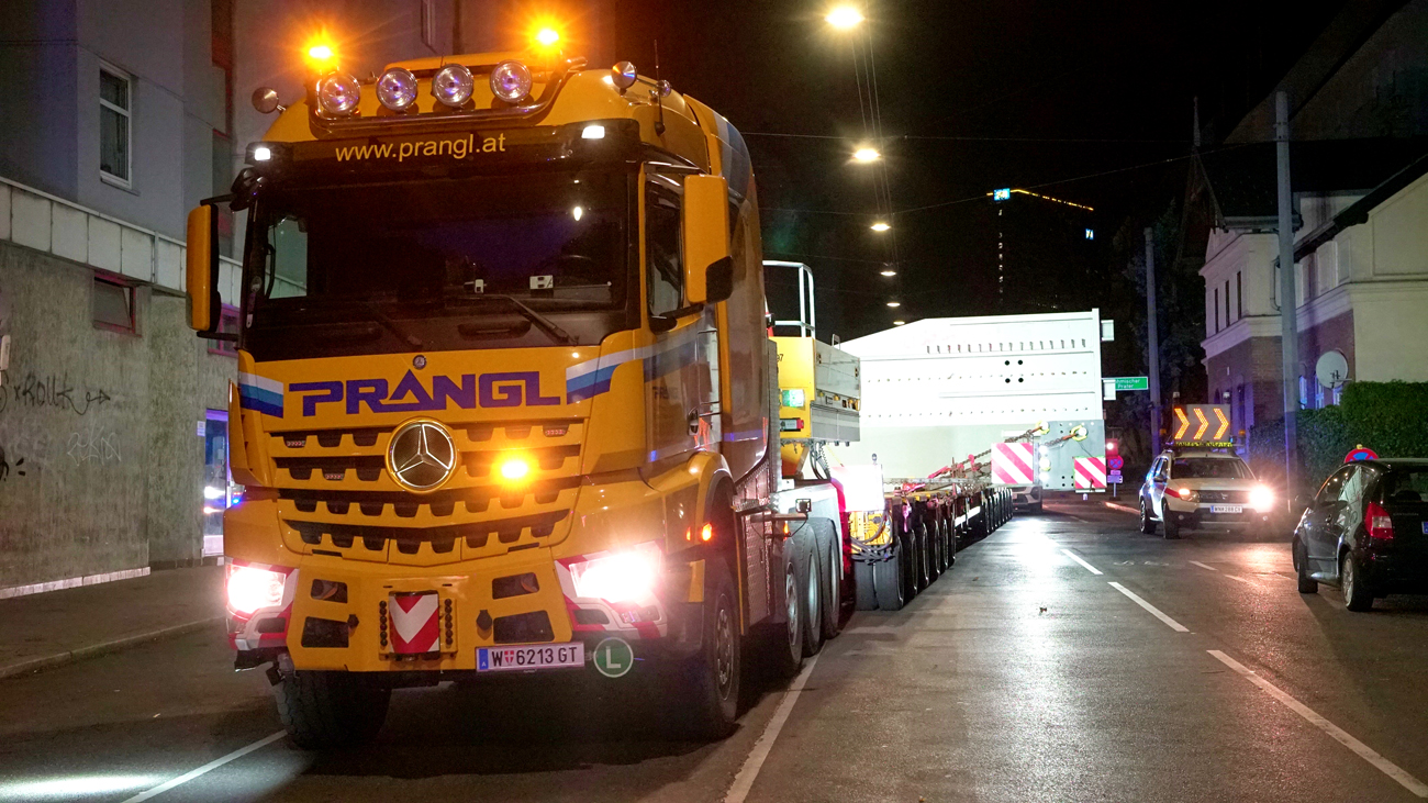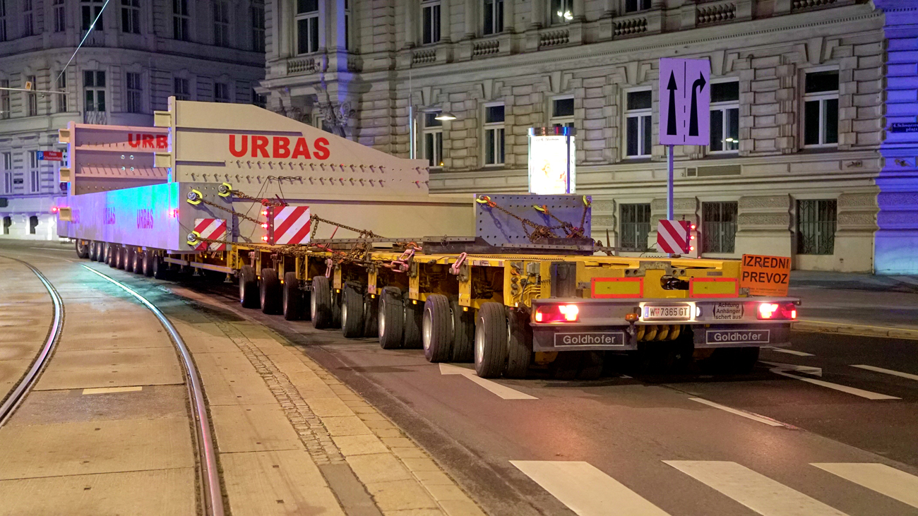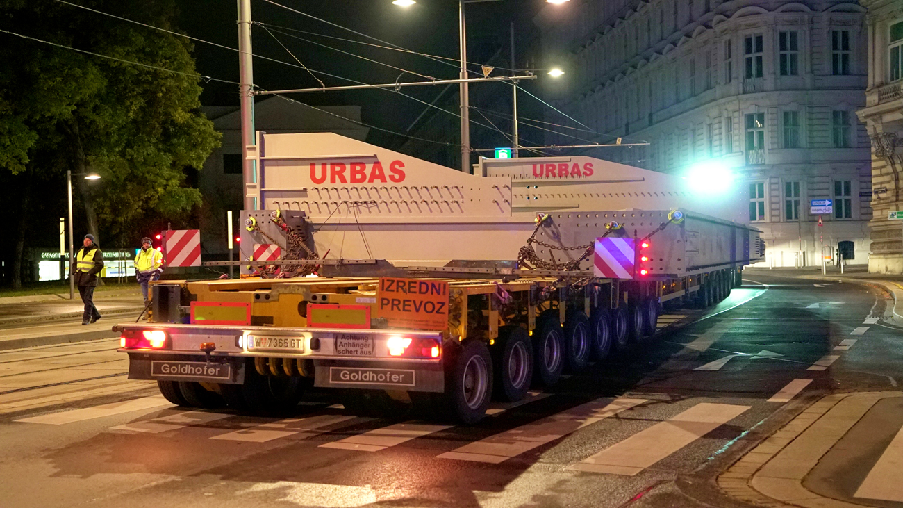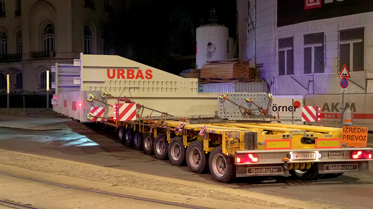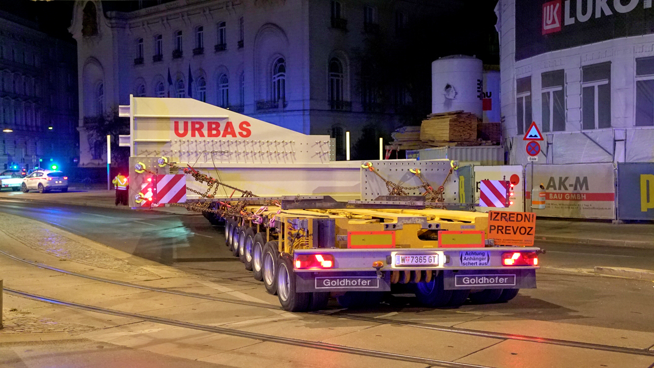 Naloga je zahtevala deset posebnih prevozov, da smo lahko različna jeklena predalčja s Koroškega premestili na Dunaj. Teh deset prevozov smo izvedli s sedmimi različnimi kombinacijami naprav, pri čemer je bila največja transportna enota 4-osni vlačilec s 14-osnim transportnim modulom za prevoz težkega tovora. Na ta način smo prepeljali največji del, ki je v širino meril 6,4 metra in v dolžino 40 metrov, tehtal pa je 108 ton. Iz tega izpeljane transportne dimenzije so bile še impresivnejše: 47,5 metra dolžine, 6,4 metra širine in 4 metre višine ter slabih 200 ton skupne mase.