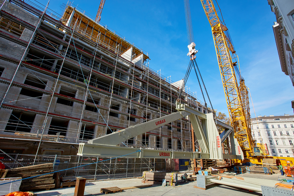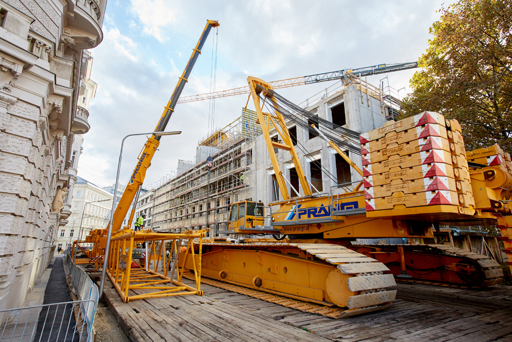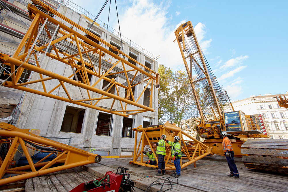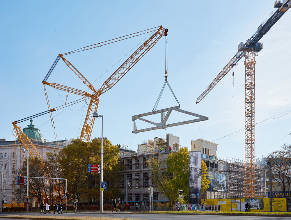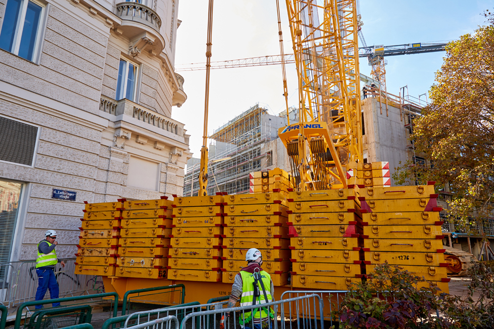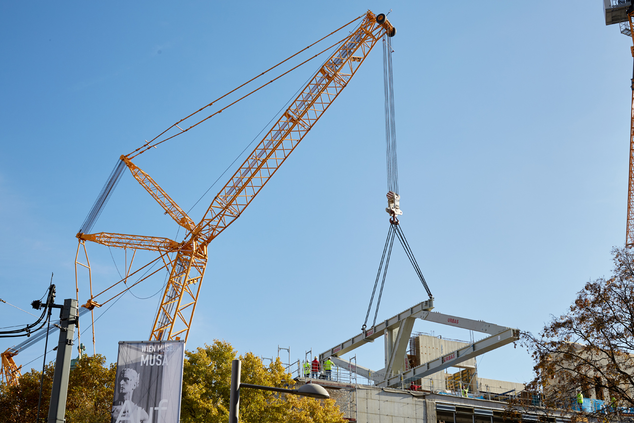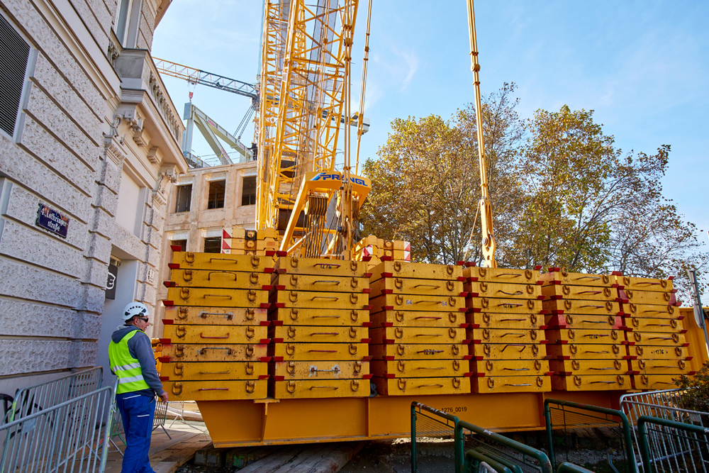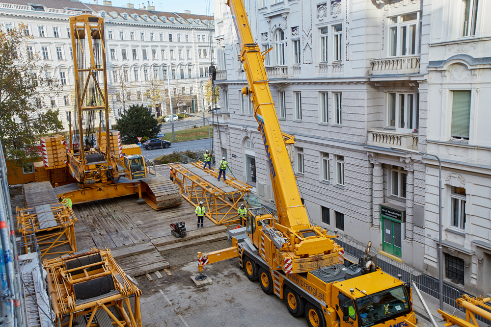 Prevoze težkega tovora do dunajskega trga Karlsplatz je vodilo osem spremljevalnih vozil. Na cilju je tovor prevzelo gosenično dvigalo nosilnosti 600 ton in s sistemsko dolžino 84 metrov. Nekatera predalčja smo dvignili neposredno, druga pa so prej še sestavili na tleh. Najtežji jekleni element je tehtal 165 ton. Da bi veliko dvigalo velikosti enodružinske hiše lahko namestili med stavbama mestnega jedra in v bližini jaška podzemne železnice, smo morali izvesti kar nekaj ukrepov, med drugim zaporo ceste in številne prepovedi zaustavljanja, upoštevati pa smo morali še oddaljenost od uličnih svetilk in premestiti kolesarsko stezo.