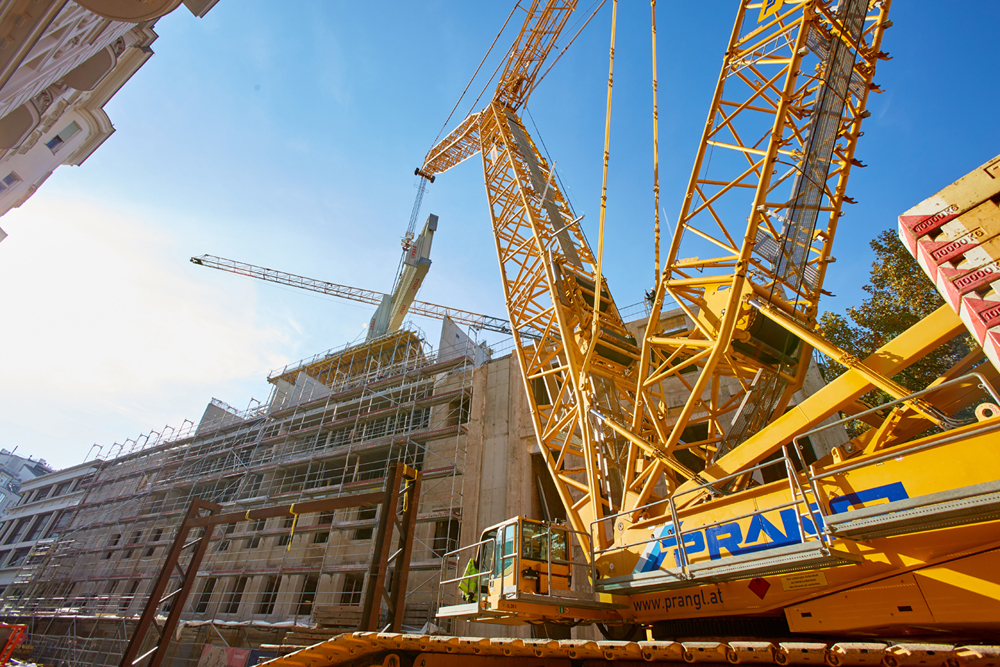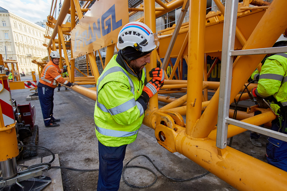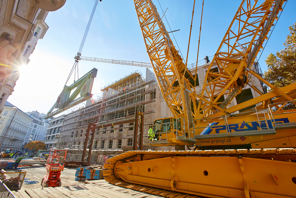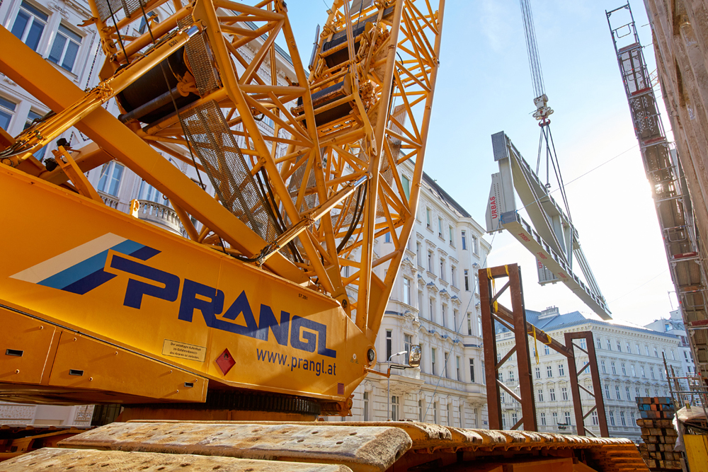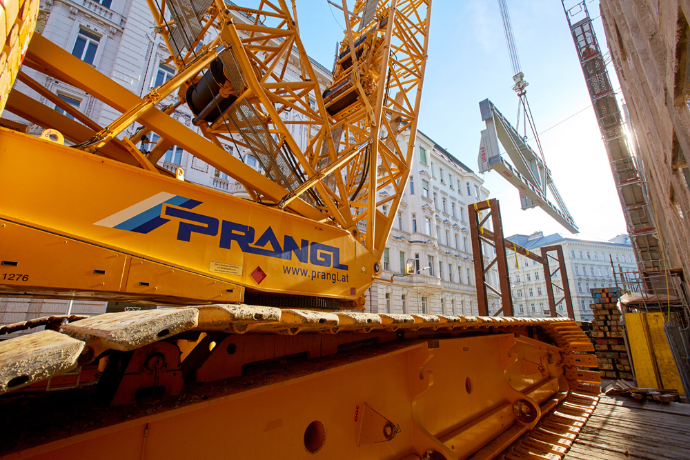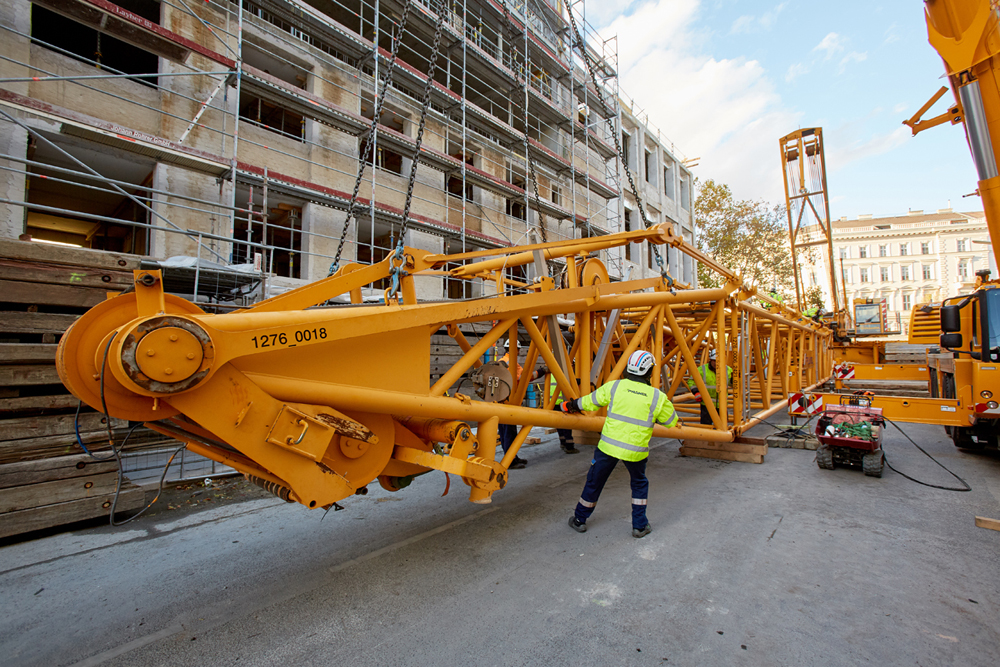 Postavljanje velikega dvigala je bilo časovno natančno določeno in je sledilo strogemu vrstnemu redu. Zaradi prostorske stiske je bilo treba vsa dela izvesti ravno ob pravem času. Bistveno je bilo tudi predvideno mesto postavitve za gosenično dvigalo. Vendarle je rumeni orjak tehtal 750 ton. Zato smo cesto zasuli in nato popolnoma obložili s podlogami za bagre iz trdega lesa. Kompleksna logistika dvigovanja je bila dopolnjena s teleskopskim dvigalom nosilnosti 500 ton, ki je za približno teden in pol nadomestilo gosenično dvigalo. S sistemsko dolžino 79,2 metra je na dveh različnih mestih uspešno opravilo zadnje dvige. Zaradi zelo dobrega sodelovanja vseh sodelujočih že pred začetkom del je ta edinstveni projekt bil uspešno zaključen.