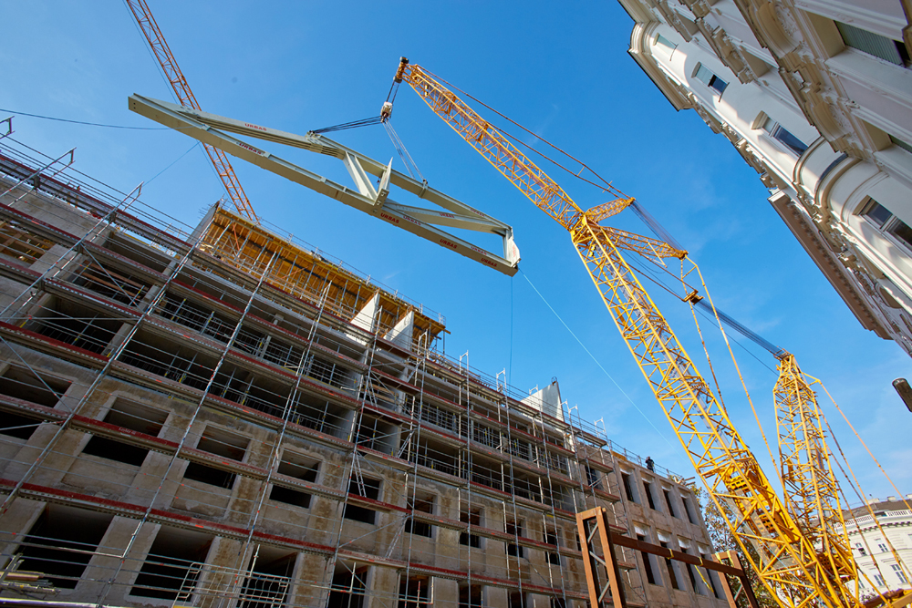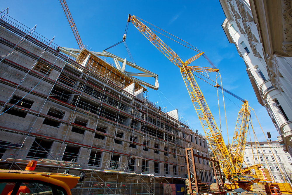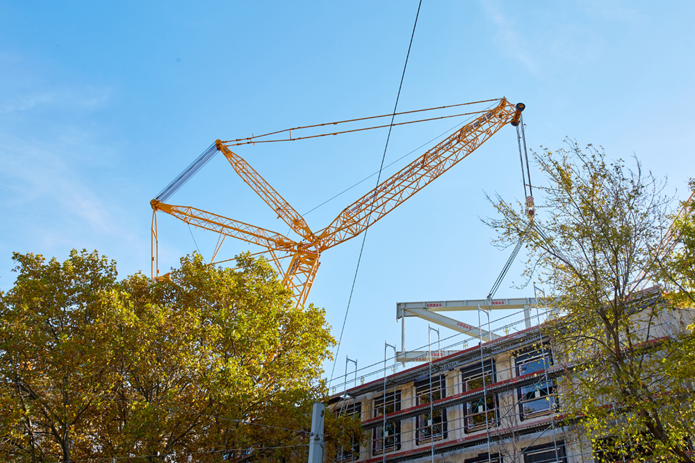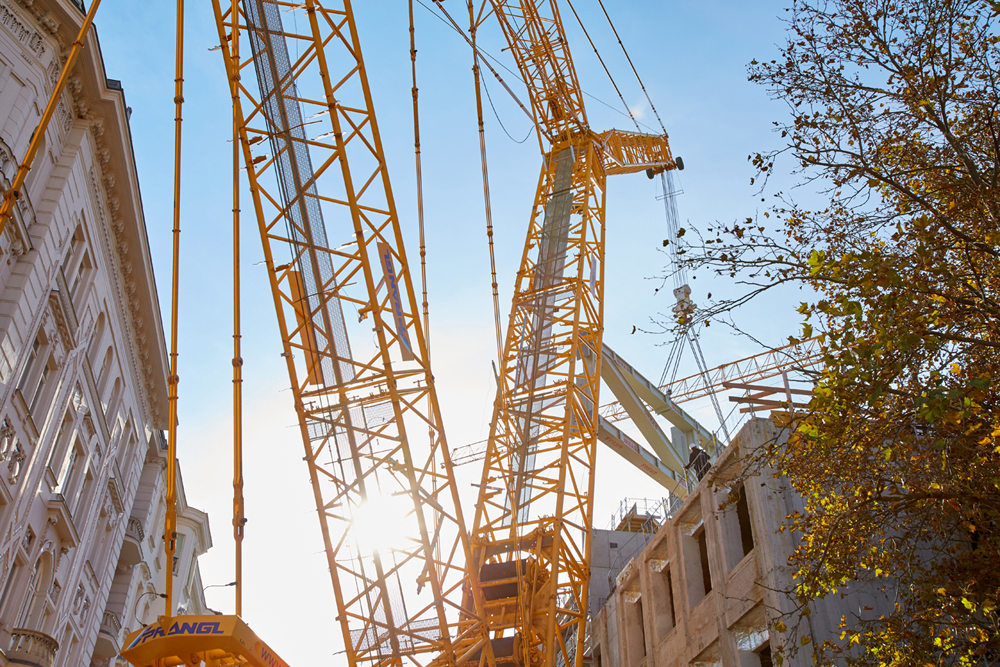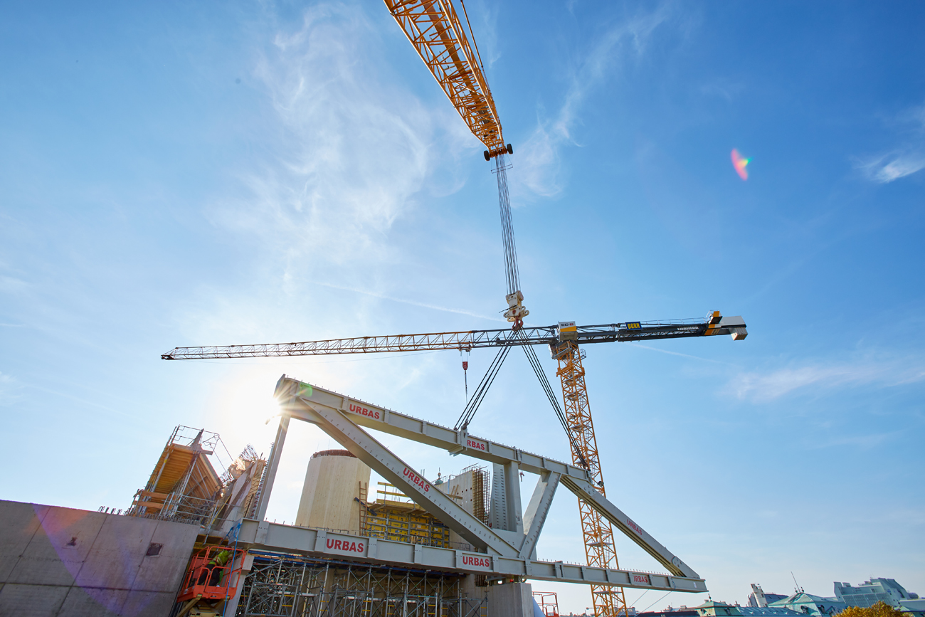 Postavljanje velikega dvigala je bilo časovno natančno določeno in je sledilo strogemu vrstnemu redu. Zaradi prostorske stiske je bilo treba vsa dela izvesti ravno ob pravem času. Bistveno je bilo tudi predvideno mesto postavitve za gosenično dvigalo. Vendarle je rumeni orjak tehtal 750 ton. Zato smo cesto zasuli in nato popolnoma obložili s podlogami za bagre iz trdega lesa. Kompleksna logistika dvigovanja je bila dopolnjena s teleskopskim dvigalom nosilnosti 500 ton, ki je za približno teden in pol nadomestilo gosenično dvigalo. S sistemsko dolžino 79,2 metra je na dveh različnih mestih uspešno opravilo zadnje dvige. Zaradi zelo dobrega sodelovanja vseh sodelujočih že pred začetkom del je ta edinstveni projekt bil uspešno zaključen.