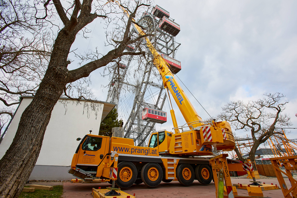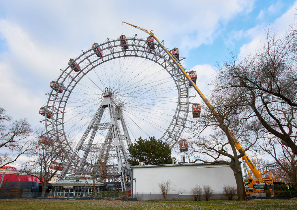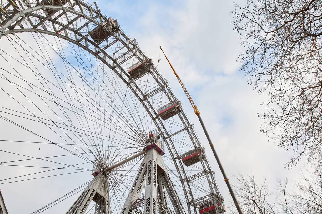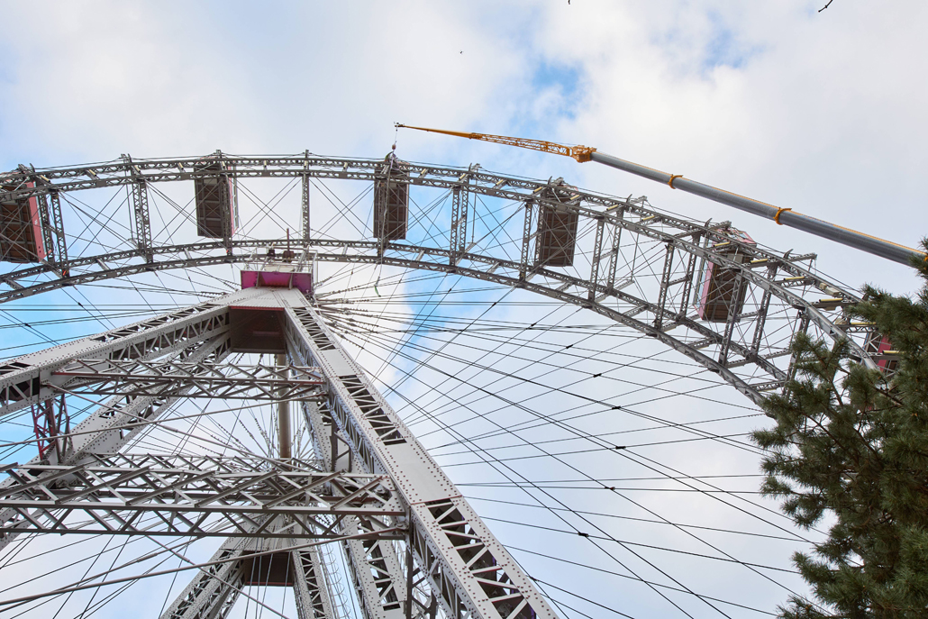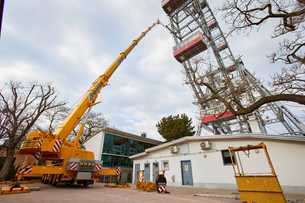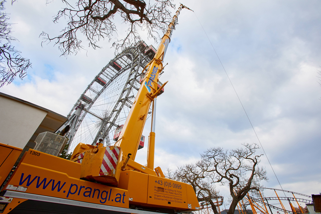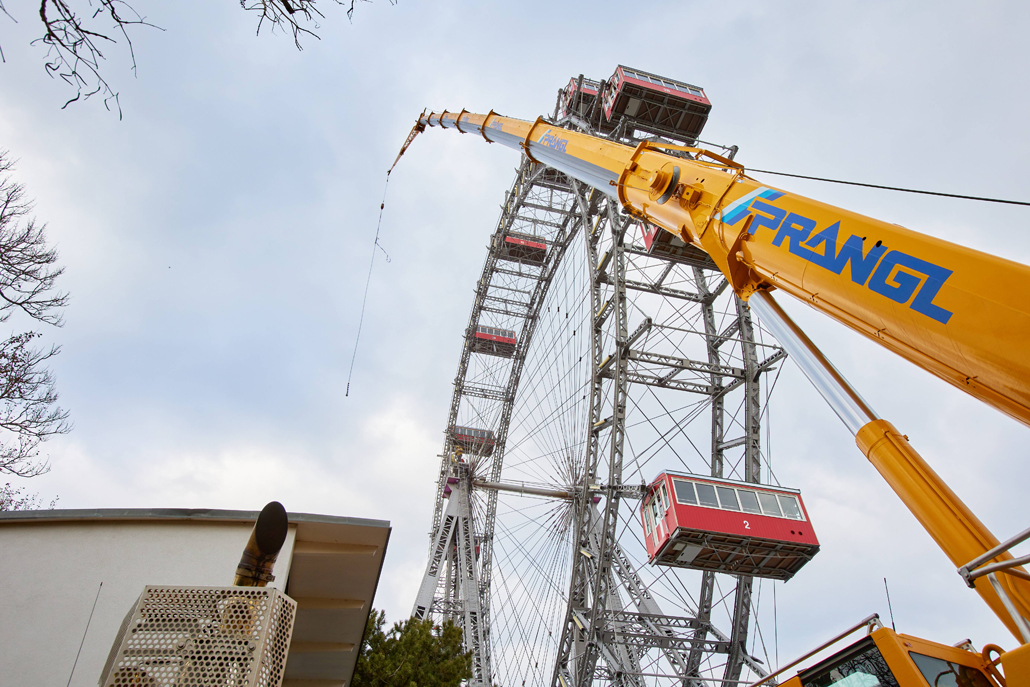 120 naper daje panoramskemu kolesu, ki je bilo postavljeno ob praznovanju 50. obletnice vladavine cesarja Franca Jožefa I. ob koncu 19. stoletja, potrebno stabilnost. Glede na obrabo se te pomembne vrvi obnavljajo. Pri tem kočljivem delu na velikih višinah smo delavcem priskočili na pomoč in nudili podporo s Pranglovim 100 tonskim teleskopskim dvigalom na 4 osi. Prav zaradi obstoječega dovoza je bila zahtevana kompaktnost tega dvigala. Samo s "majšim" dvigalom je bilo mogoče zavzeti potreben položaj.