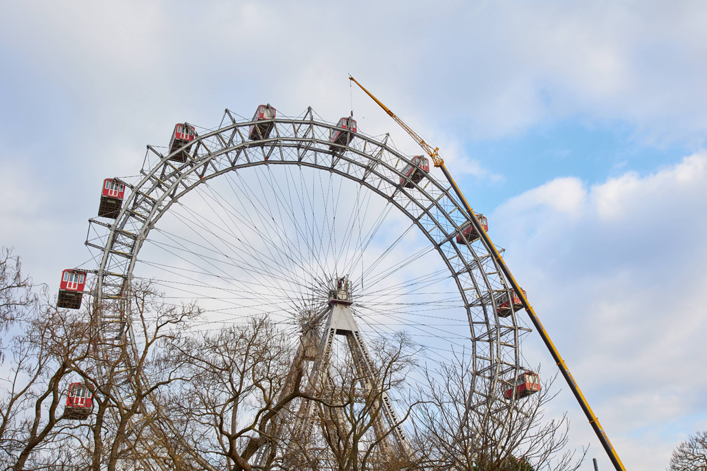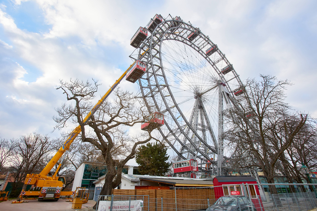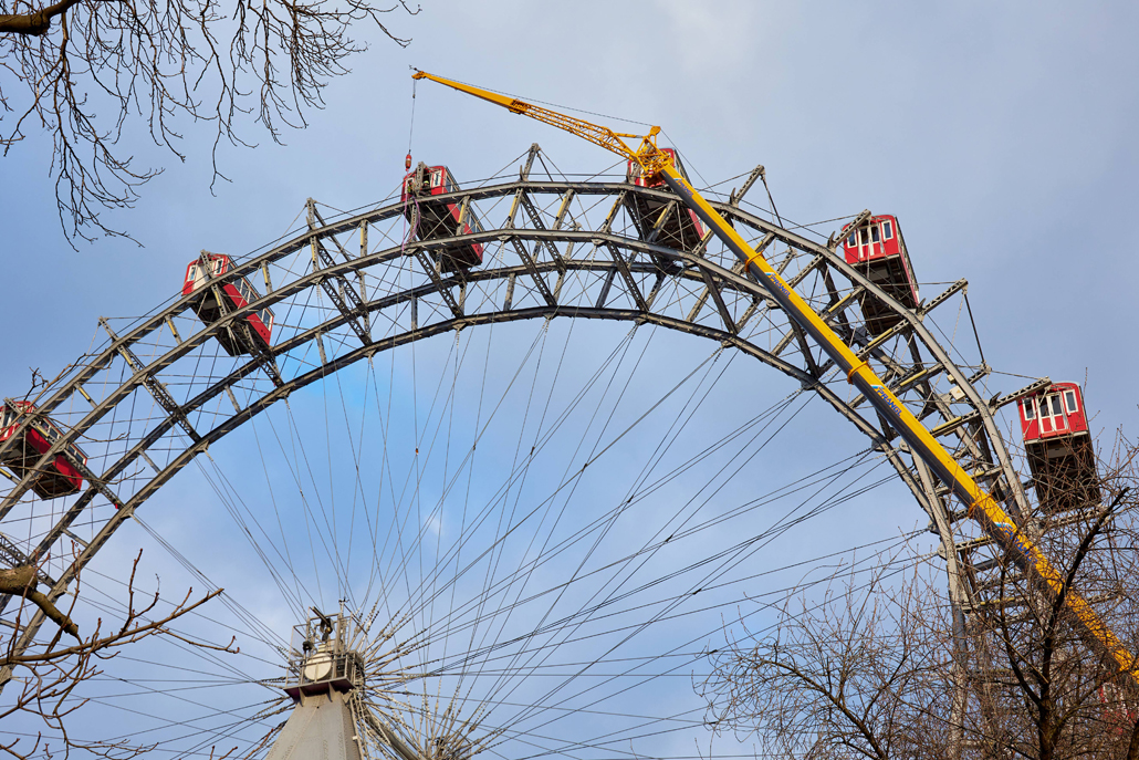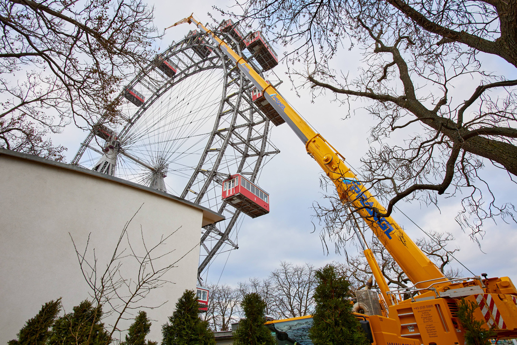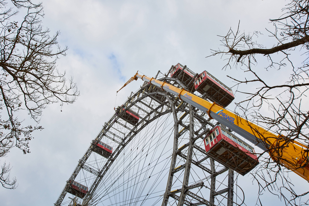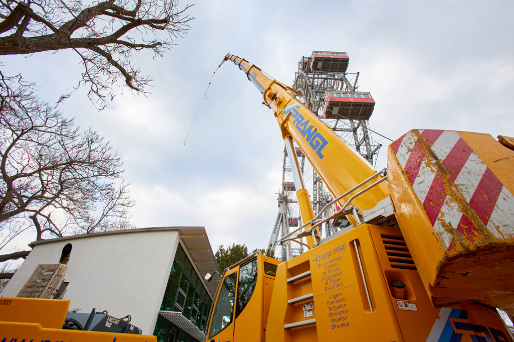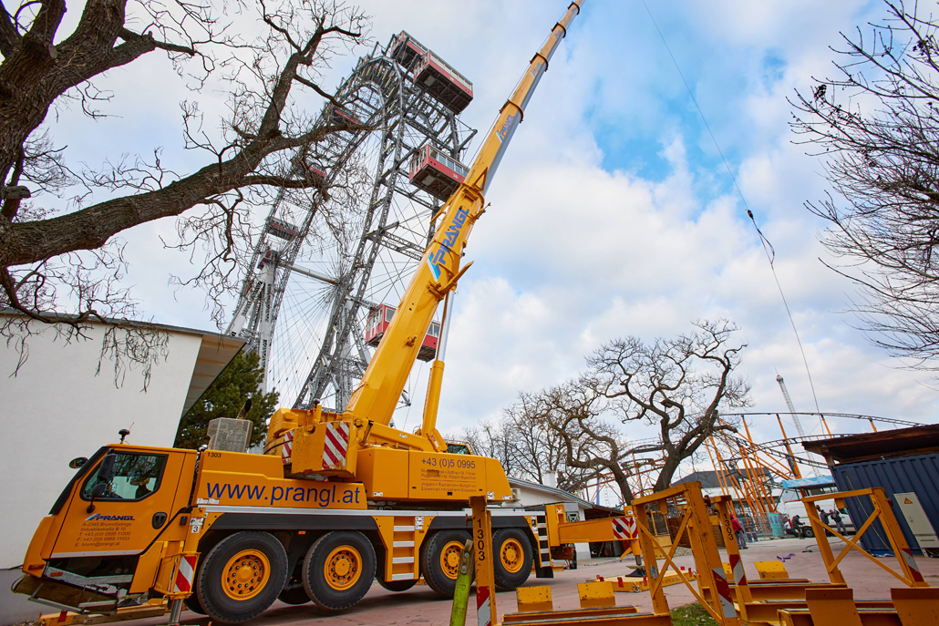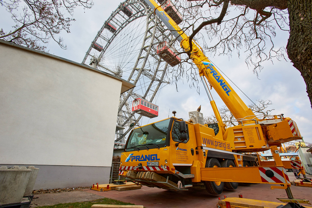 120 naper daje panoramskemu kolesu, ki je bilo postavljeno ob praznovanju 50. obletnice vladavine cesarja Franca Jožefa I. ob koncu 19. stoletja, potrebno stabilnost. Glede na obrabo se te pomembne vrvi obnavljajo. Pri tem kočljivem delu na velikih višinah smo delavcem priskočili na pomoč in nudili podporo s Pranglovim 100 tonskim teleskopskim dvigalom na 4 osi. Prav zaradi obstoječega dovoza je bila zahtevana kompaktnost tega dvigala. Samo s "majšim" dvigalom je bilo mogoče zavzeti potreben položaj.