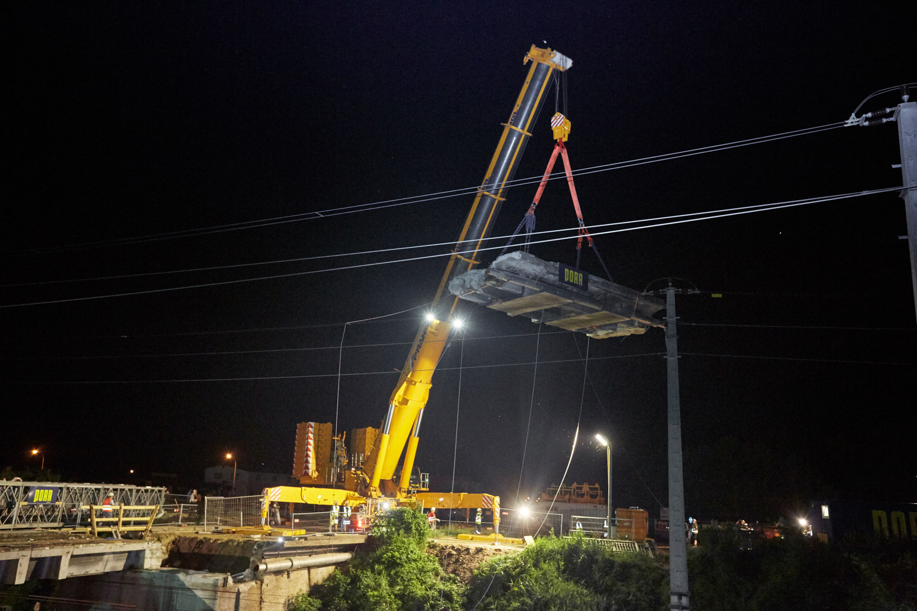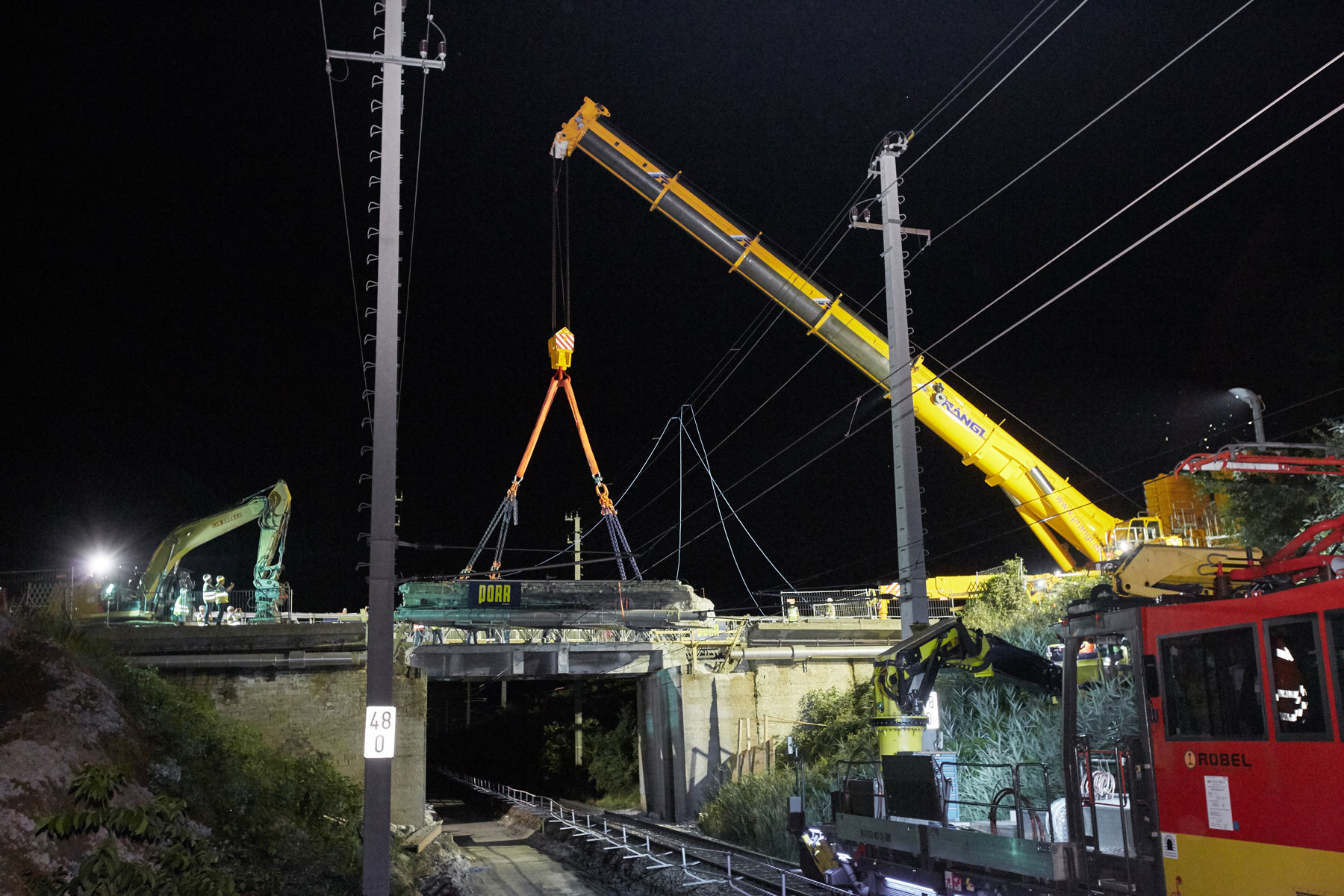 Ker so deli mosta tehtali tudi po 95 t, je bilo, zaradi svojega 22-metrskega dosega, najmočnejše teleskopsko dvigalo v Avstriji – 1000-tonec – najboljša rešitev za to nalogo. Vsakršna druga dvigala bi zahtevala več časa za postavitev oz. pripravo za delo. Ker je ÖBB podala strog časovni načrt, je bila vsaka minuta ogromna pridobitev. Delo je moralo v celoti potekati med 22. in 5. uro. Samo v tem času je bila proga zaprta in vso zadevno energijsko napajanje ustavljeno.
