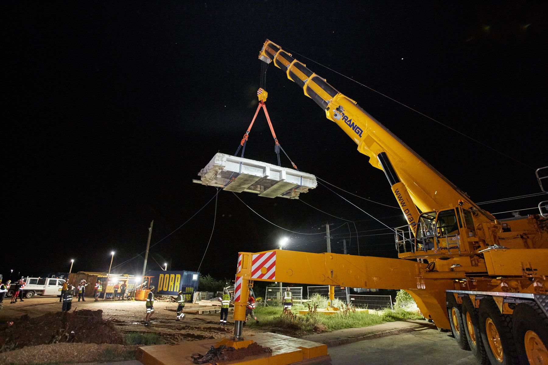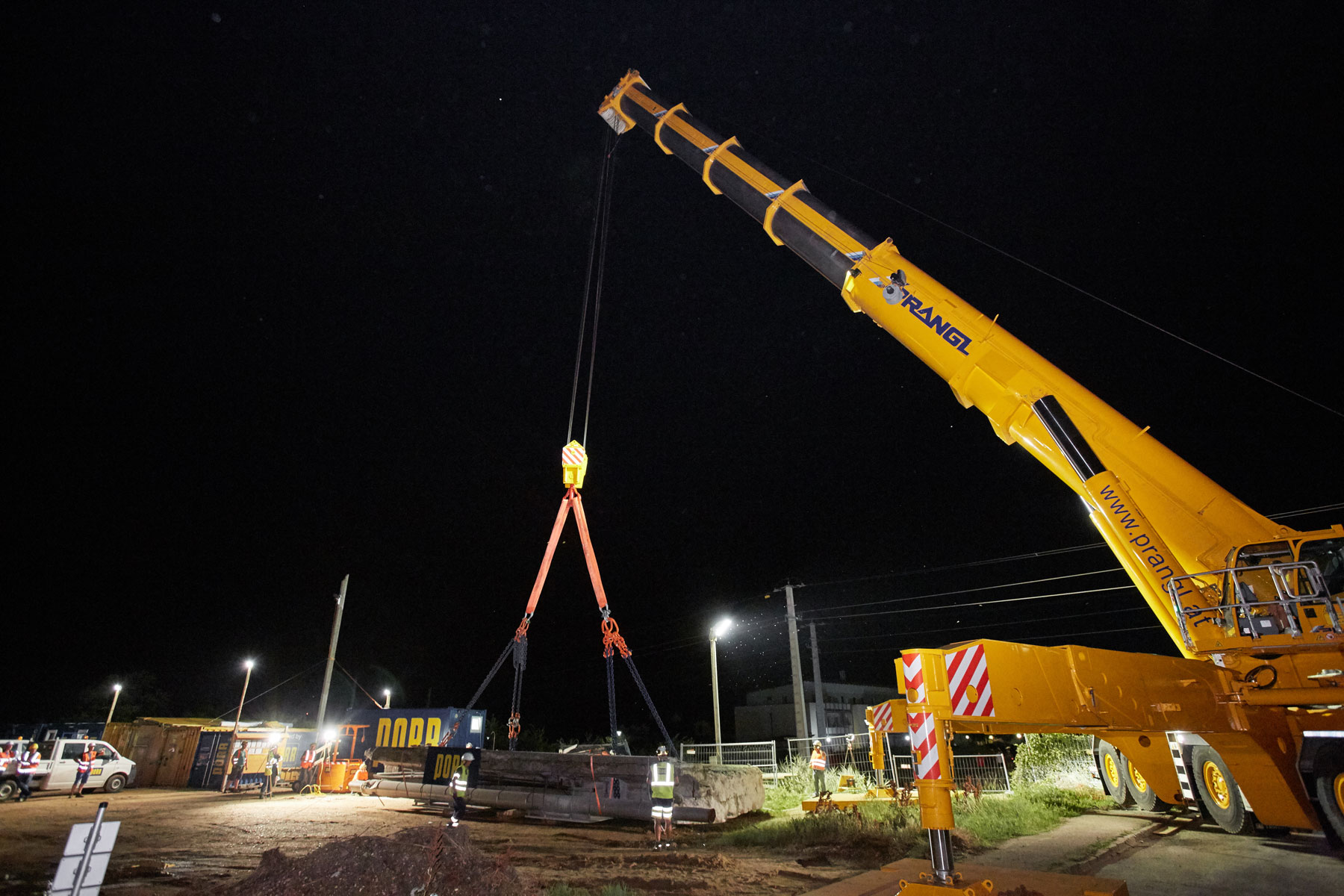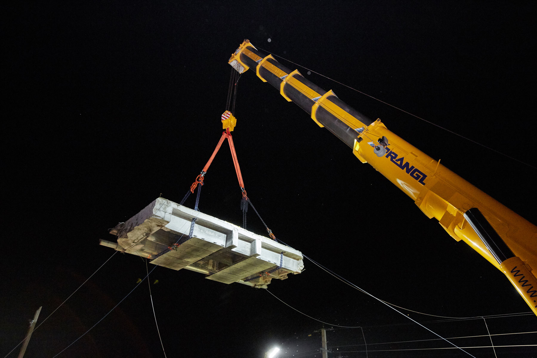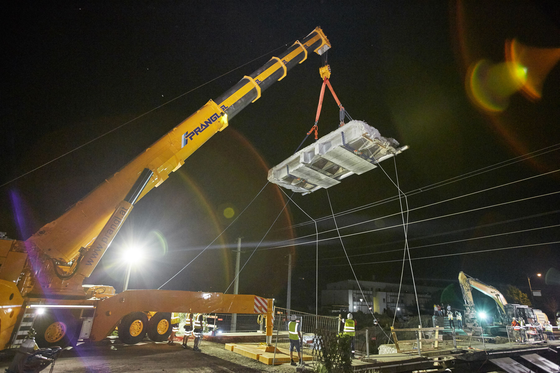 Skupaj z 228-tonskimi protiutežmi je veliko dvigalo tehtalo 336 t. Zato smo morali poiskati ustrezen prostor za postavitev tega težkokategornika. S tehničnim znanjem Pranglove ekipe nam je uspelo najti stojno površino, ki ni zahtevala dodatnih priprav. To je stranki omogočilo znaten prihranek stroškov in težav. Dele mosta je družba Prangl odložila neposredno zraven gradbišča, od koder jih je, ustrezno razkosane, skladno z zakonom odstranilo specializirano podjetje. Celotni postopek dviga smo izvedli v dogovorjenem času in v zadovoljstvo vseh udeleženih.