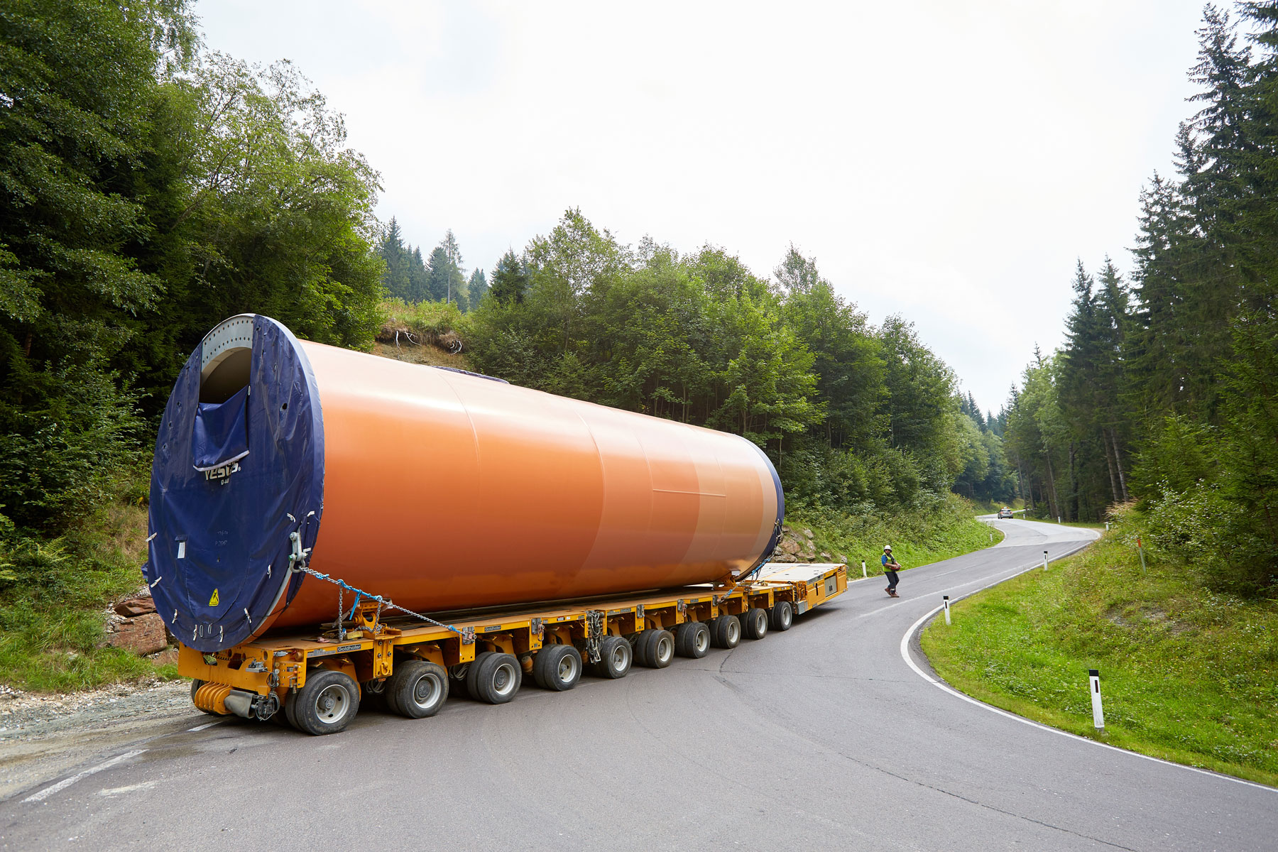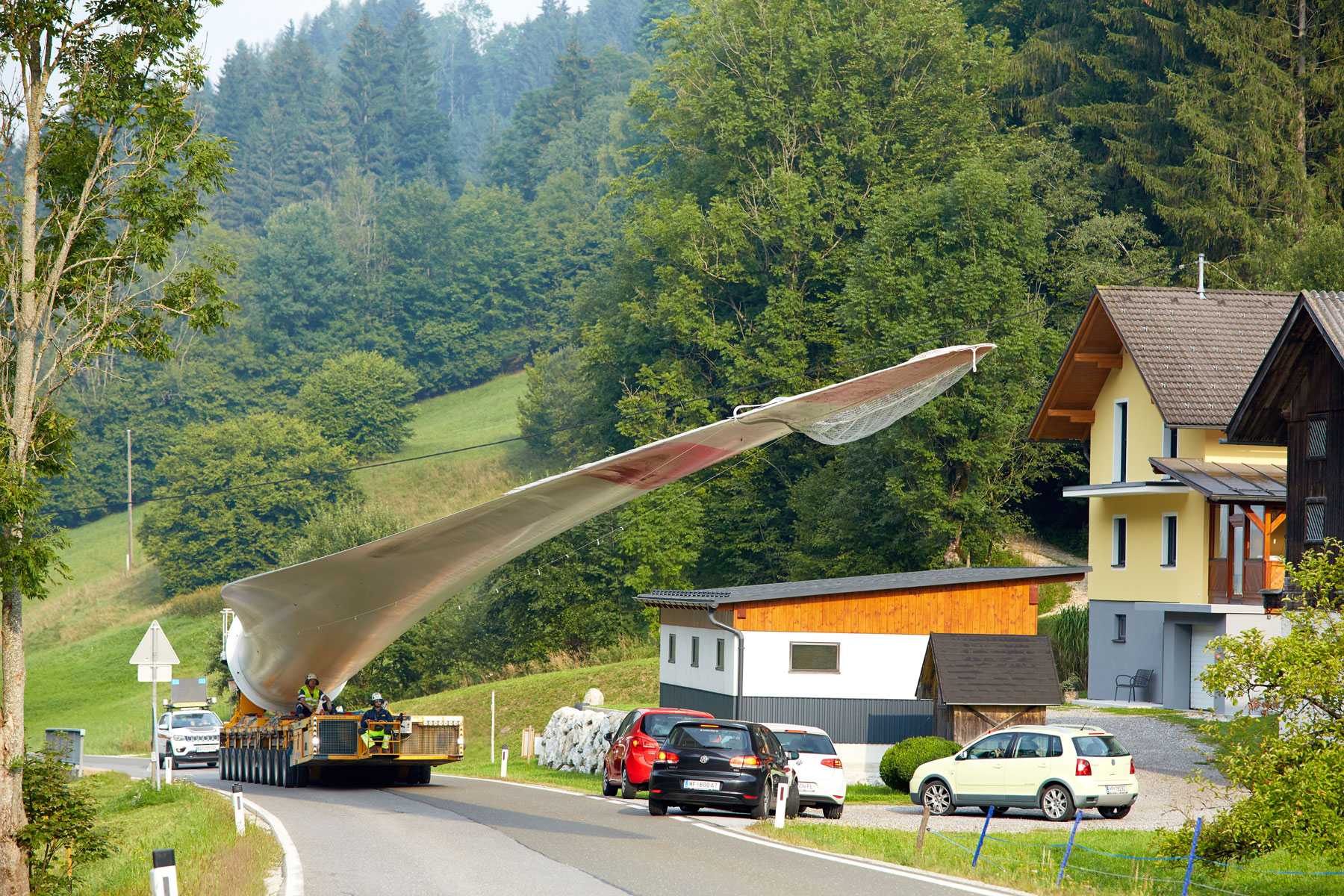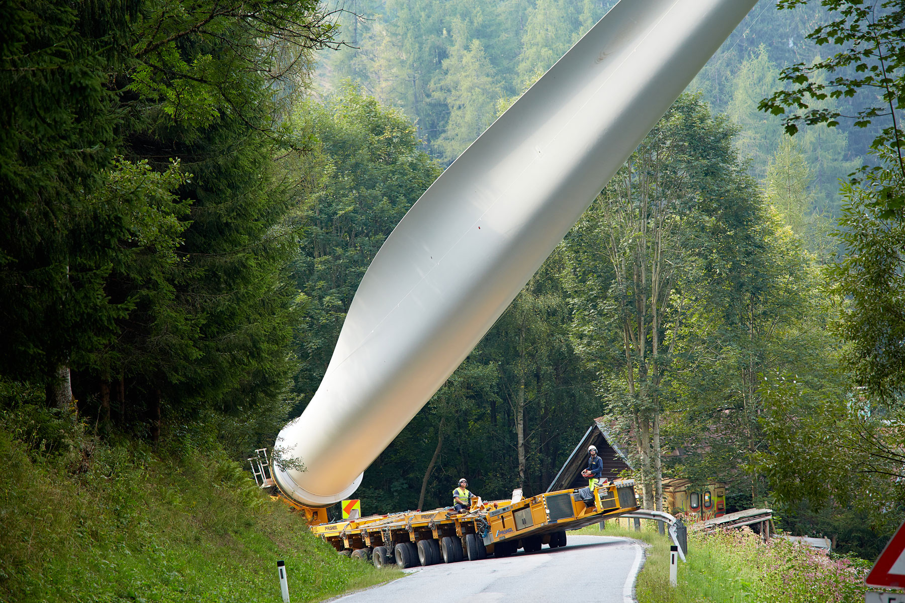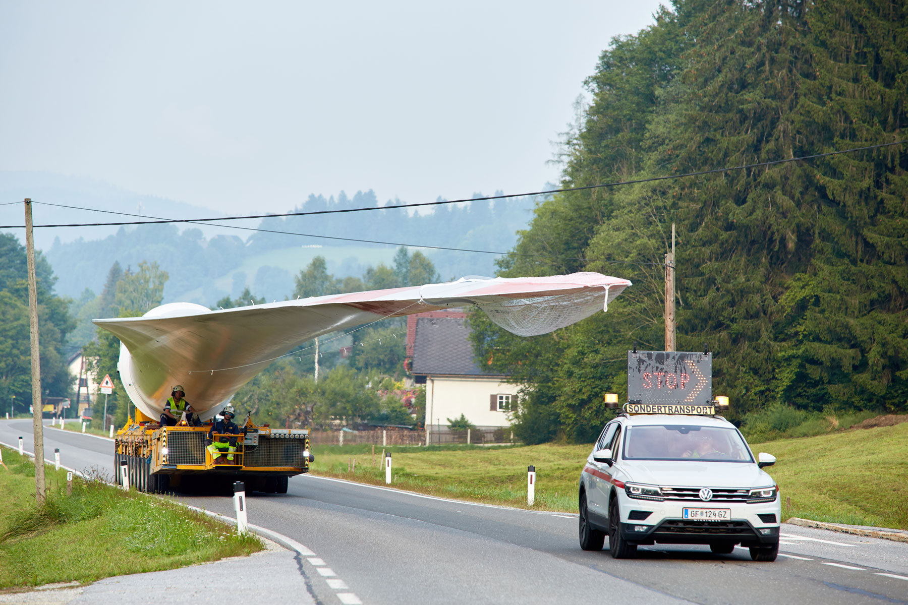 S transporterji težkih tovorov smo strojna ohišja (posamična teža 65 t), pesta (posamična teža 31,5 t), pogonske sklope (posamična teža 61 t) in lopatice vetrnih turbin (posamična teža 14,7 t) prepeljali z Danske v Avstrijo. Stebrni segmenti so prispeli iz Nemčije. Najtežje in največje kose je bilo treba prepeljati z rečno ladjo. Po pretovarjanju v pristanišču v Ennsu, kar je prav tako izvedla družba Prangl, so bili najtežji jekleni deli z maso do 87 t pripravljeni za nadaljnji prevoz. Jekleni segmenti so merili v dolžino do 30 m.