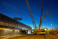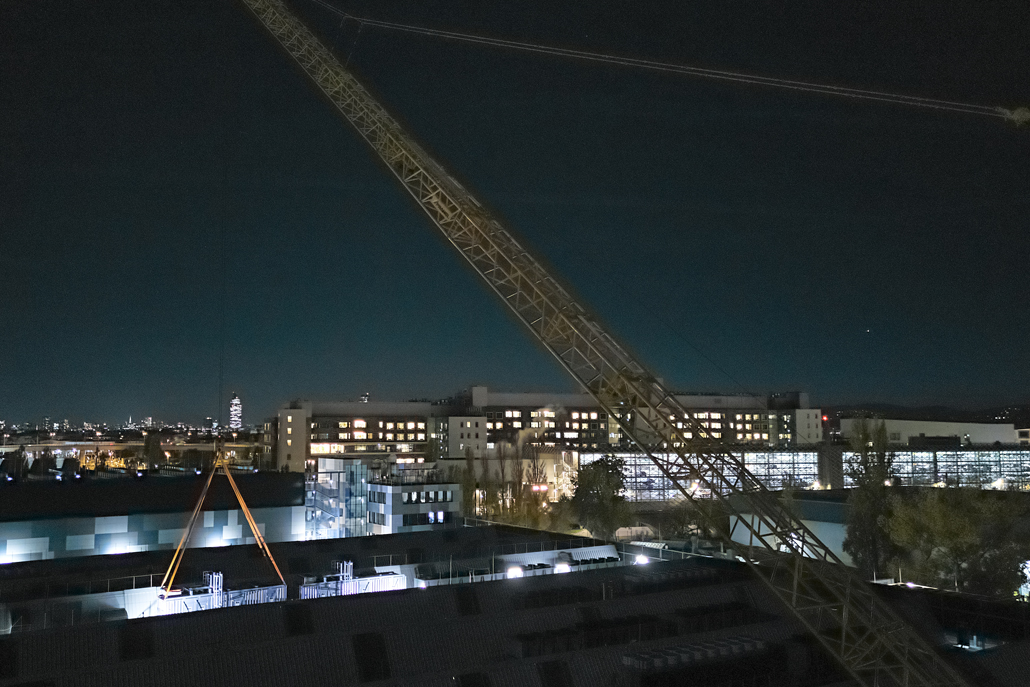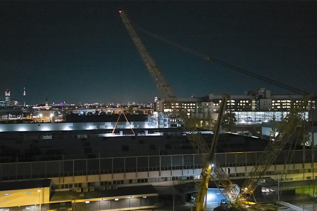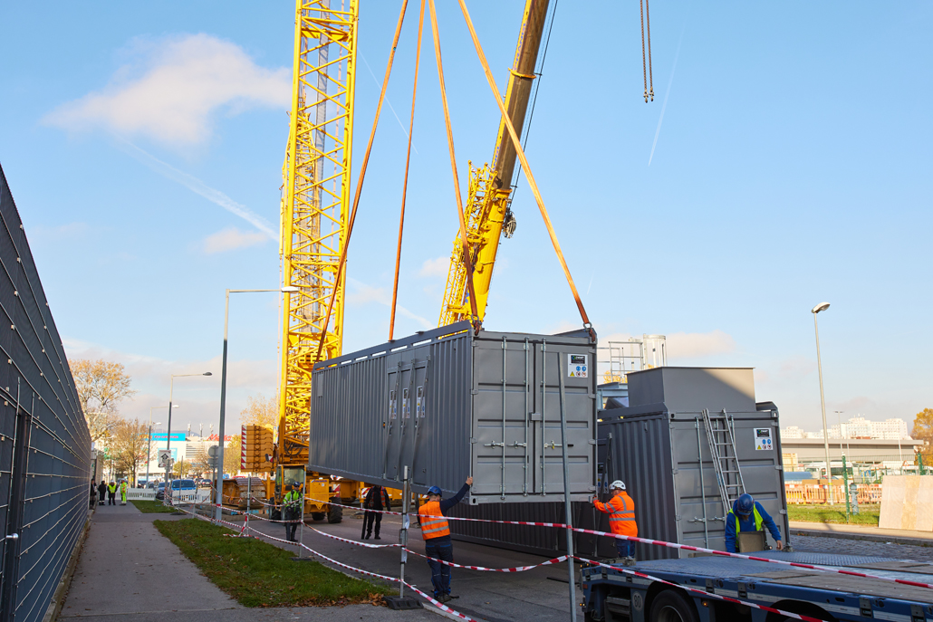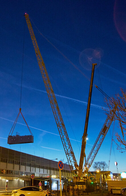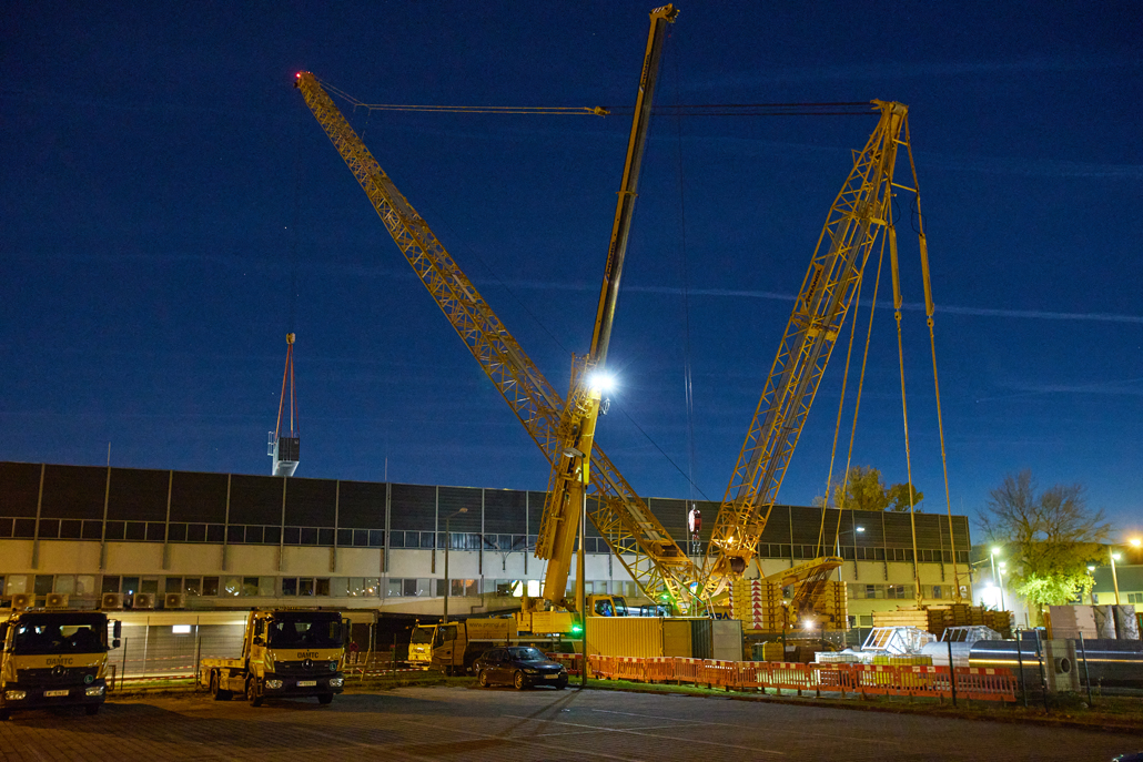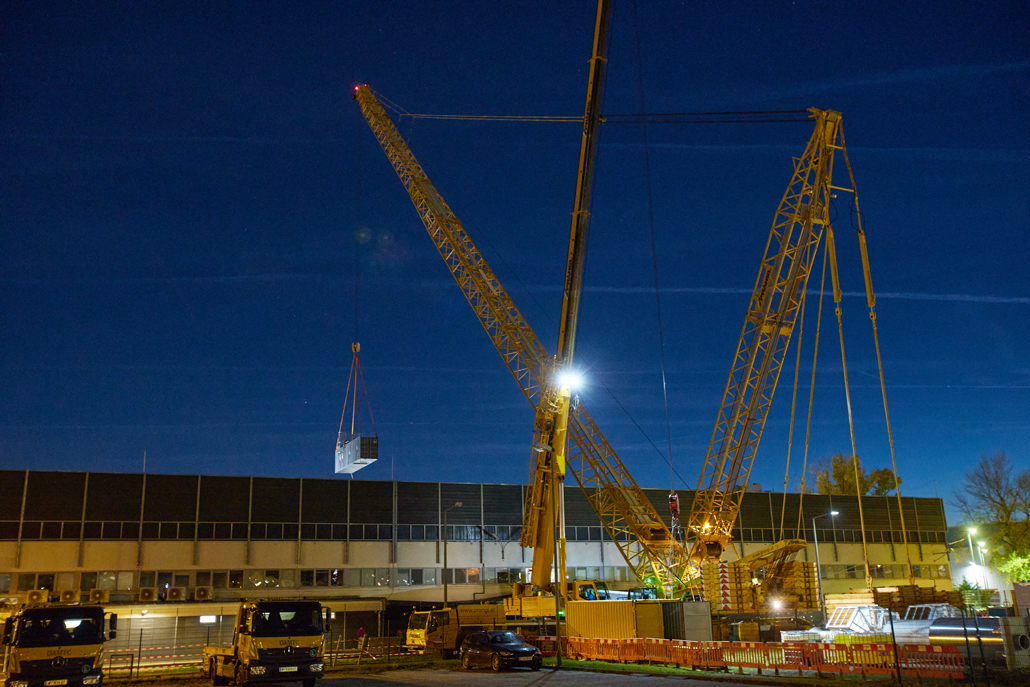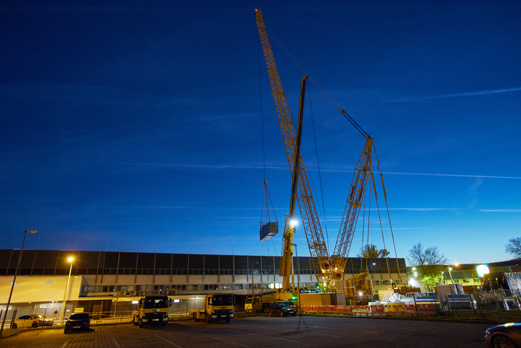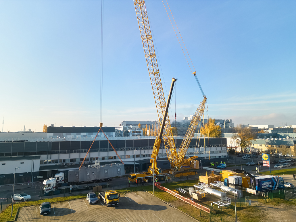 Od samega začetka je bilo jasno, da je bilo treba dele agregatov za zasilno napajanje – vsak sestavljen iz Genset-kontejnerja, suhega hladilnika (Dry-Cooler), ventilacijske enote in dimnika – dvigniti od zunaj stavbe skozi odprto streho. Medtem ko podatkovni center sam razpolaga z obsežnimi površinami, so bili pogoji zunaj na javnem prostoru omejeni. Natančno načrtovanje se je obrestovalo in našla se je rešitev. Gosenično dvigalo s kapaciteto 400 ton je bilo postavljeno na primerno mesto in dela so se lahko začela. Najtežje dele za dvig sta predstavljala oba Genset-kontejnerja.