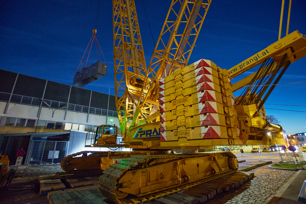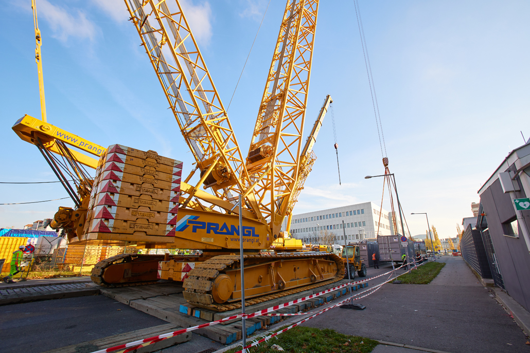 Za vgradnjo posameznih delov je ekipa Prangl izbrala gosenično dvigalo. To dvigalo z maksimalno sistemsko dolžino 168 metrov lahko prenese do 400 ton. Poleg tega je zaradi svojega goseničnega pogona posebej prilagodljivo in lahko – po potrebi – premika tudi z obremenitvijo. Za postavitev PRK 400 je bilo uporabljeno 100-tonsko teleskopsko dvigalo. Za pomožne naloge je bil na lokaciji dodatno na voljo teleskopski viličar z maksimalno višino dviga 9,55 metra, nosilnostjo 7,20 ton in maksimalnim dosegom 5,50 metra.