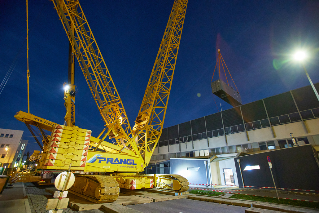 Danes je izjemno pomembno, da so podatki shranjeni zanesljivo. V 21. okrožju Dunaja se nahaja podatkovni center, ki zagotavlja 99,999-odstotno zanesljivost. Za resnično zagotavljanje tega so potrebni različni varnostni sistemi, med drugim tudi agregati za zasilno napajanje, ki v primeru izrednih razmer zagotavljajo nujno električno energijo. Nedavno sta bila kupljena dva nova agregata za zasilno napajanje, ki jih je podjetje Prangl vneslo v obsežen kompleks stavb.