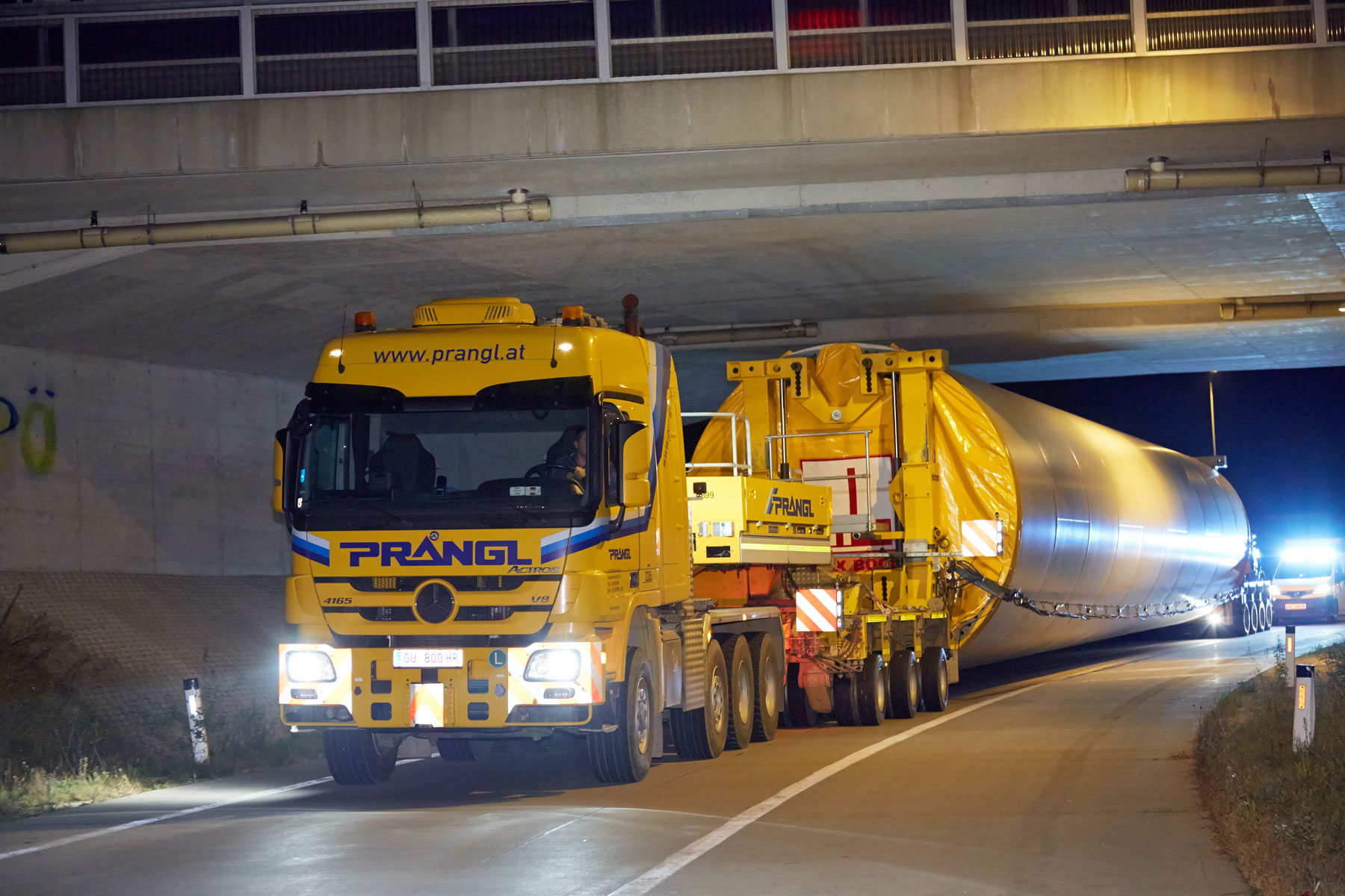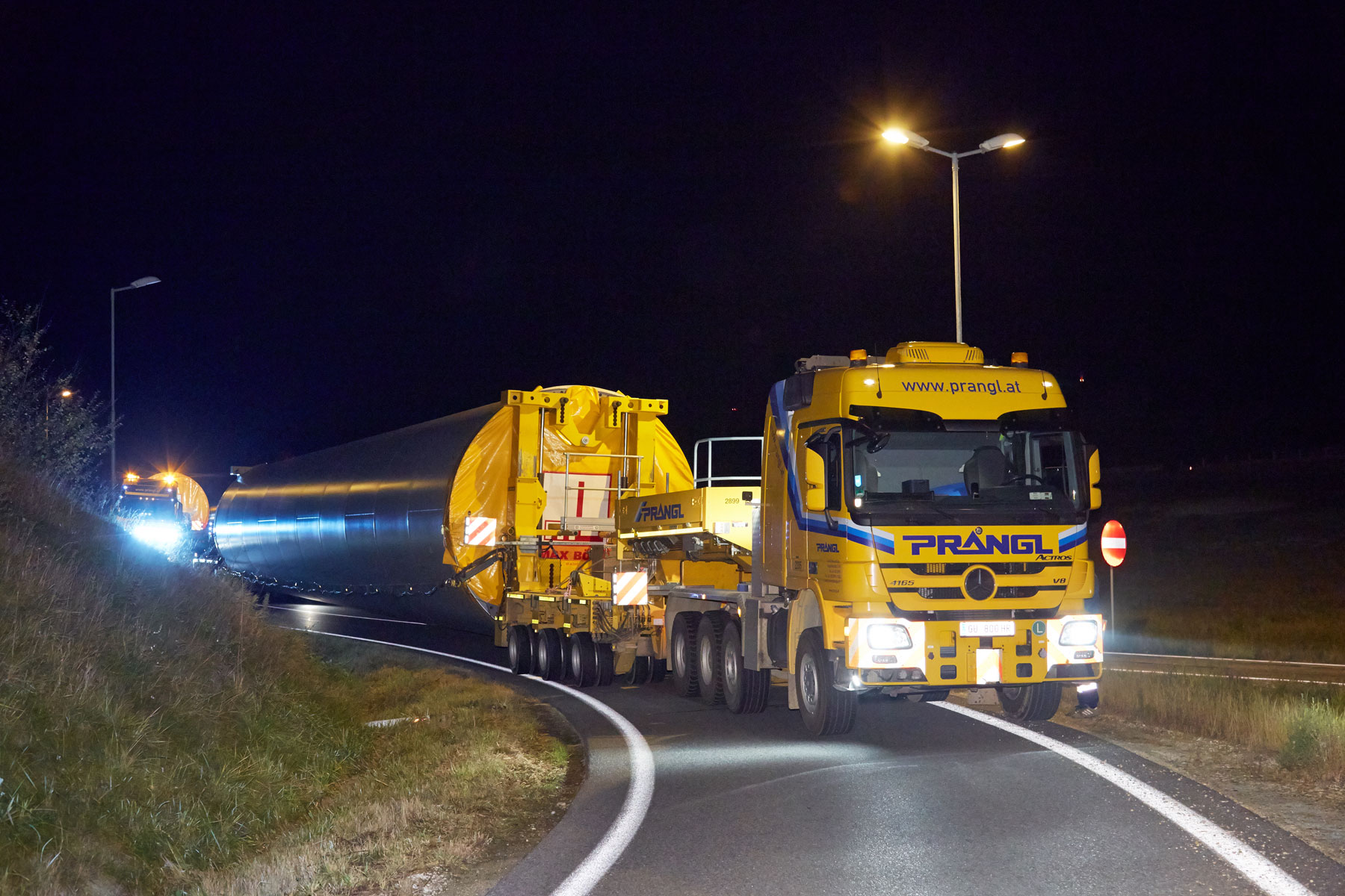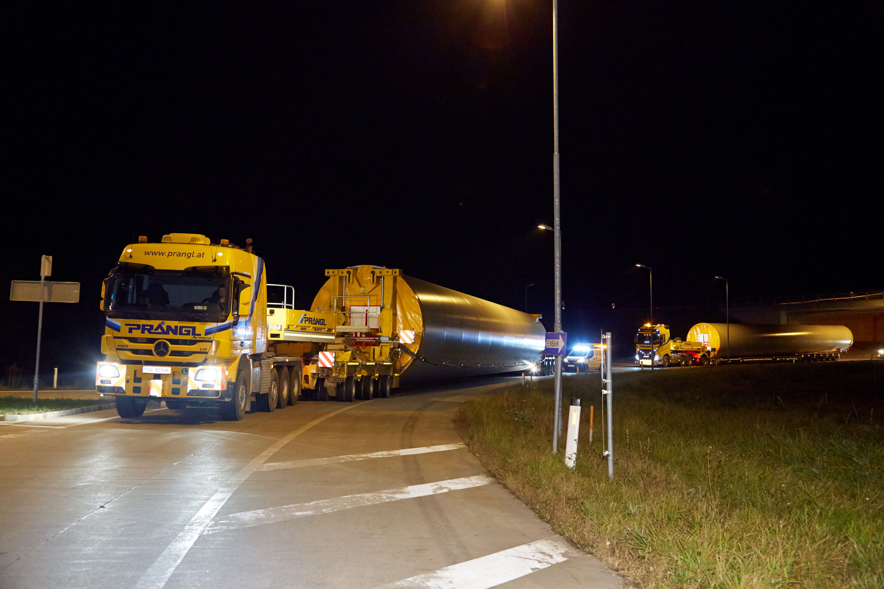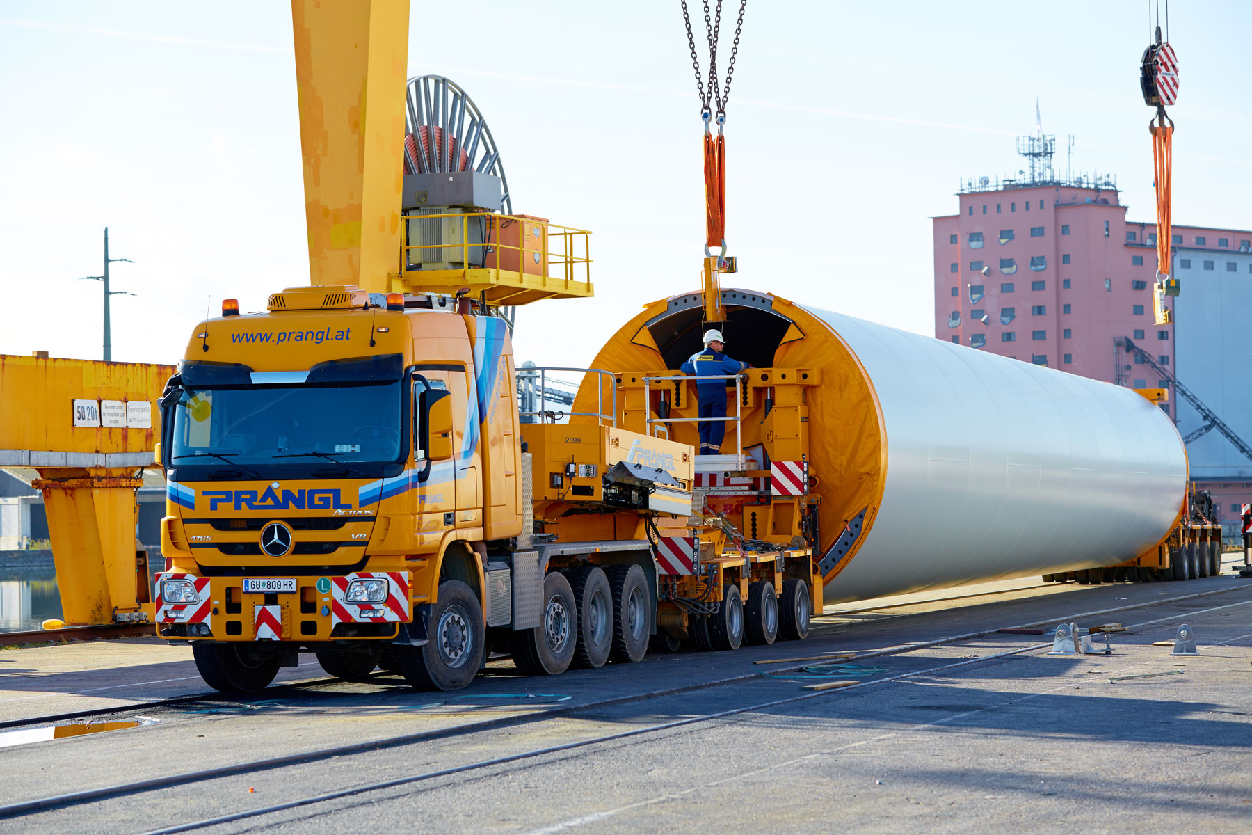 Zaradi gradbišča na prevozni poti iz Nemčije v Avstrijo je bilo treba 11 jeklenih segmentov stebrov vetrnih turbin prepeljati v Avstrijo z rečno ladjo. Skupaj z donavskim pristaniščem Krems smo izdelali ustrezen logistični koncept. S skupno 11 prevozi smo jeklene segmente po cesti prepeljali v vetrno elektrarno Paasdorf.