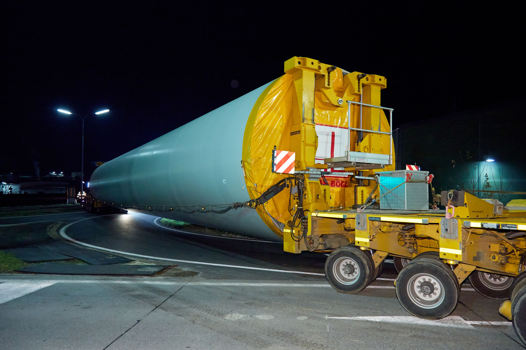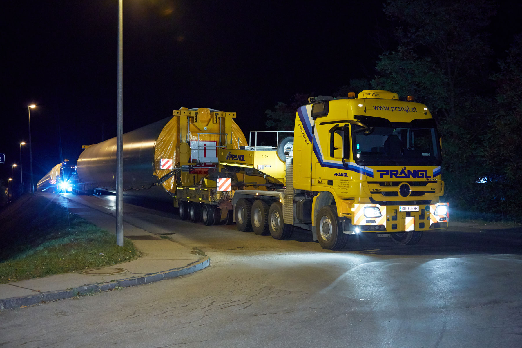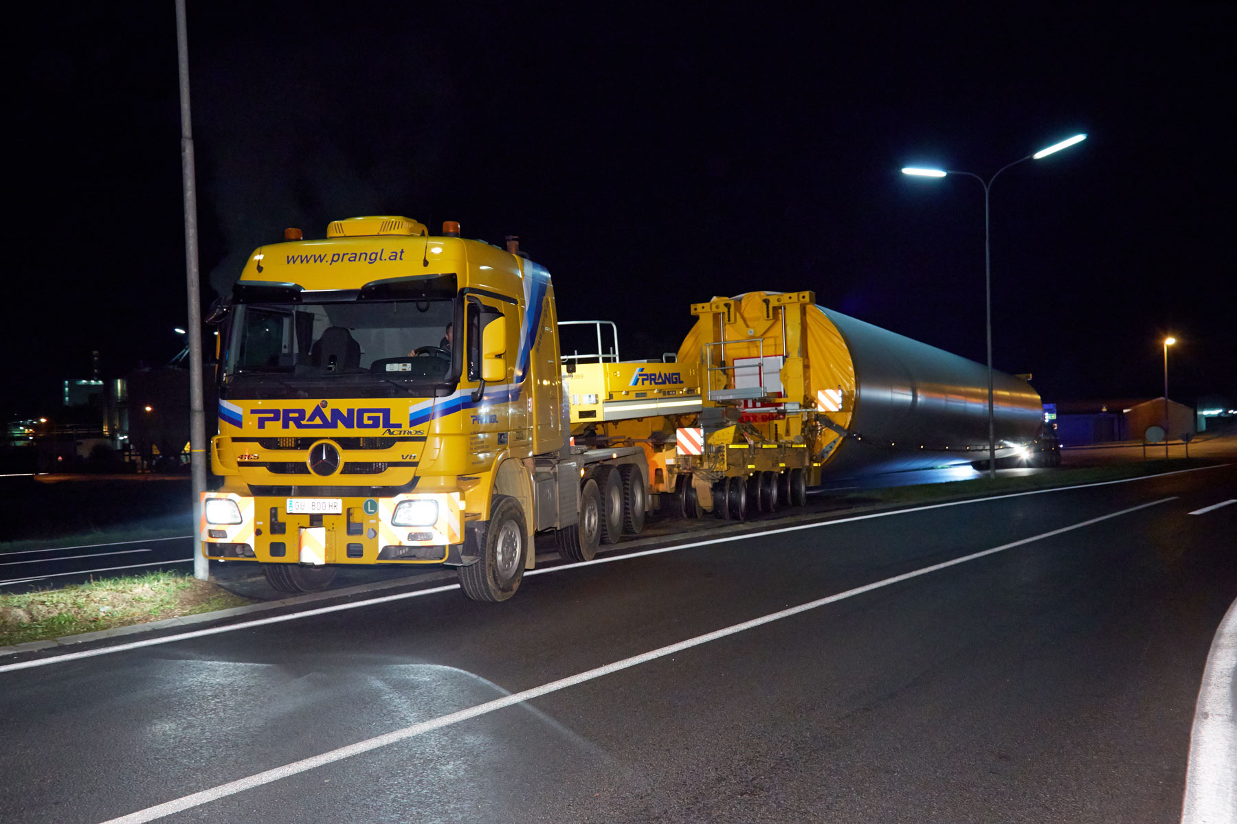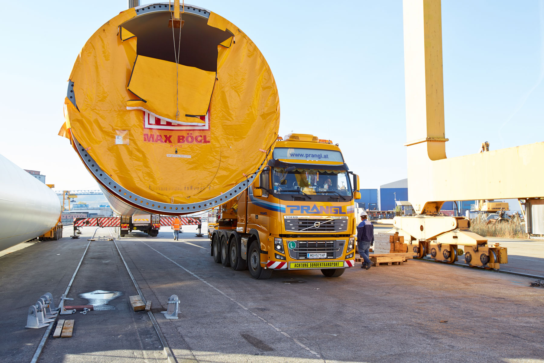 Zaradi gradbišča na prevozni poti iz Nemčije v Avstrijo je bilo treba 11 jeklenih segmentov stebrov vetrnih turbin prepeljati v Avstrijo z rečno ladjo. Skupaj z donavskim pristaniščem Krems smo izdelali ustrezen logistični koncept. S skupno 11 prevozi smo jeklene segmente po cesti prepeljali v vetrno elektrarno Paasdorf.