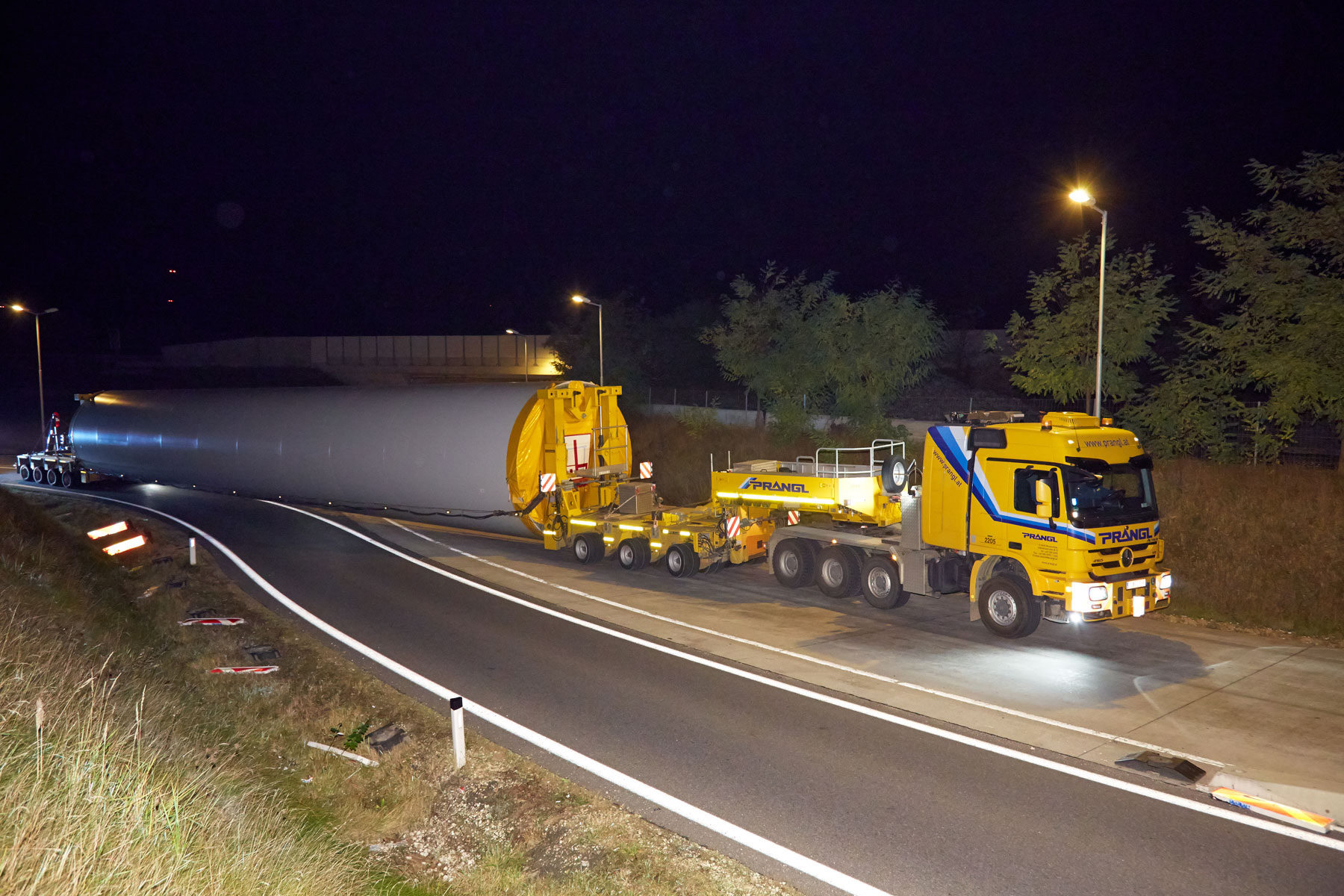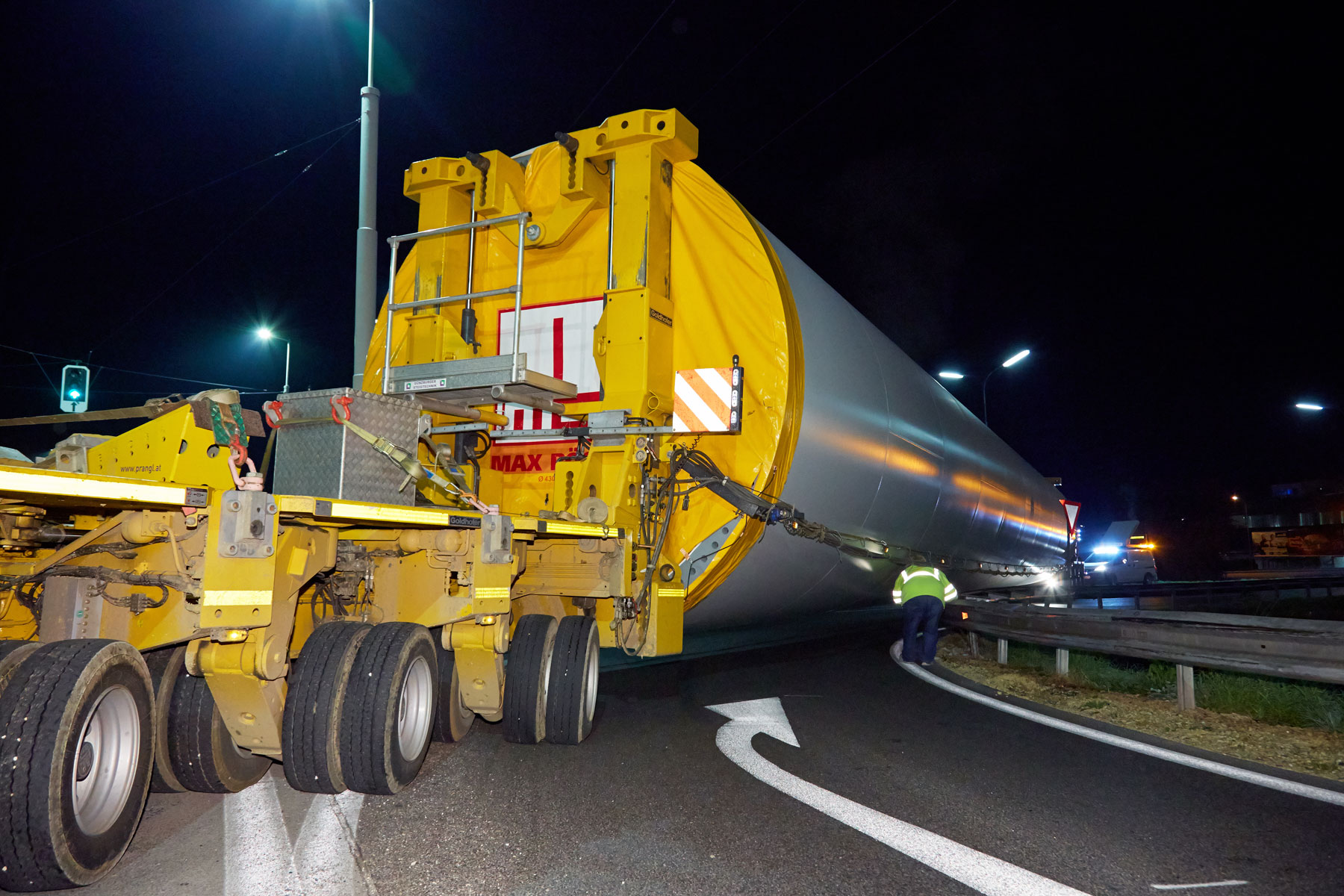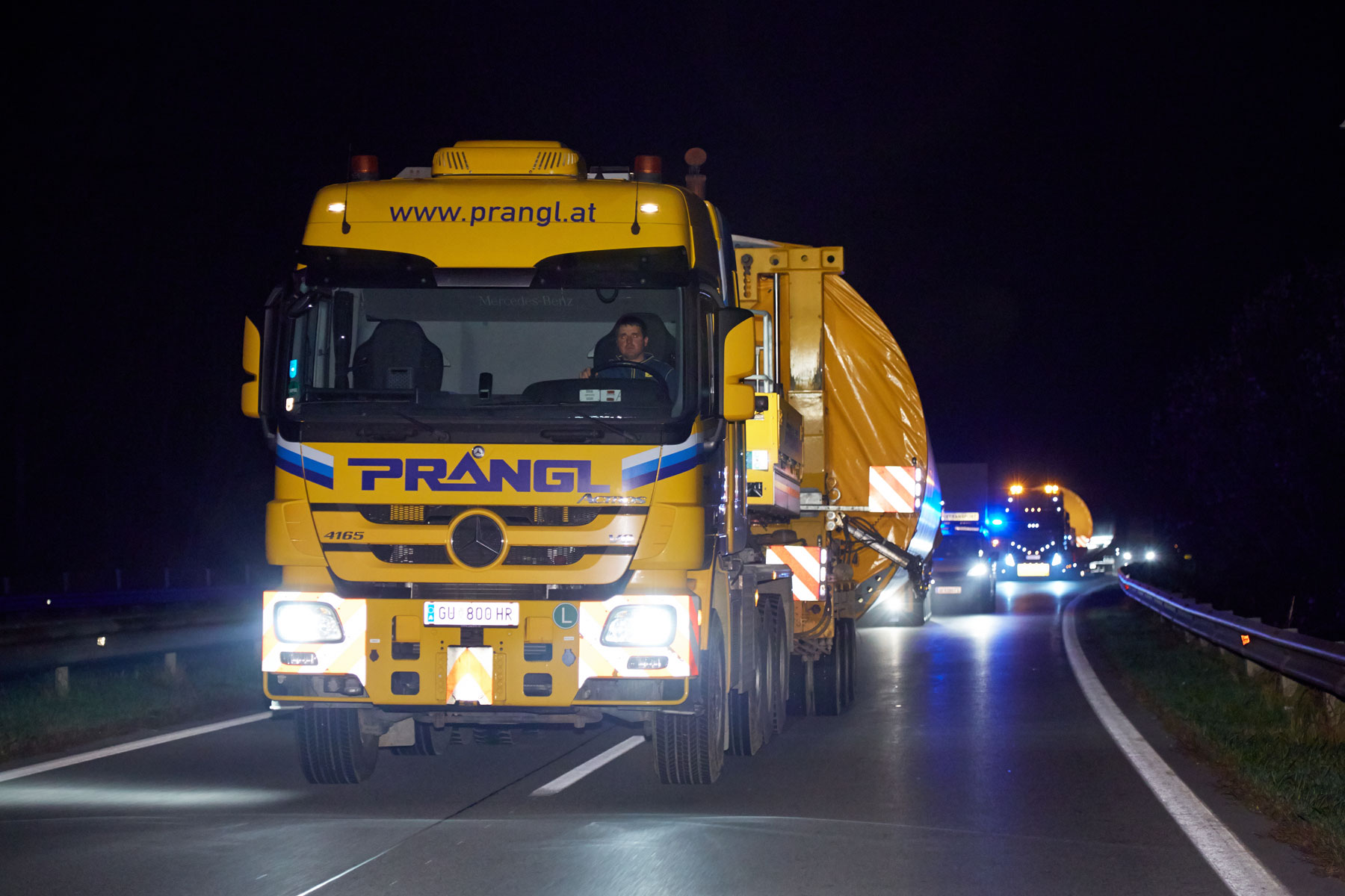 Po uspešnem razkladanju je bilo treba do 118 težke posebne prevoze varno spraviti na območje vetrne elektrarne. V nočnih urah so Pranglovi strokovnjaki to odlično izvedli, pri čemer so del poti prevozili po nasprotnem voznem pasu ceste S5. Za zadnji kos poti je prišla v poštev le vzvratna vožnja. Le tako smo lahko zagotovili optimalen položaj za naknadno postavitev vetrnih turbin.
