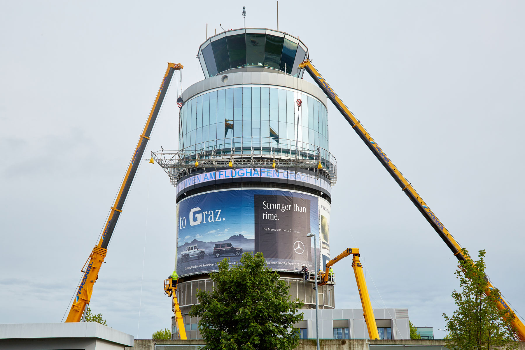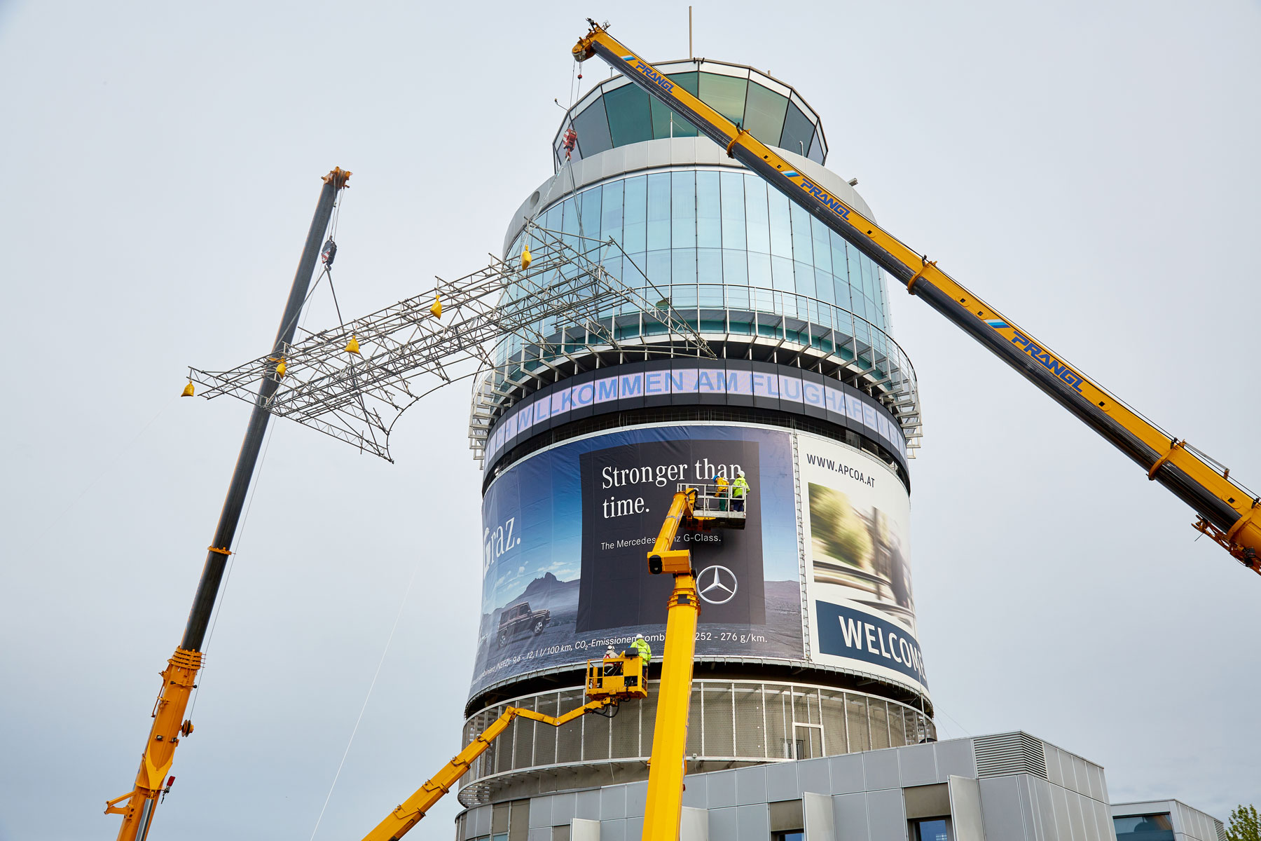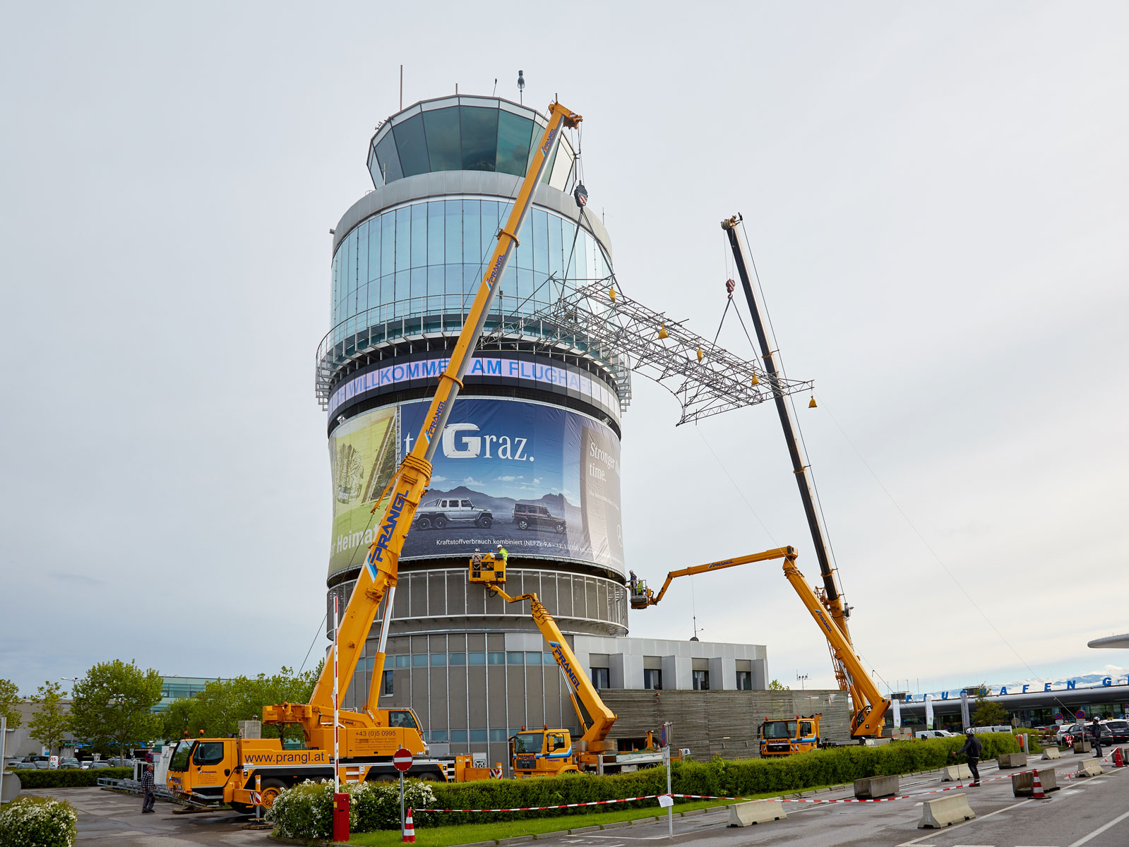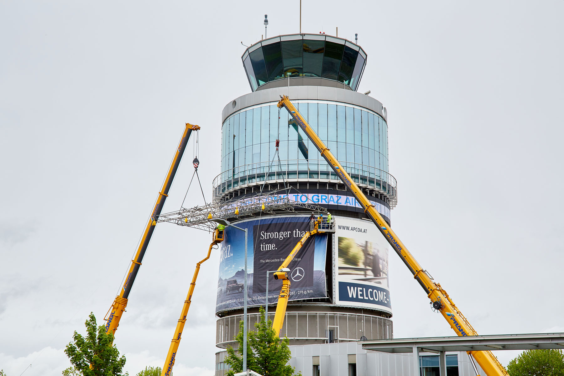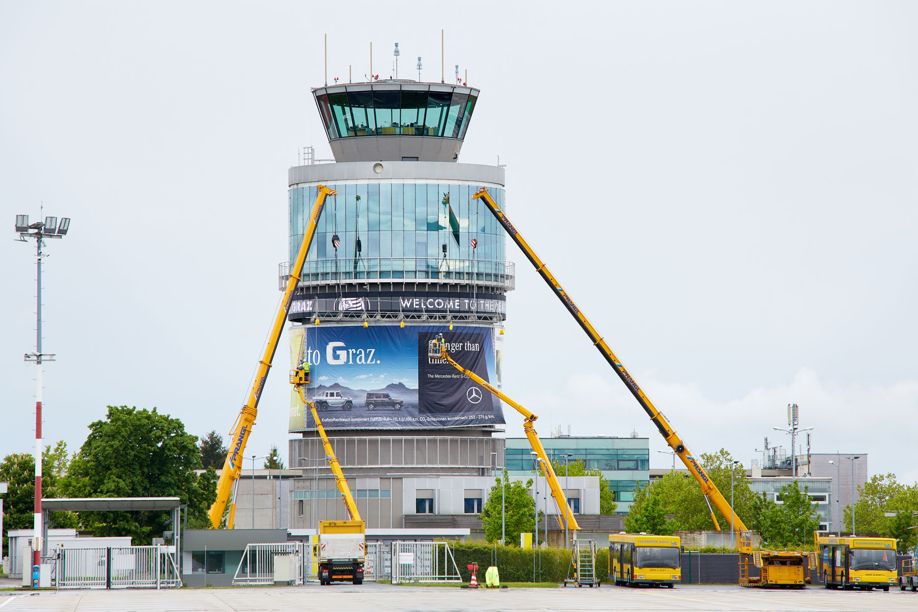 Za dela na letališkem kontrolnem stolpu so potrebni posebni varnostni ukrepi. Tokrat je bilo treba zamenjati tri reklamne transparente z dolžino 30 m in višino 7 m, ki so pritrjeni neposredno na kontrolni stolp letališča Gradec-Thalerhof. Posamezna konstrukcija je tehtala pribl. 3,5 t.