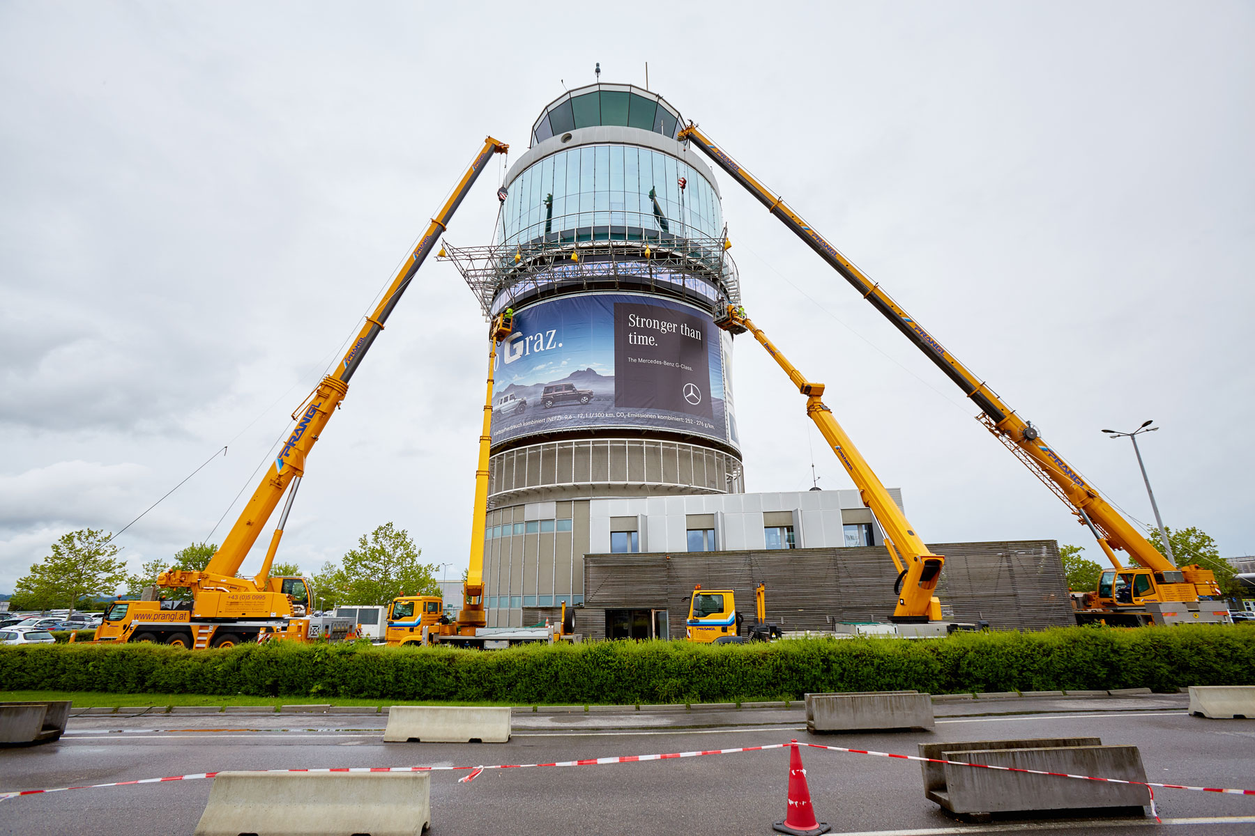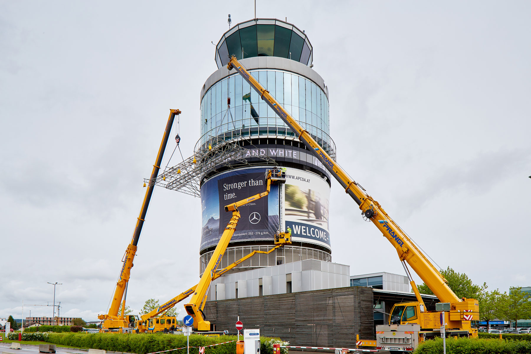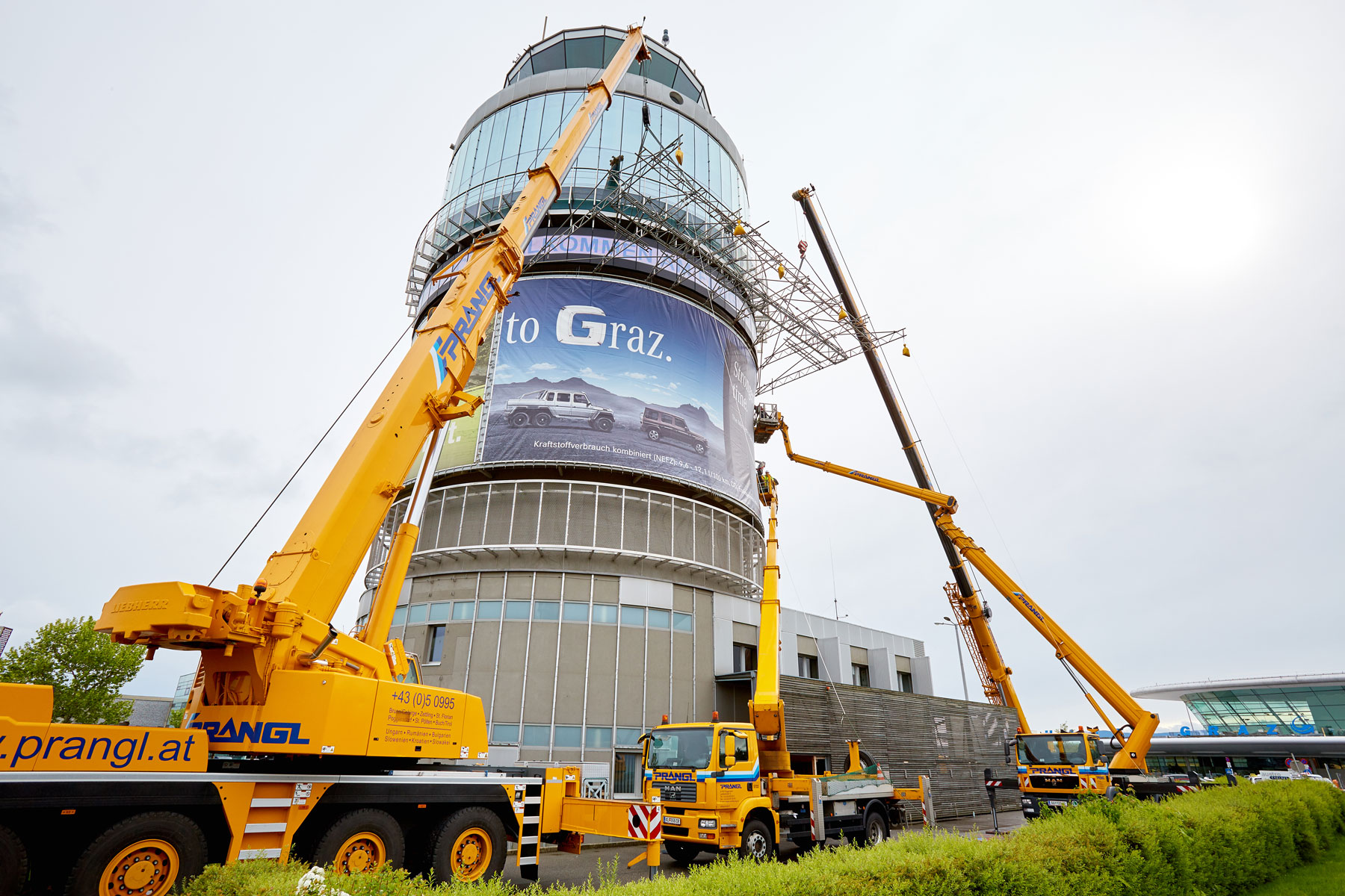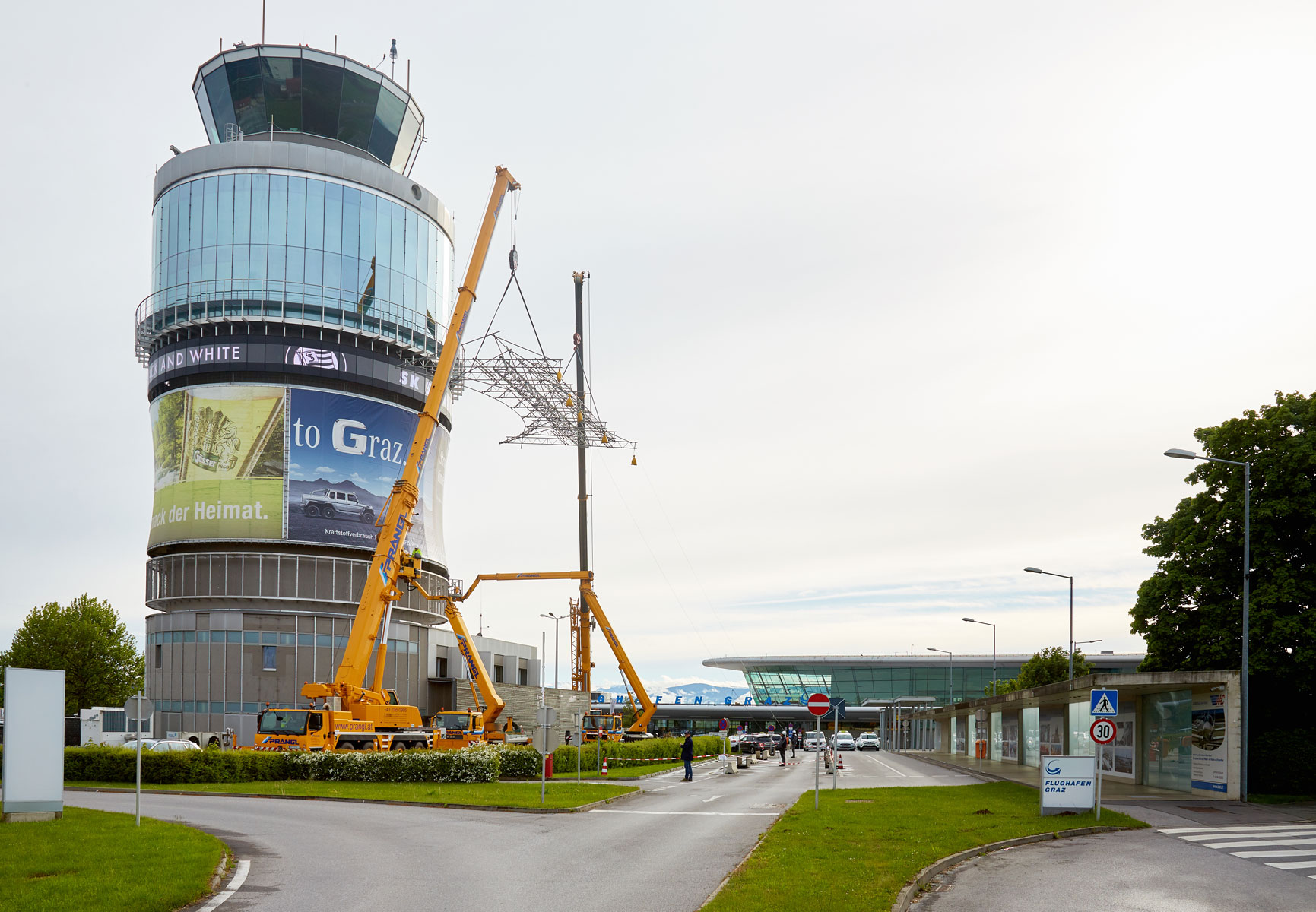 Za dela na letališkem kontrolnem stolpu so potrebni posebni varnostni ukrepi. Tokrat je bilo treba zamenjati tri reklamne transparente z dolžino 30 m in višino 7 m, ki so pritrjeni neposredno na kontrolni stolp letališča Gradec-Thalerhof. Posamezna konstrukcija je tehtala pribl. 3,5 t.