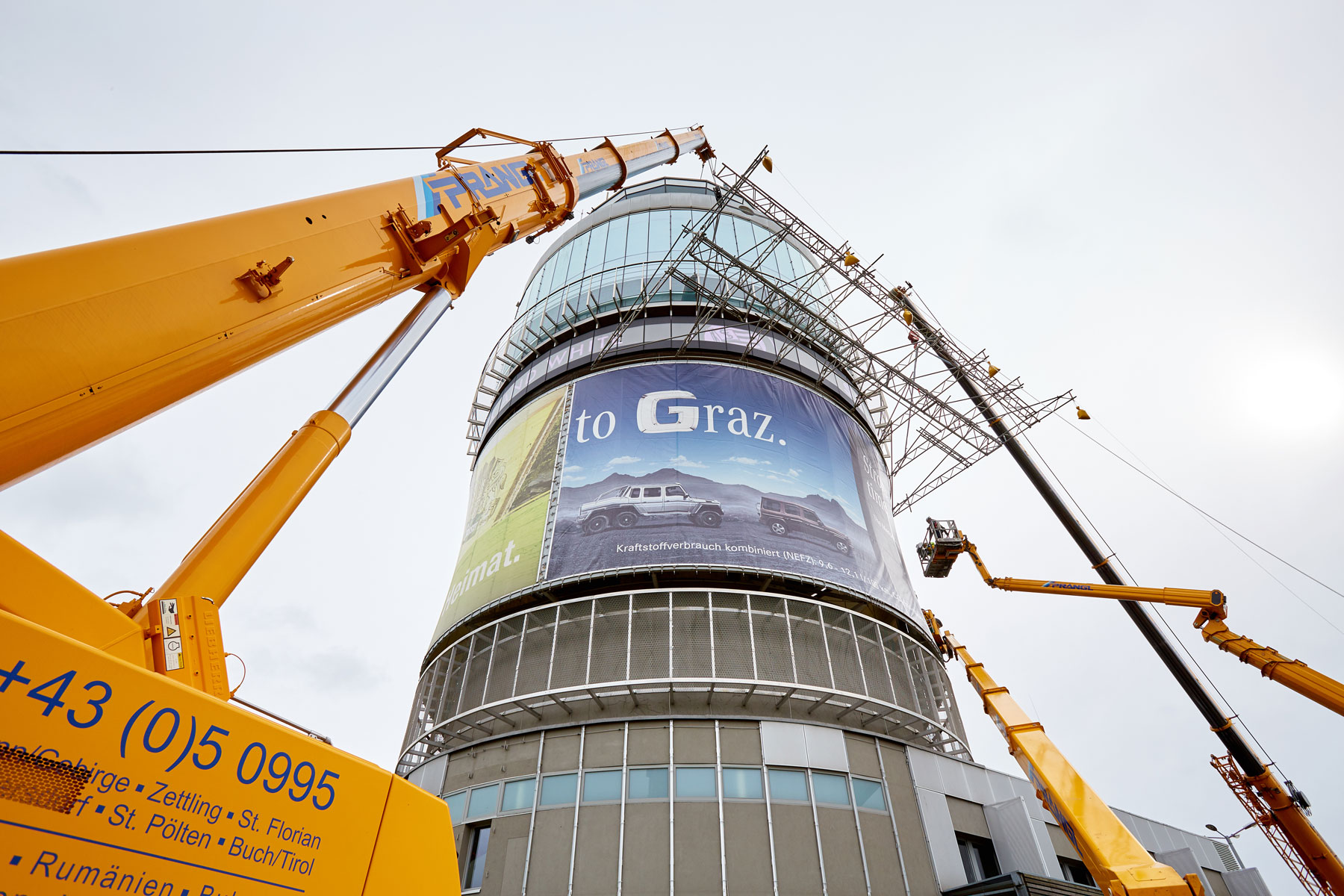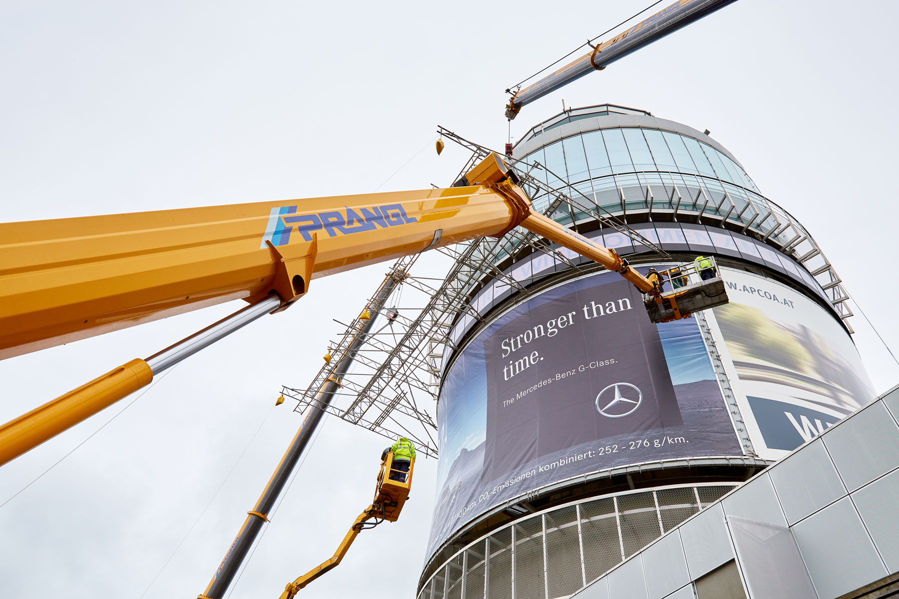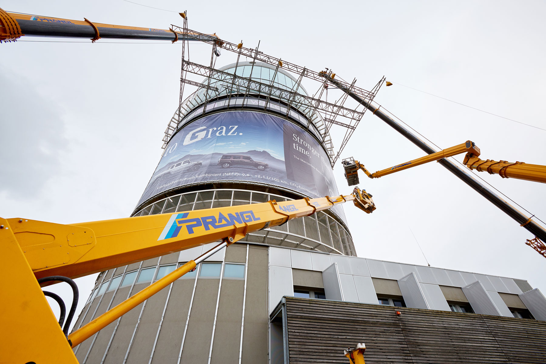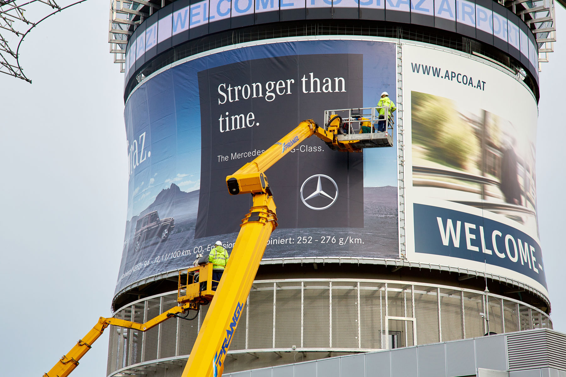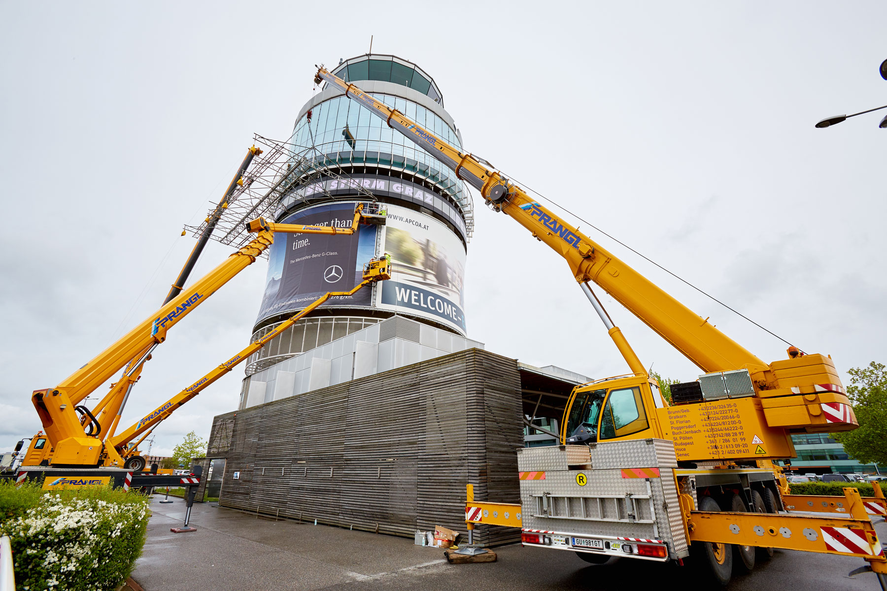 Za dela na letališkem kontrolnem stolpu so potrebni posebni varnostni ukrepi. Tokrat je bilo treba zamenjati tri reklamne transparente z dolžino 30 m in višino 7 m, ki so pritrjeni neposredno na kontrolni stolp letališča Gradec-Thalerhof. Posamezna konstrukcija je tehtala pribl. 3,5 t.