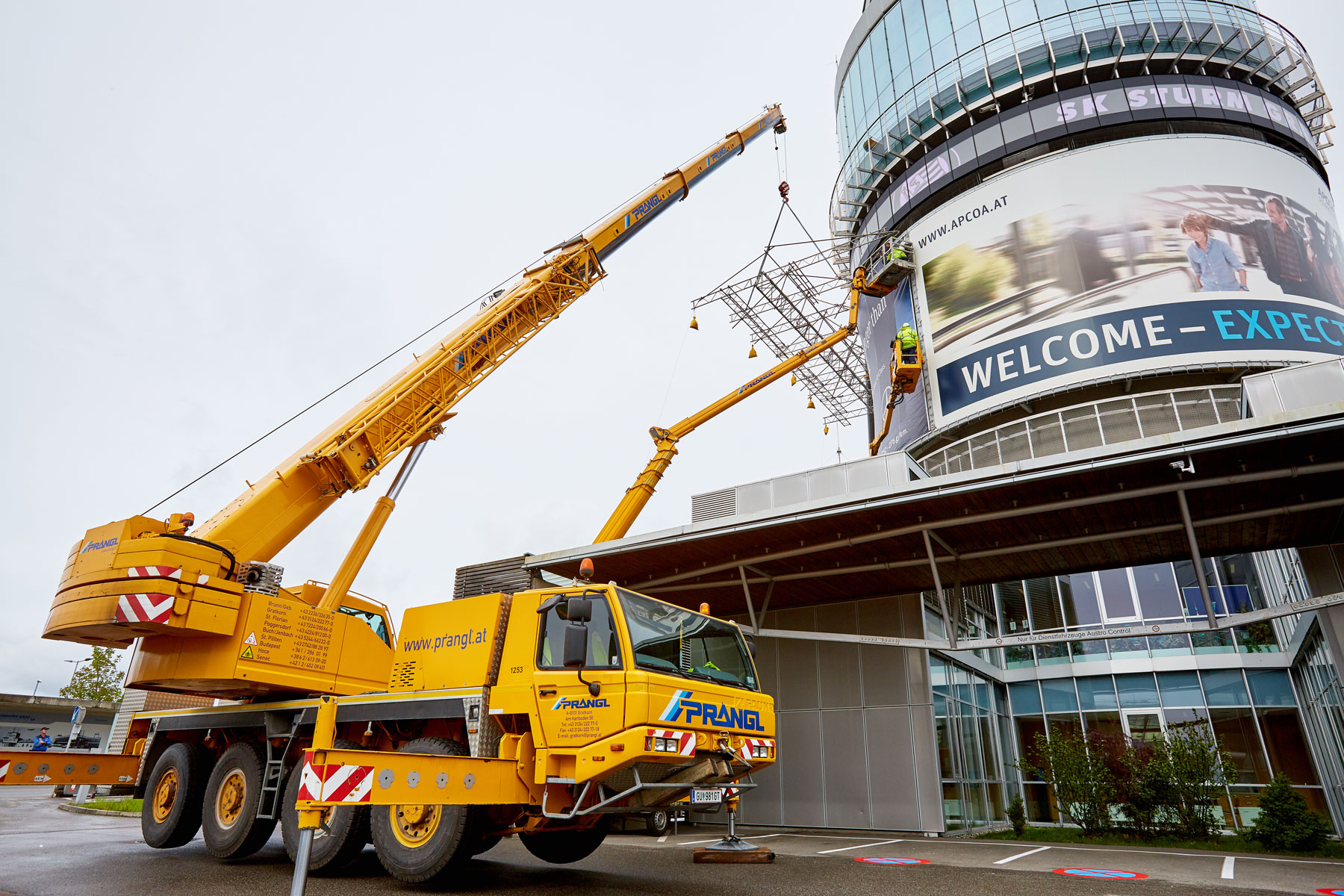 Zaradi velikih dimenzij (in s tem površine na udaru vetra) je natančno dviganje in spuščanje transparentov predstavljalo poseben izziv. Poleg tega nismo smeli prekoračiti maksimalne višine 30 m. Vedno smo se nahajali neposredno v območju poletov. Ker je podružnica Prangl Premstätten nedaleč stran in naši strokovnjaki dobro poznajo to regijo, je Prangl kmalu pripravil ustrezen koncept.