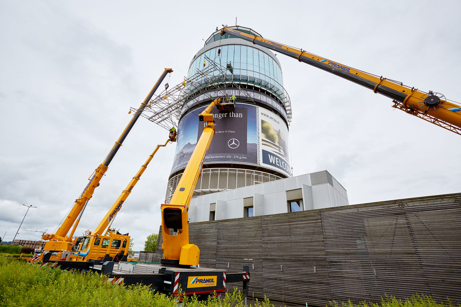 Celoten koncept dviganja in dostopa smo najprej natančno opredelili, da bi zadostili vsem varnostnim zahtevam, ki so pomembne za zračni promet. Optimalno smo uskladili zahteve za dvigala, protiuteži in vse predpise. S hkratno uporabo dveh teleskopskih dvigal nosilnosti 70 t in 95 t, dveh dvižnih delovnih ploščadi na tovornjakih z delovno višino 35 m in 46 m smo transparente uspešno zamenjali.