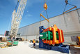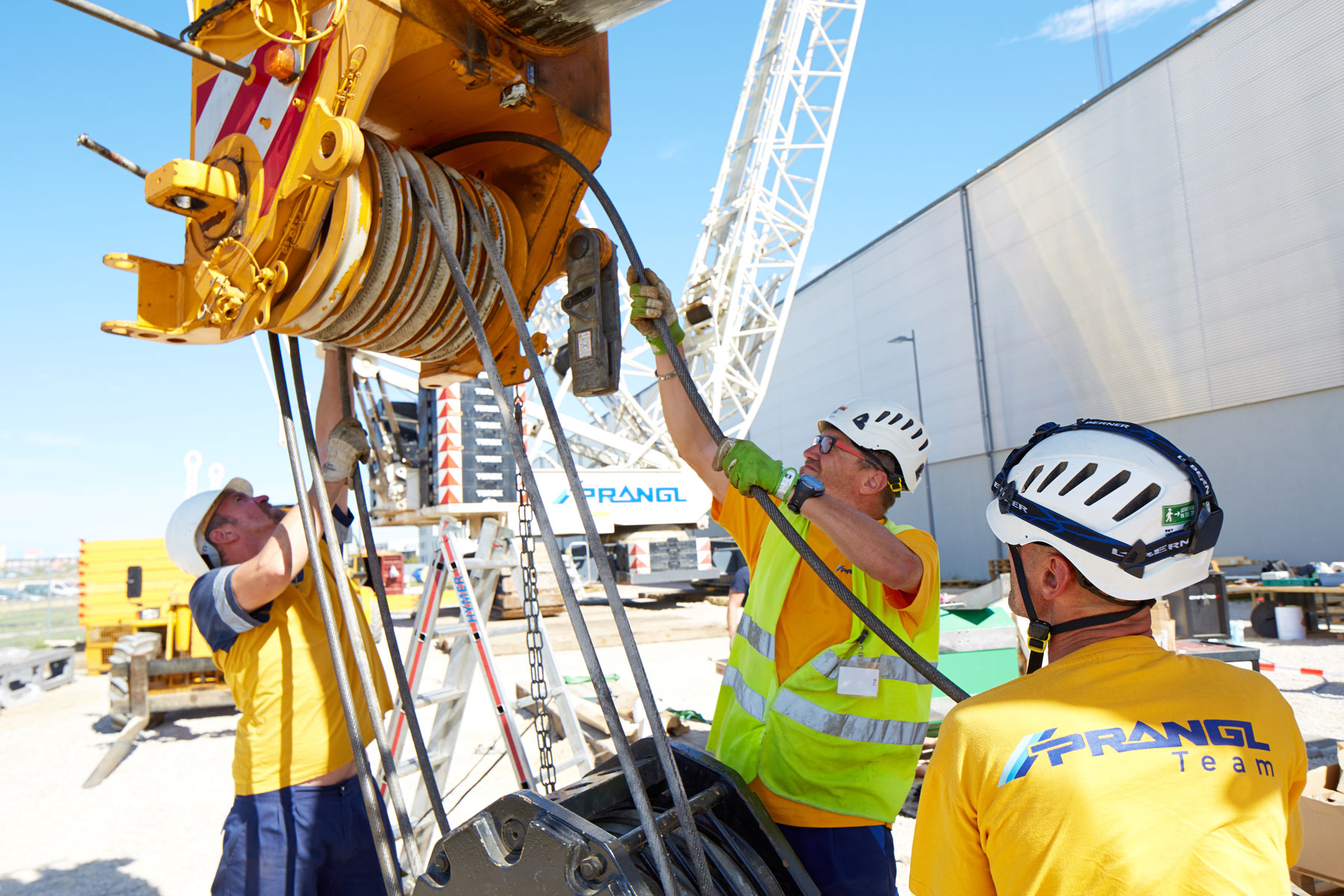 Strokovnjaki družbe Prangl so za to kočljivo nalogo izdelali koncept, ki vključuje več etap. Da bi lahko dostavljene posamične dele sestavili na suhem, smo morali na prostem postaviti velik šotor. Posebno dvigalo nosilnosti 55 t je pomagalo pri sestavljanju magneta, za katerega je bilo izdelano posebno montažno ogrodje. Z goseničnim dvigalom nosilnosti 600 t in teleskopskim dvigalom nosilnosti 250 t smo sestavljeni magnet nazadnje obrnili za 90 stopinj. Skupna teža magneta in ogrodja je znašala veličastnih 131 t.