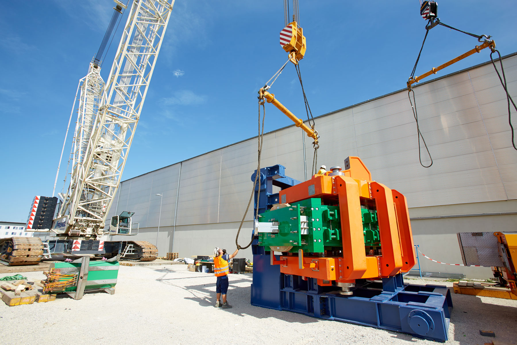 Posebej kočljiv je bil dvig magneta preko posebej pripravljene odprtine v strehi. Na milimeter natančno je gosenično dvigalo, ne le dvignilo temveč tudi namestilo120-tonski magnet v stavbi. Zaradi varnosti in vremenskih razmer smo morali odprtino v strehi vsak dan, po končanih delih, ponovno zapreti. Za obvladovanje dosega 42 m smo veliko dvigalo opremili s 440-tonskimi protiutežmi, tako je dvigalo skupno tehtalo 825 t. Z dobrimi pripravami in natančno izvedbo tega montažnega koncepta po meri smo vsa dela zaključili pravočasno.