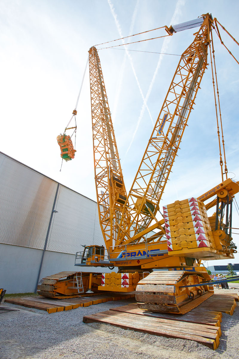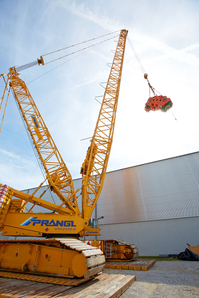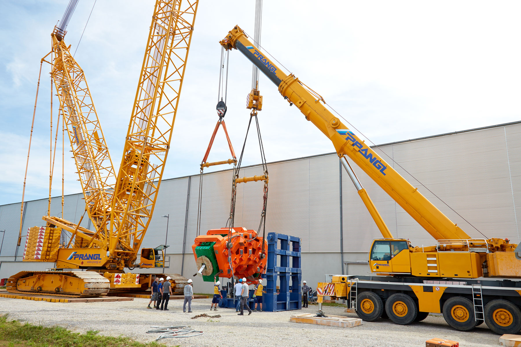 Ko smo magnet ponovno sestavili, smo ga z obema dvigaloma ponovno »obrnili nazaj« in z goseničnim dvigalom nosilnosti 600 t dvignili ter namestili skozi odprtino v strehi. Kot že prvič, je tudi pri tem dvigu vse potekalo brezhibno. Poznavanje delovišča, natančno načrtovanje in dobra izvedba so ta kočljivi projekt spremenili v popoln uspeh.