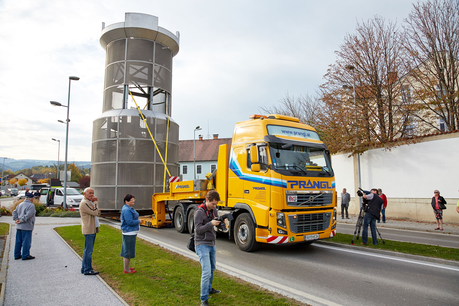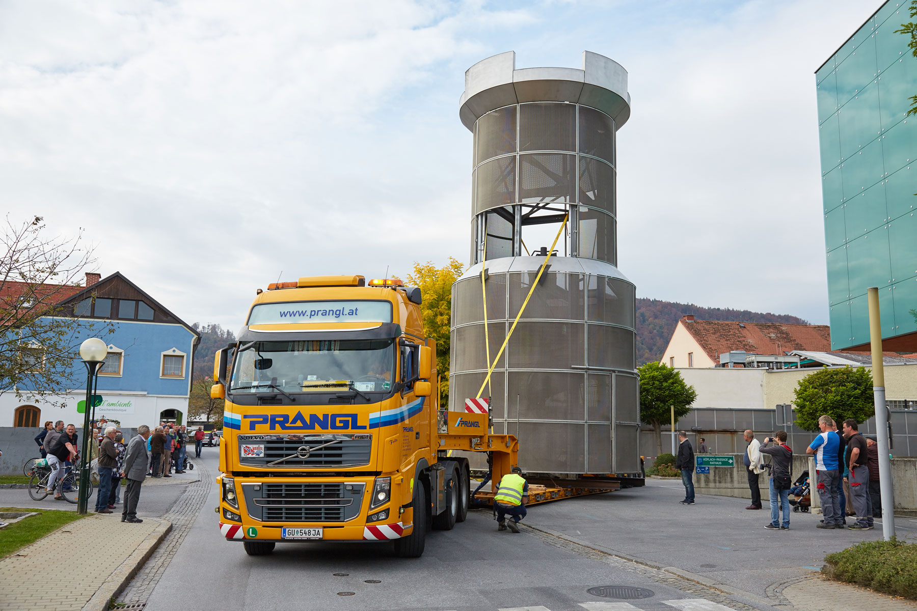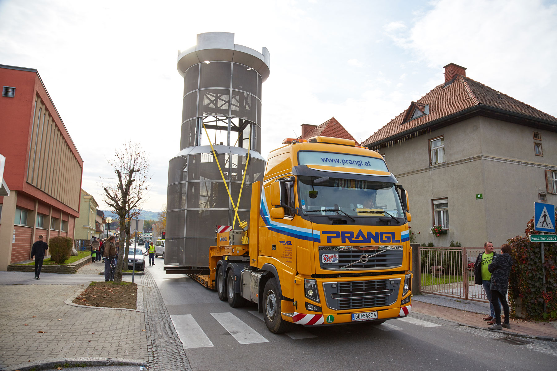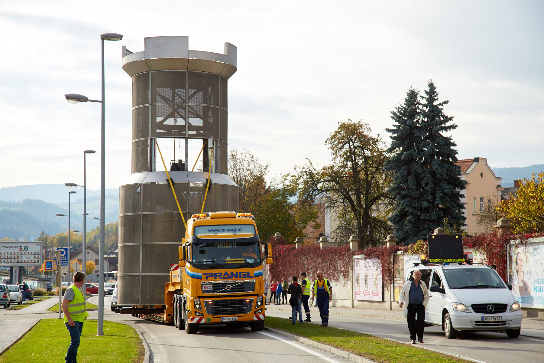 S teleskopskim dvigalom nosilnosti 200 t smo mestni stolp dvignili na pribl. 25 m dolg nizkopodni priklopnik. Vozilo se je nato korakoma pomikalo skozi ozke ulice mestnega jedra v Köflachu. Velik del poti se je pomikalo vzvratno. A niti teža stolpa 15 t niti dolžina transportnega sestava nista predstavljali dejanskega izziva. Skupna višina slabih 11 m je od ekipe zahtevala največjo možno osredotočenost in natančnost. Kajti mestni stolp so prepeljali v enem kosu in v navpičnem položaju.