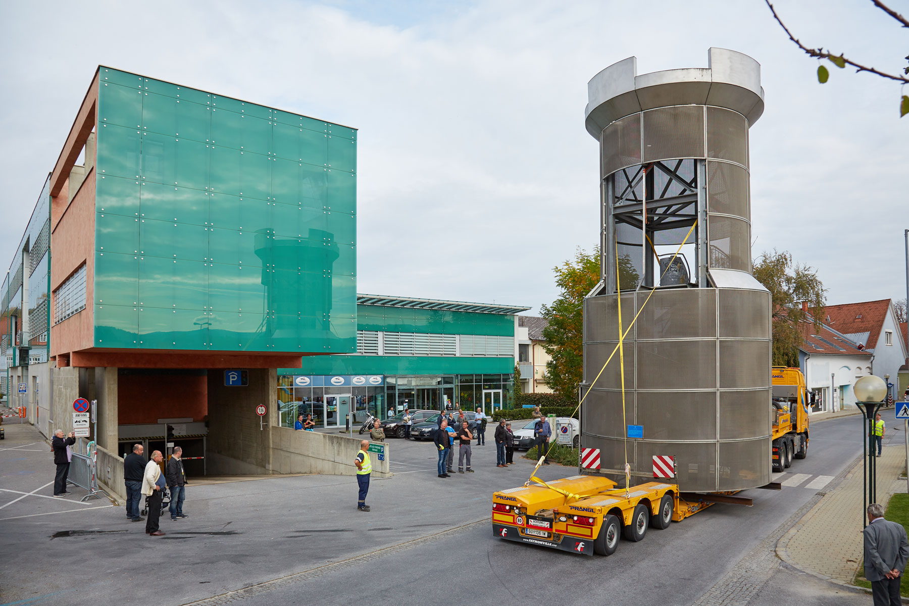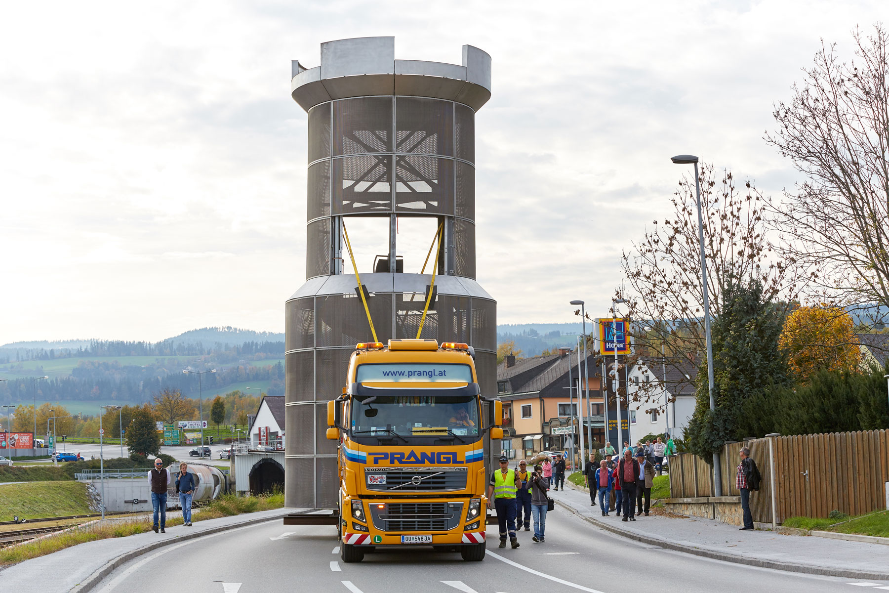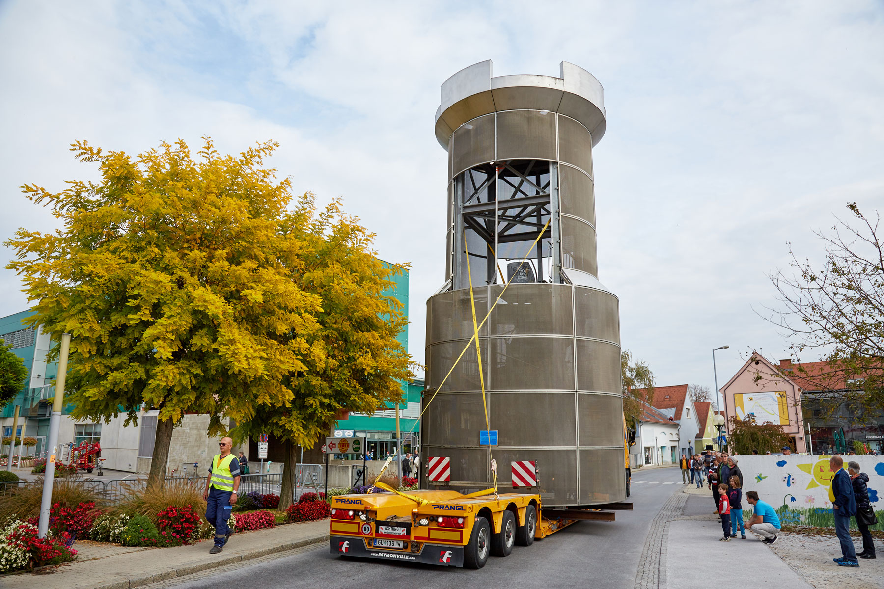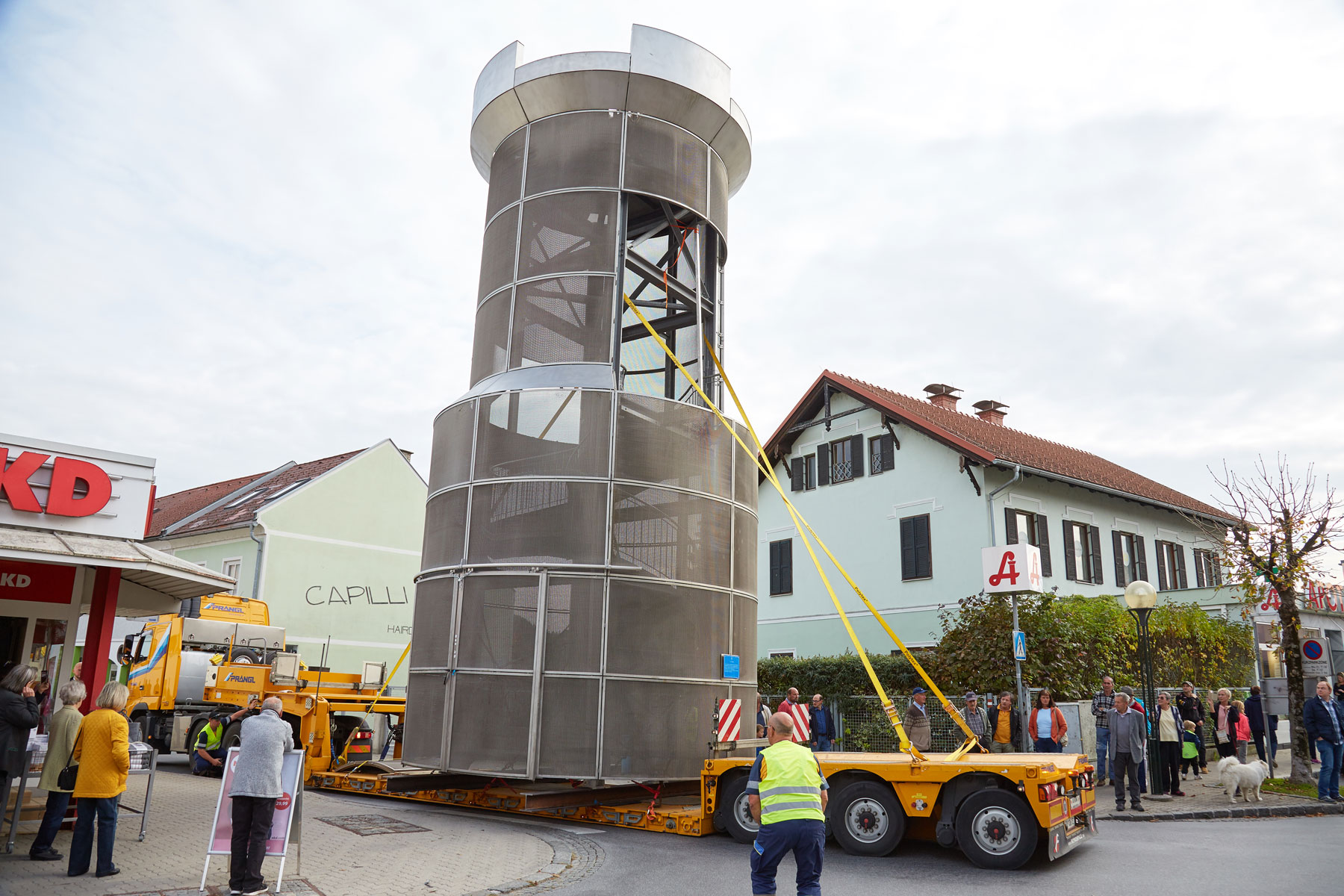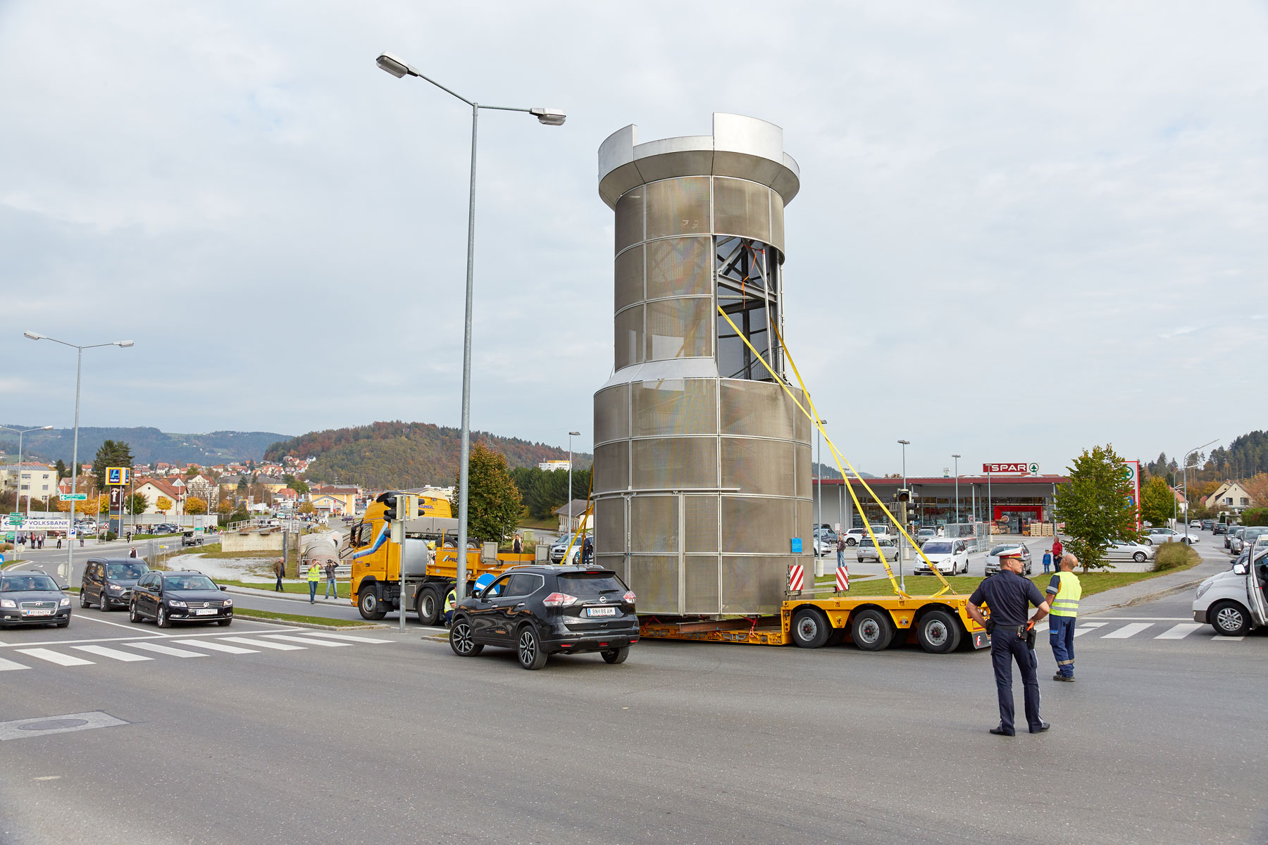 S teleskopskim dvigalom nosilnosti 200 t smo mestni stolp dvignili na pribl. 25 m dolg nizkopodni priklopnik. Vozilo se je nato korakoma pomikalo skozi ozke ulice mestnega jedra v Köflachu. Velik del poti se je pomikalo vzvratno. A niti teža stolpa 15 t niti dolžina transportnega sestava nista predstavljali dejanskega izziva. Skupna višina slabih 11 m je od ekipe zahtevala največjo možno osredotočenost in natančnost. Kajti mestni stolp so prepeljali v enem kosu in v navpičnem položaju.