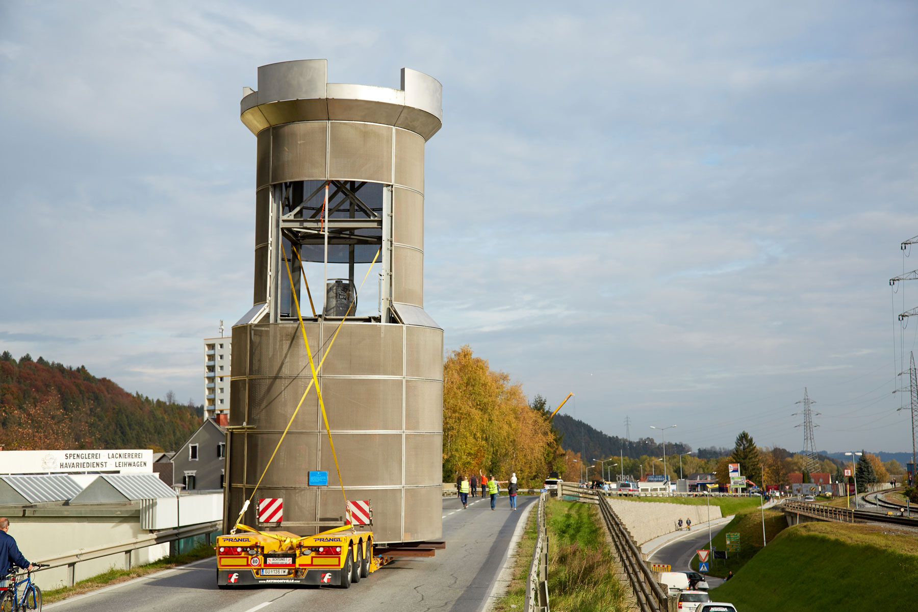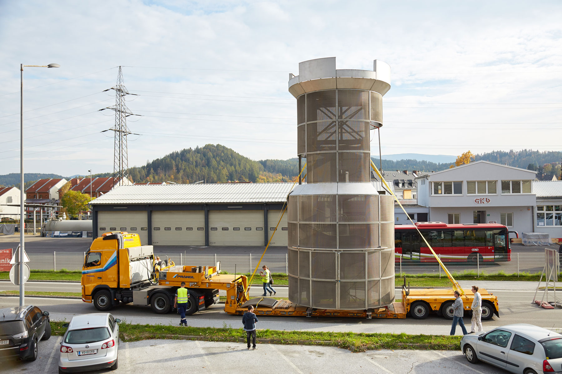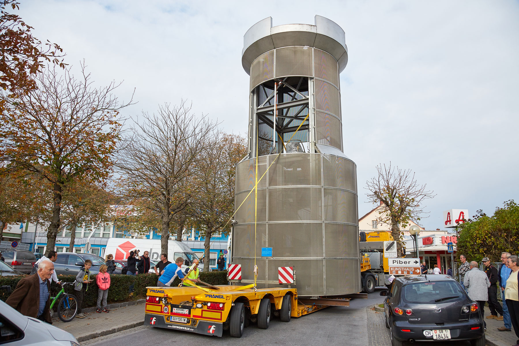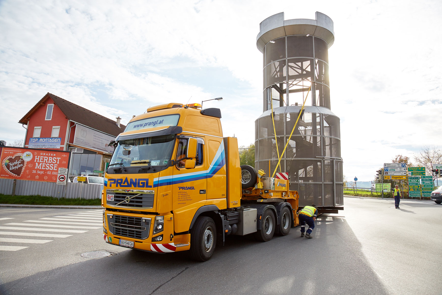 S teleskopskim dvigalom nosilnosti 200 t smo mestni stolp dvignili na pribl. 25 m dolg nizkopodni priklopnik. Vozilo se je nato korakoma pomikalo skozi ozke ulice mestnega jedra v Köflachu. Velik del poti se je pomikalo vzvratno. A niti teža stolpa 15 t niti dolžina transportnega sestava nista predstavljali dejanskega izziva. Skupna višina slabih 11 m je od ekipe zahtevala največjo možno osredotočenost in natančnost. Kajti mestni stolp so prepeljali v enem kosu in v navpičnem položaju.