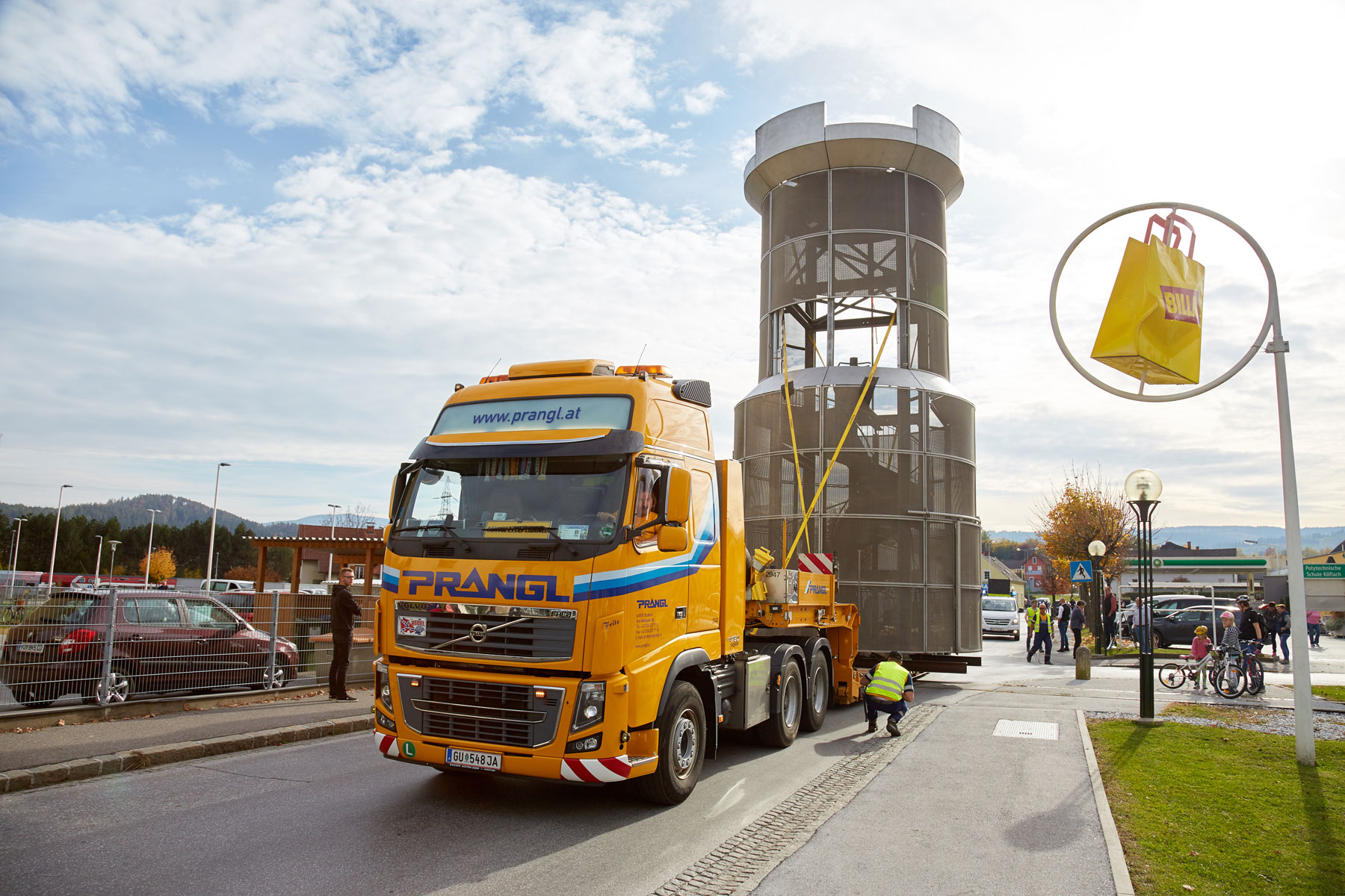 Štajerska mestna občina Köflach je dobila nov razpoznavni znak. Mestni stolp, ki je dotlej stal zraven mestne hiše, smo premestili v središče krožišča zvezne ceste B70 na robu mesta. Družba Prangl je prejela ekskluzivno naročilo za posebni prevoz in dvižna dela.