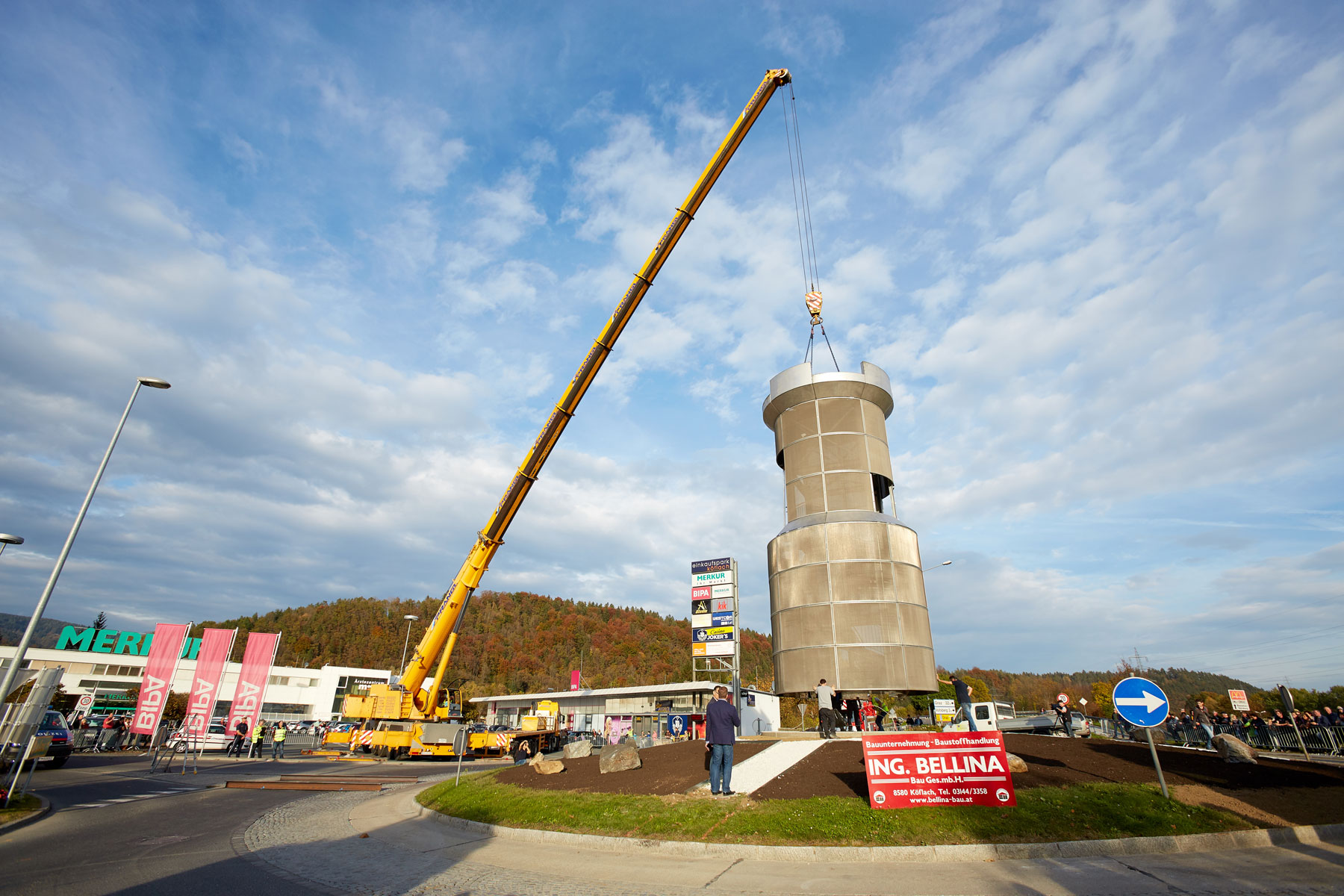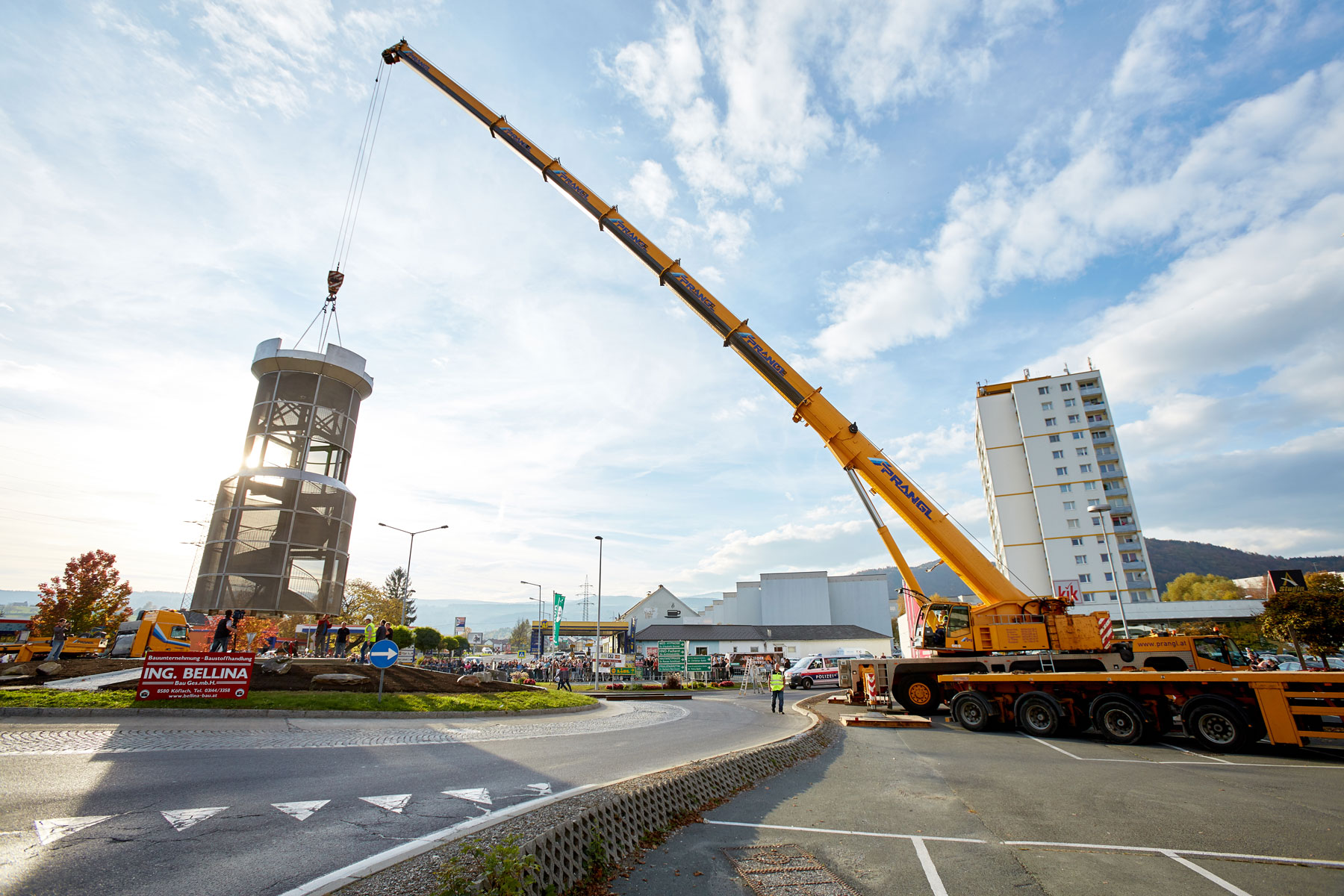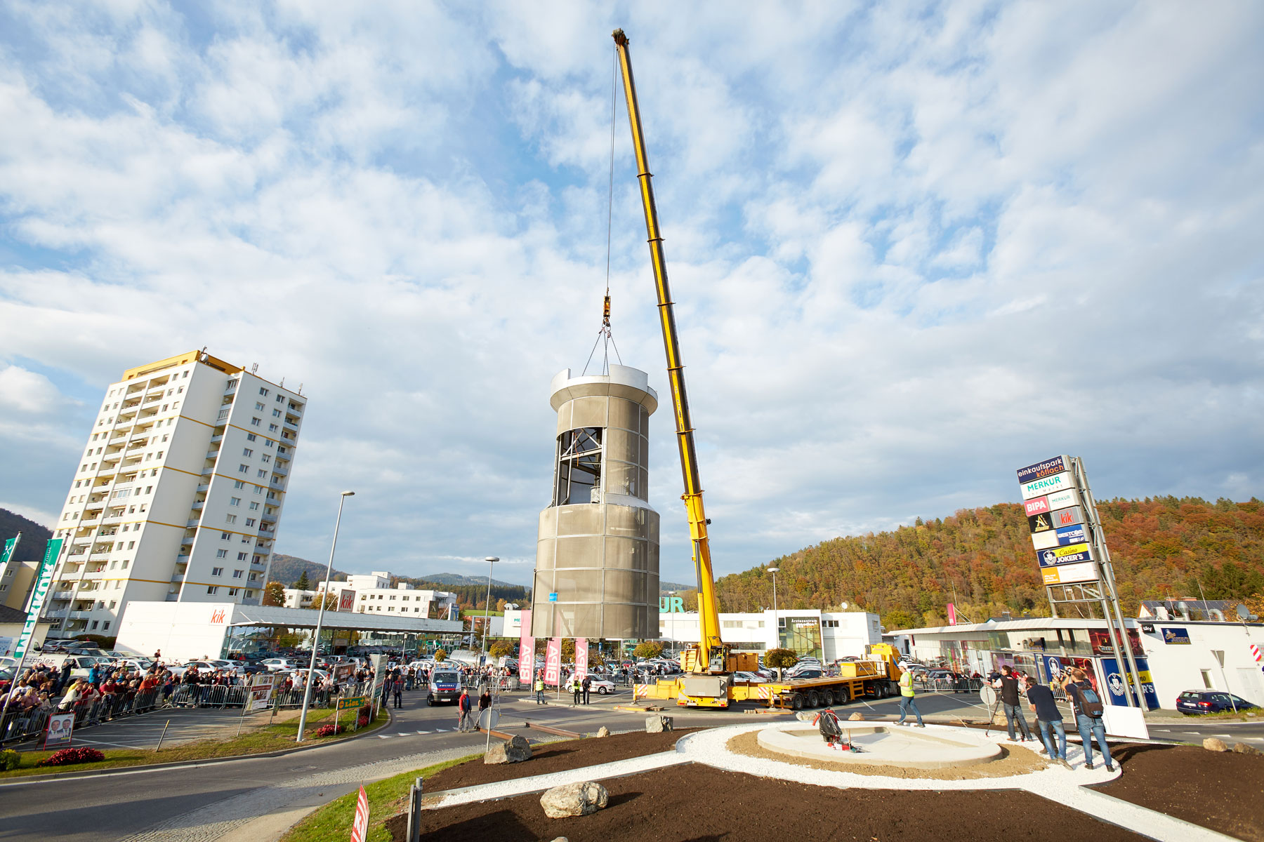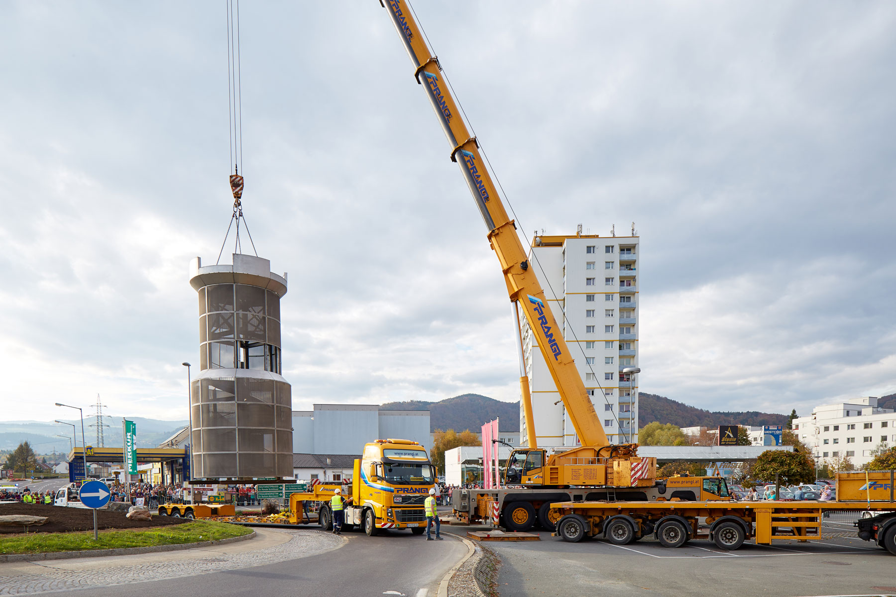 Za ograjo so številni gledalci spremljali stolp na poti na novo, častno izpostavljeno stojišče. In ob velikem interesu medijev ter občinstva smo köflaški razpoznavni znak, s teleskopskim dvigalom nosilnosti 200 t, varno prestavili na sredino krožišča. Enkrat več so se pokazale prednosti koncepta »One-Stop-Shopping« ali »Vse na enem mestu«.