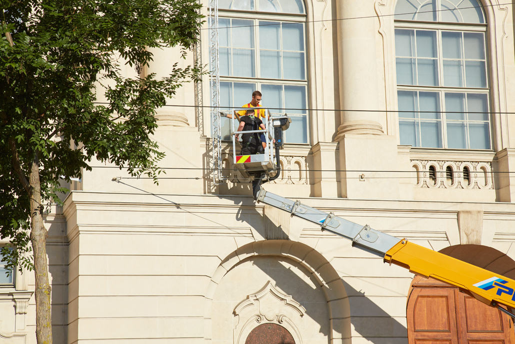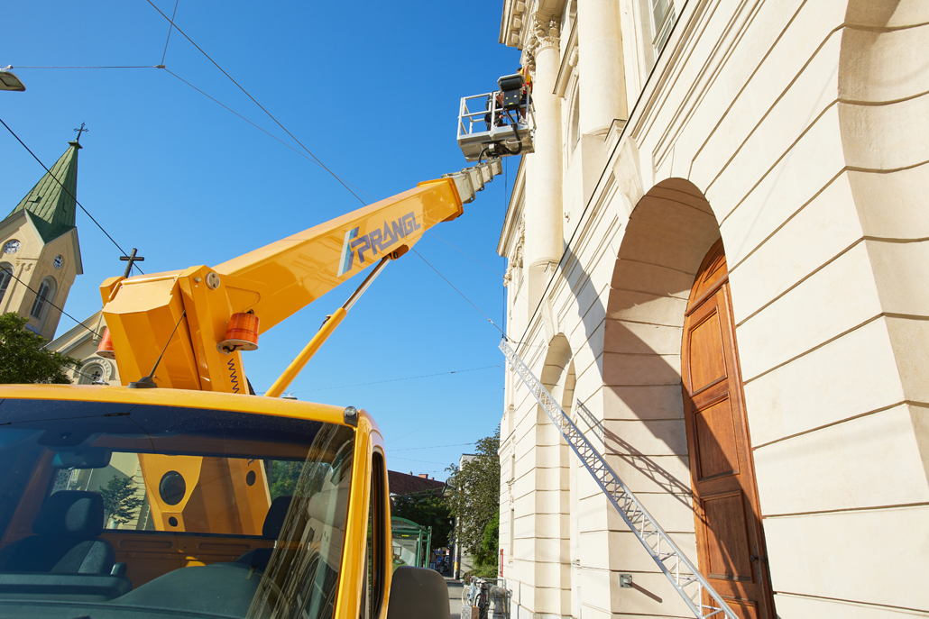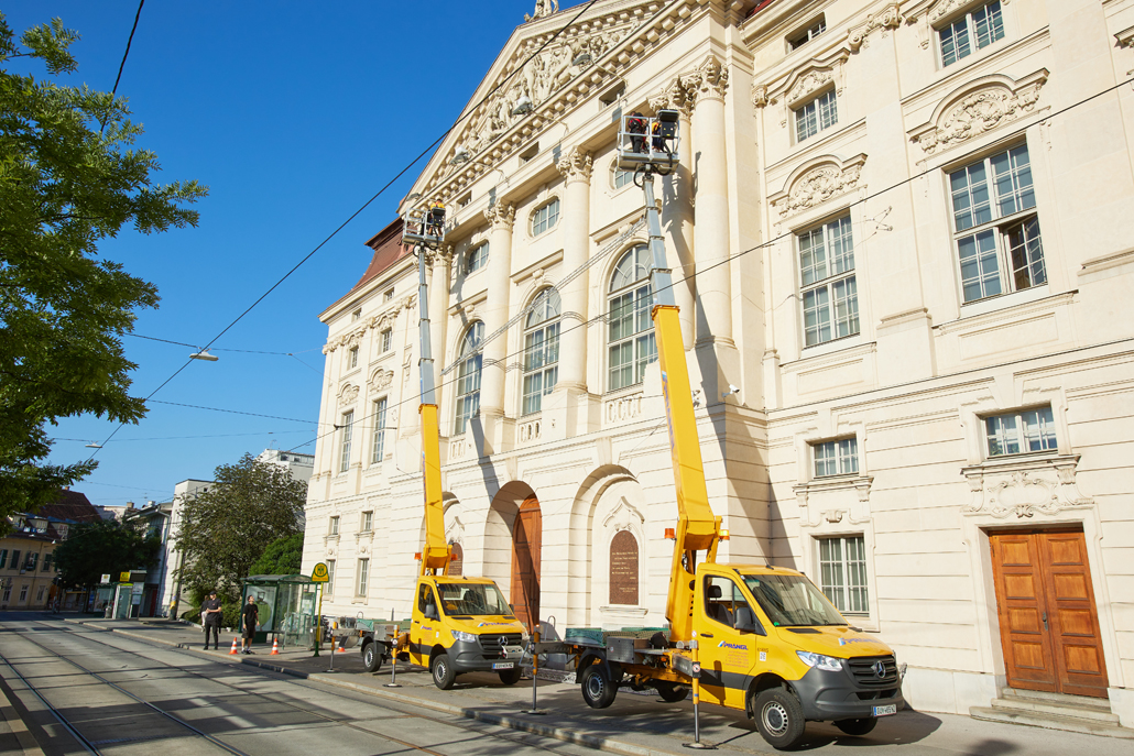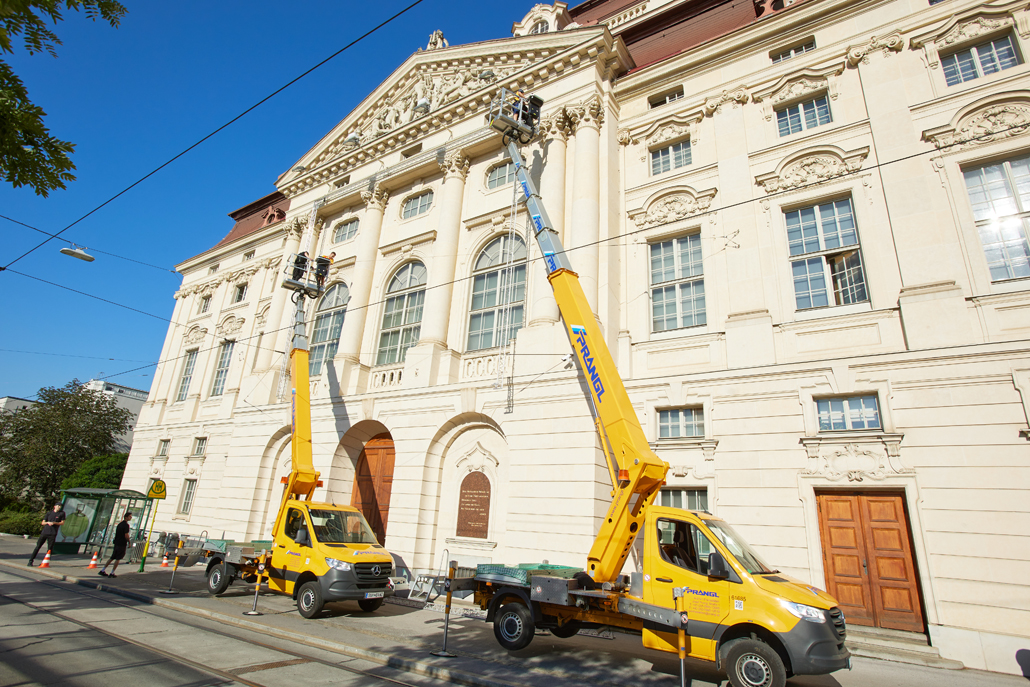 Zaposleni podjetja Prangl so postavili dve delovni ploščadi na ozkem pločniku, ki se neposredno naslanja na postajo tramvaja. Za to nalogo so uporabili vrste delovnih ploščadi, ki so bile idealne za to nalogo, saj so imele največjo delovno višino 27,60 metrov, nosilnost 230 kilogramov in lateralni doseg 17,00 metrov. Zaposleni iz opere so bili razporejeni, da preusmerjajo mimoidoče pešce iz območja nevarnosti. V vsaki delovni košari je sedel monter, ki je najprej namestil štiri pritrdilne tirnice na predpisanih točkah.