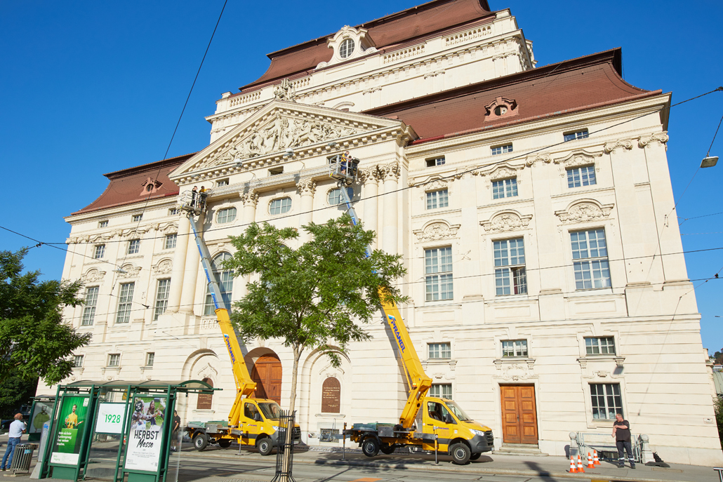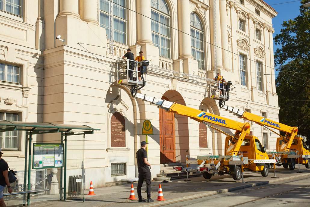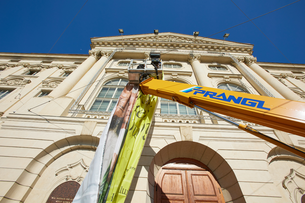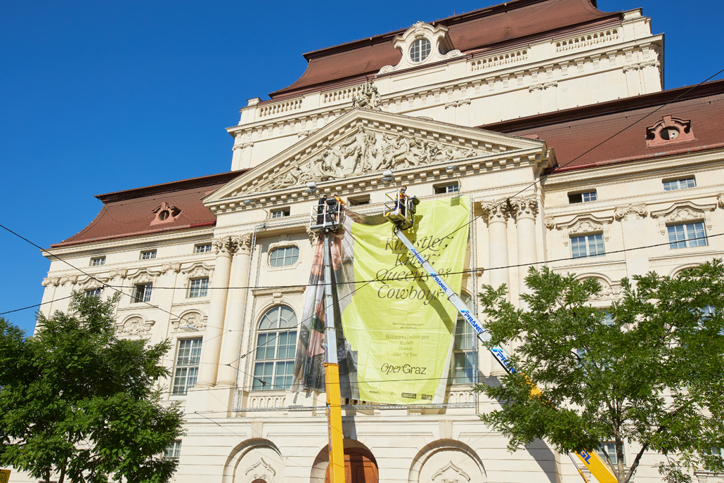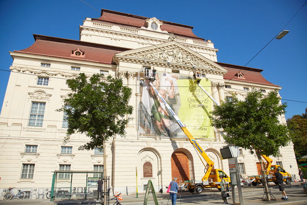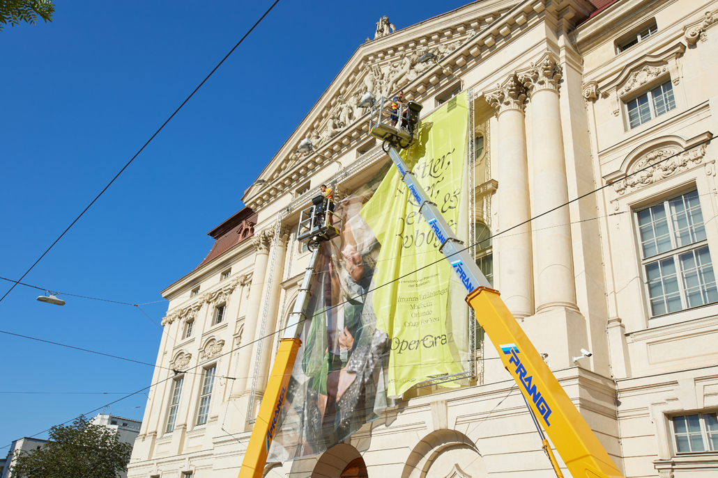Seveda primer za Prangl: namestitev ogromnega reklamnega transparenta na graško operno hišo je bila namenjena pritegniti pozornost javnosti in opozoriti na odprtje umetniške sezone 2023/2024. A zaradi lokacije v središču mesta in s tem povezane omejene svobode gibanja je projekt zahteval dobro premišljen koncept.