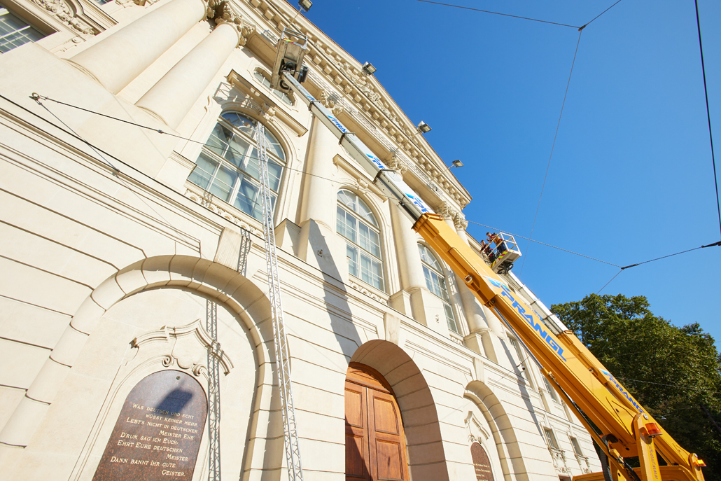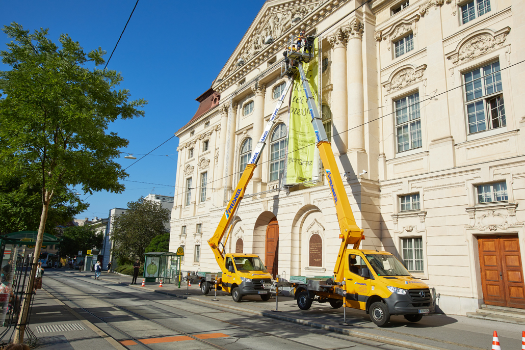 Z uporabo vrví so najprej previdno dvignili najvišjo vodoravno tirnico. Vedno so bili izjemno previdni, da ne bi prišli v stik z mnogimi vodniki. Naslednji korak je bil montaža obeh vertikalnih tirnic na levi in desni strani, nato pa je sledila zadnja prečka na spodnjem koncu. Nato so lahko ekipe transparent postavile na nosilce, kos za kosom - pri vsakem gibu delovne košare so bili pozorni, da ne bi prišli v stik z nobenim kabelskim vodom. Ob prisotnosti mnogih radovednežev je bilo delo končano v popolno zadovoljstvo graške opere.