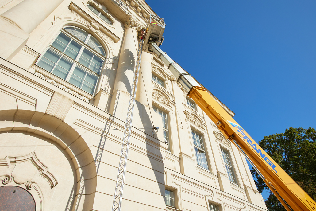 Namestitev transparenta na fasado stavbe zgodovinskega pomena.