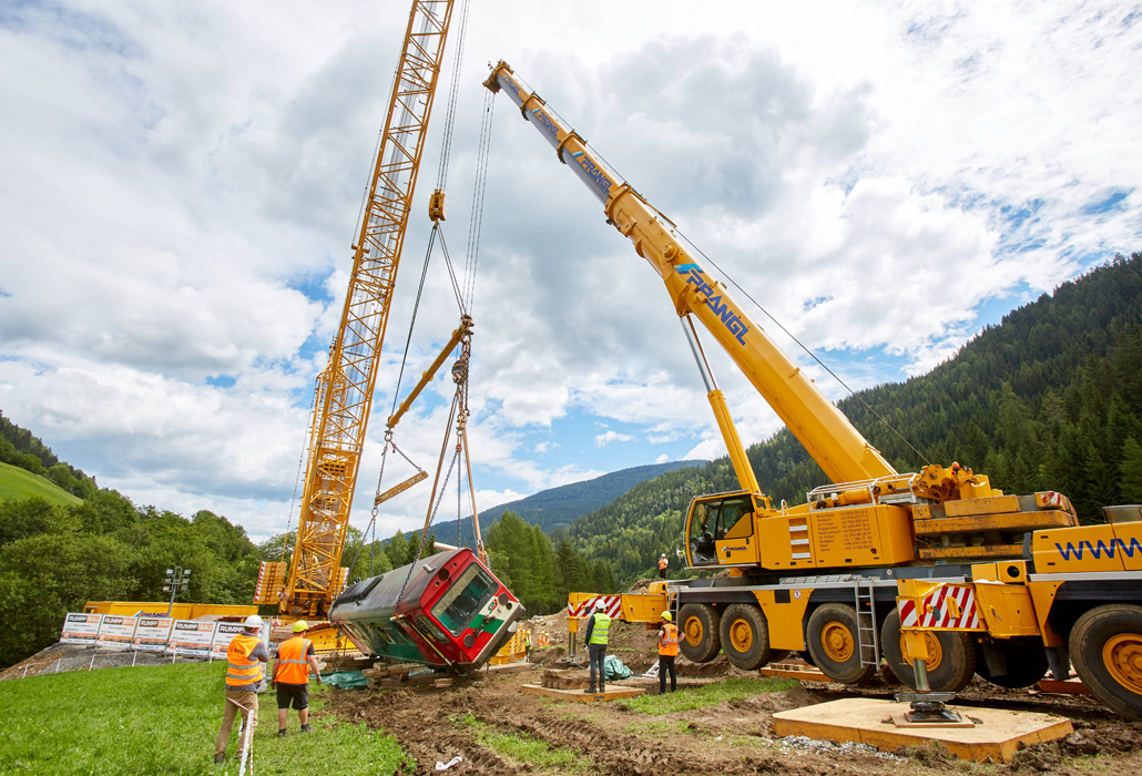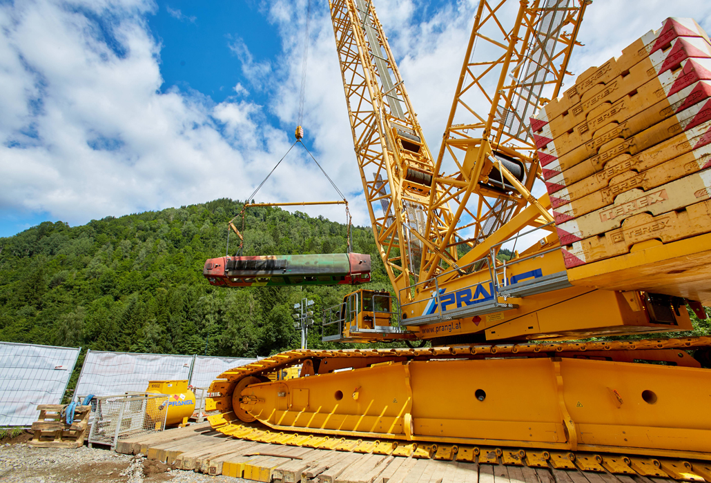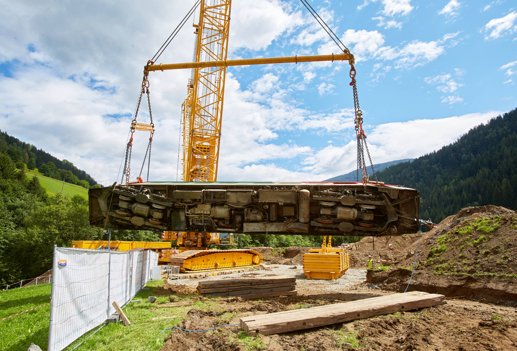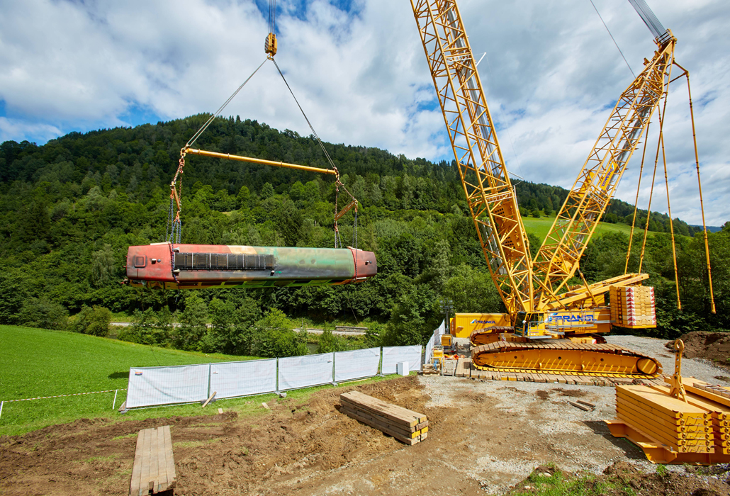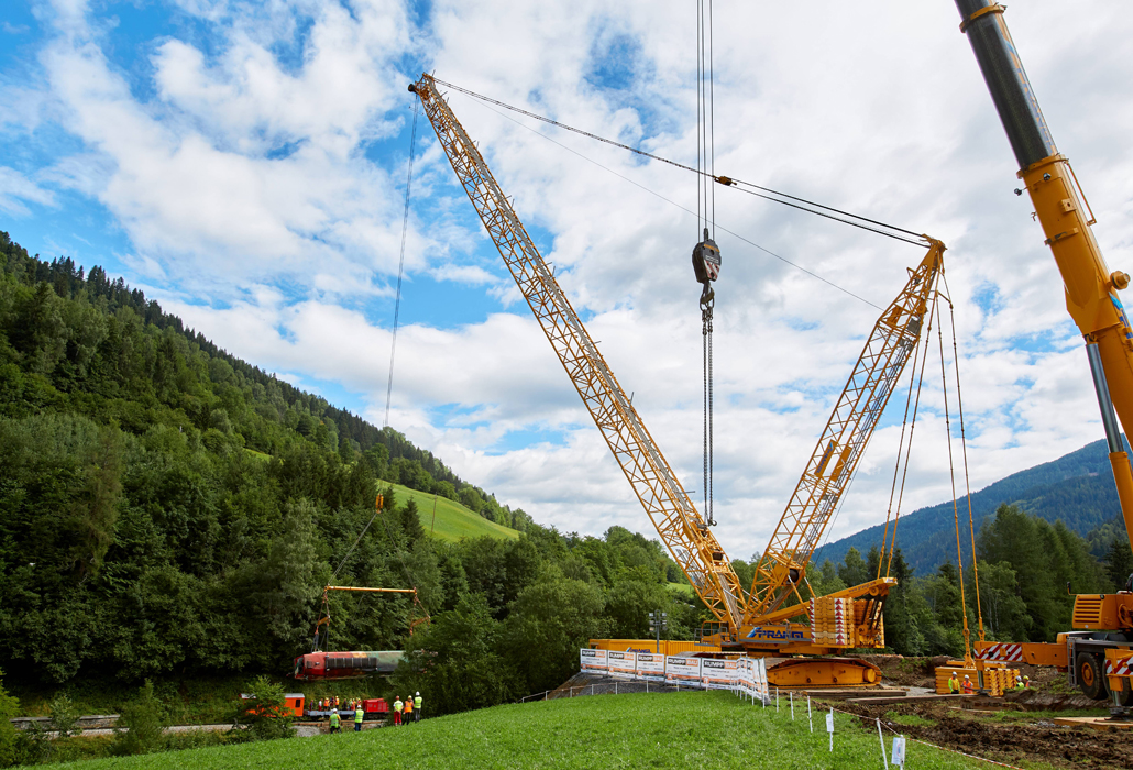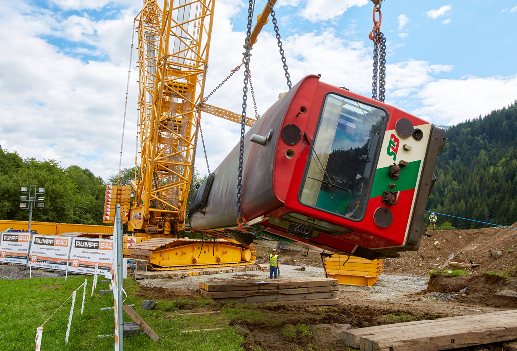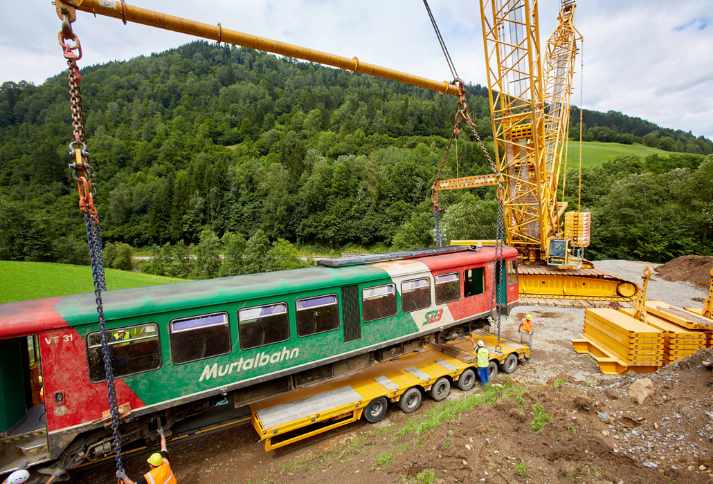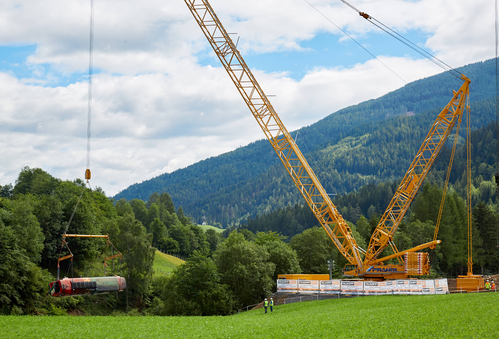 9. julija 2021 je iztiril železniški voz železnice Murtalbahn ter med Štajersko in Salzburgom zgrmel v reko Muro. Zaradi krajevnih danosti je hitro postalo jasno, da običajna uporaba dvigala ne pride v poštev. Za uporabo velikega dvigala je bilo treba opraviti določena pripravljalna dela. Zasnovati je bilo treba 90 metrov dolgo dovozno cesto. Da bi lahko rumenega orjaka varno namestili, je bilo treba nasipati pribl. 600 m2 veliko stojno površino. Vendar to še ni bilo dovolj. Poleg tega je bilo treba izdelati posebna dvižna sredstva.