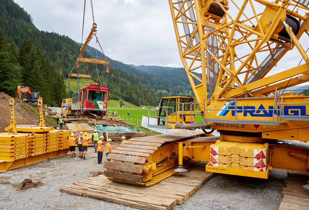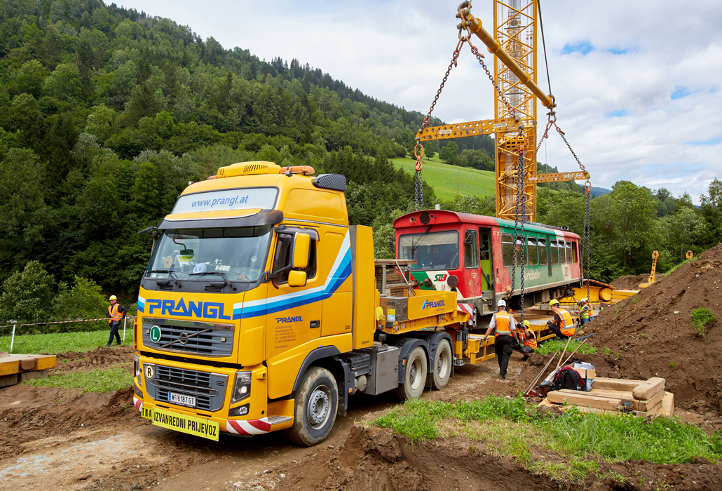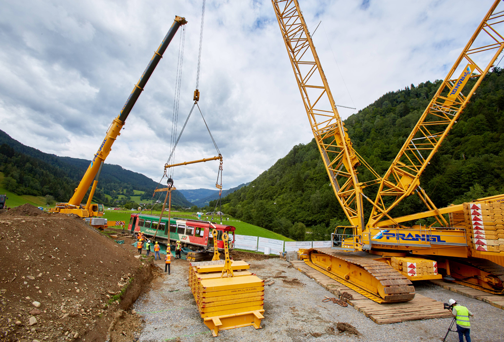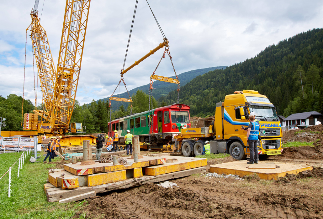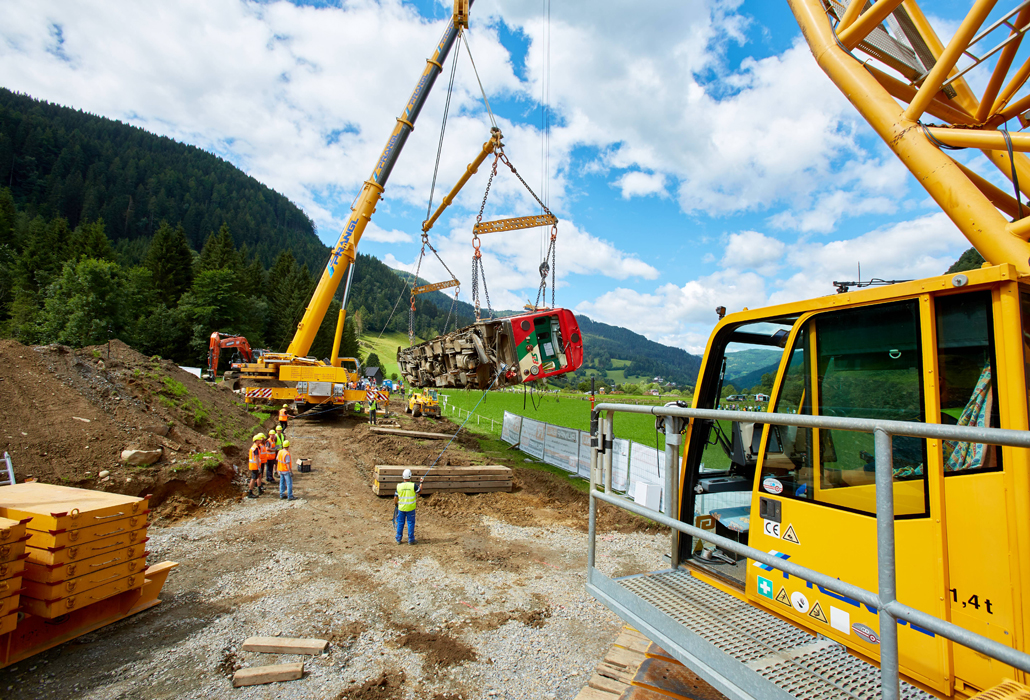 Da bi zagotovili kar največjo varnost, je bila železniška proga med krajema Murau in Tamgsweg ves dan zaprta. Po dvigovanju je bila lokomotiva za nekaj časa odložena na trdi podlagi. Po takojšnjem pregledu je bila pripravljena za nadaljnje obračanje. V tandemskem dvigu sta gosenično dvigalo nosilnosti 600 ton in teleskopsko dvigalo nosilnosti 250 ton poravnali ponesrečeno lokomotivo ter jo dvignili na raztegljiv plato polpriklopnik podjetja Prangl. Nato smo železniški voz pravilno zavarovali in ga prepeljali do kolodvora Murau, kjer smo ga s teleskopskim dvigalom nosilnosti 250 ton raztovorili.