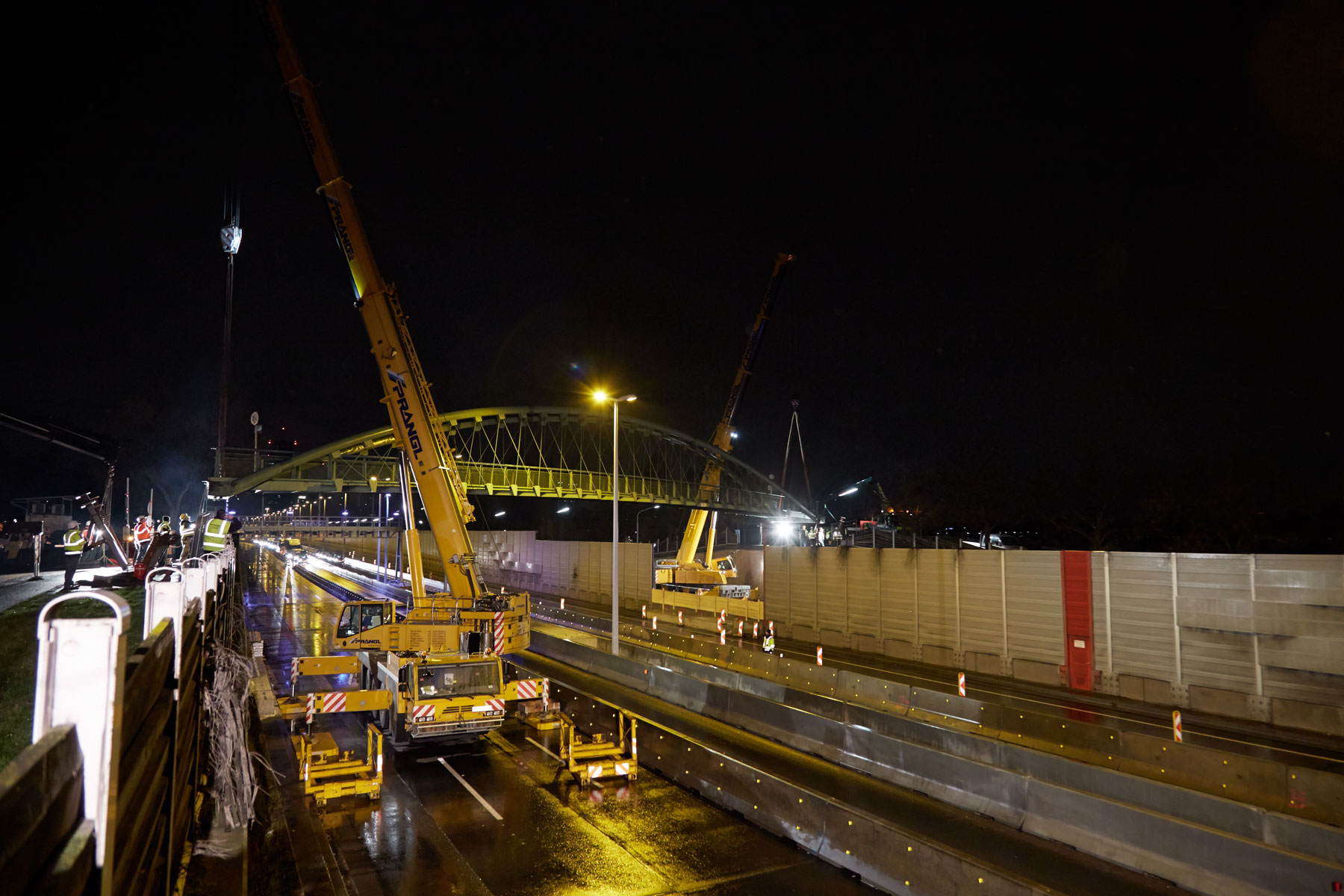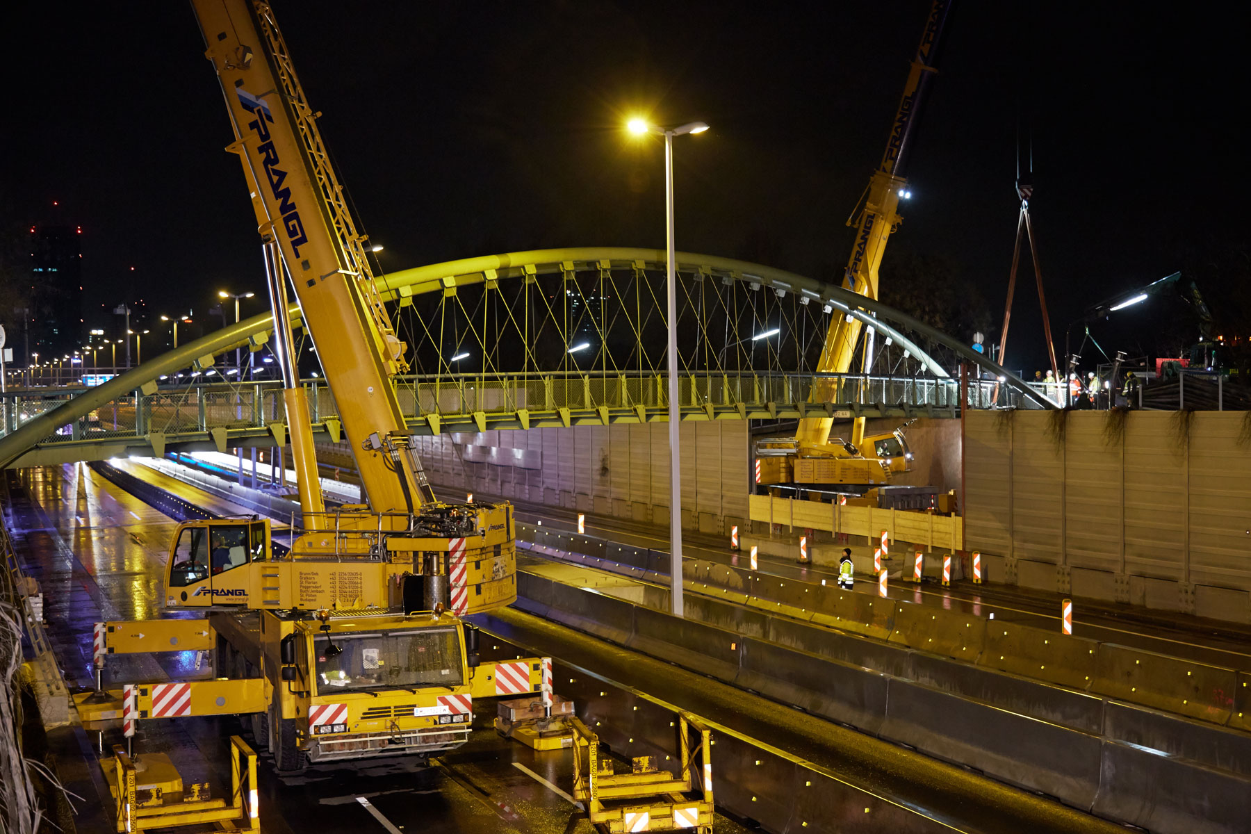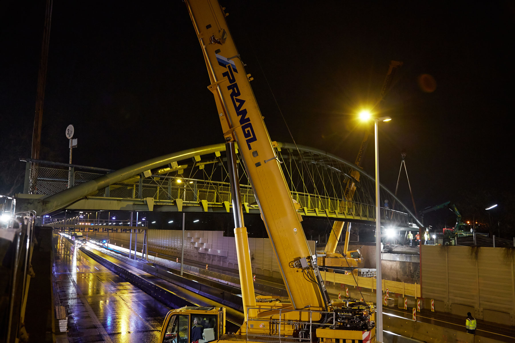 Piratska brv poteka nad avtocesto A22 in povezuje kaisermühlenški nasip s pešpotjo Stara Donava. Za namen prenove smo morali 51 m dolgo in 90 t težko brv dvigniti za pribl. 2,5 m in jo ustrezno podpreti. Za to smo potrebovali teleskopski dvigali nosilnosti 200 t in 120 t. Zaradi ozke stojne površine smo morali na eni strani uporabiti dvigalo nosilnosti 200 t, saj je samo to dvigalo zagotavljalo potrebno dvižno kapaciteto s polovično podporo. Upravljavca obeh dvigal sta morala dvigniti brv popolnoma usklajeno – kljub medsebojni oddaljenosti pribl. 40 m.
