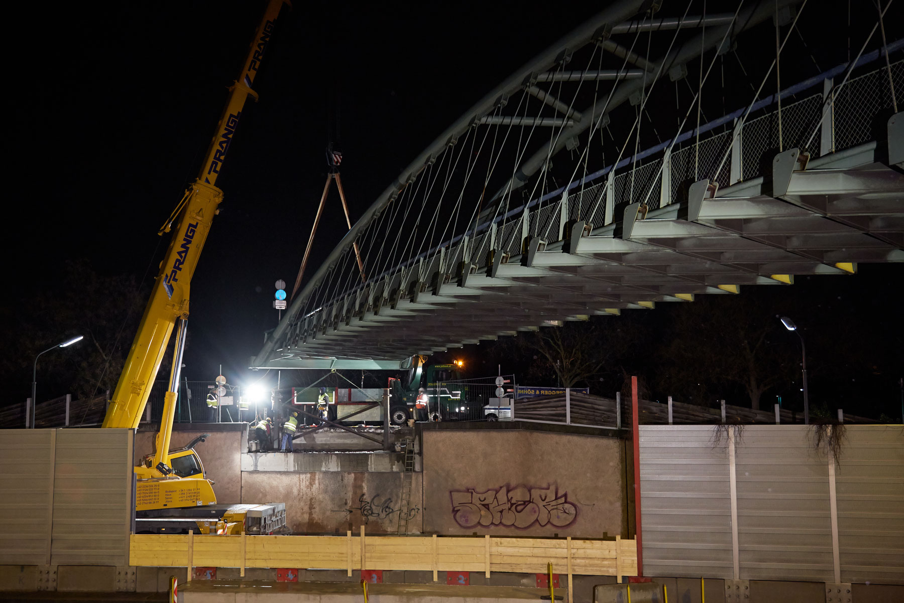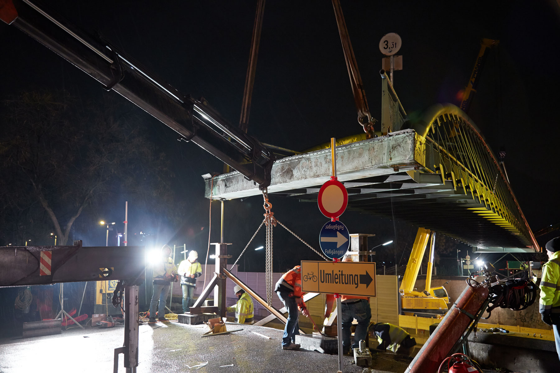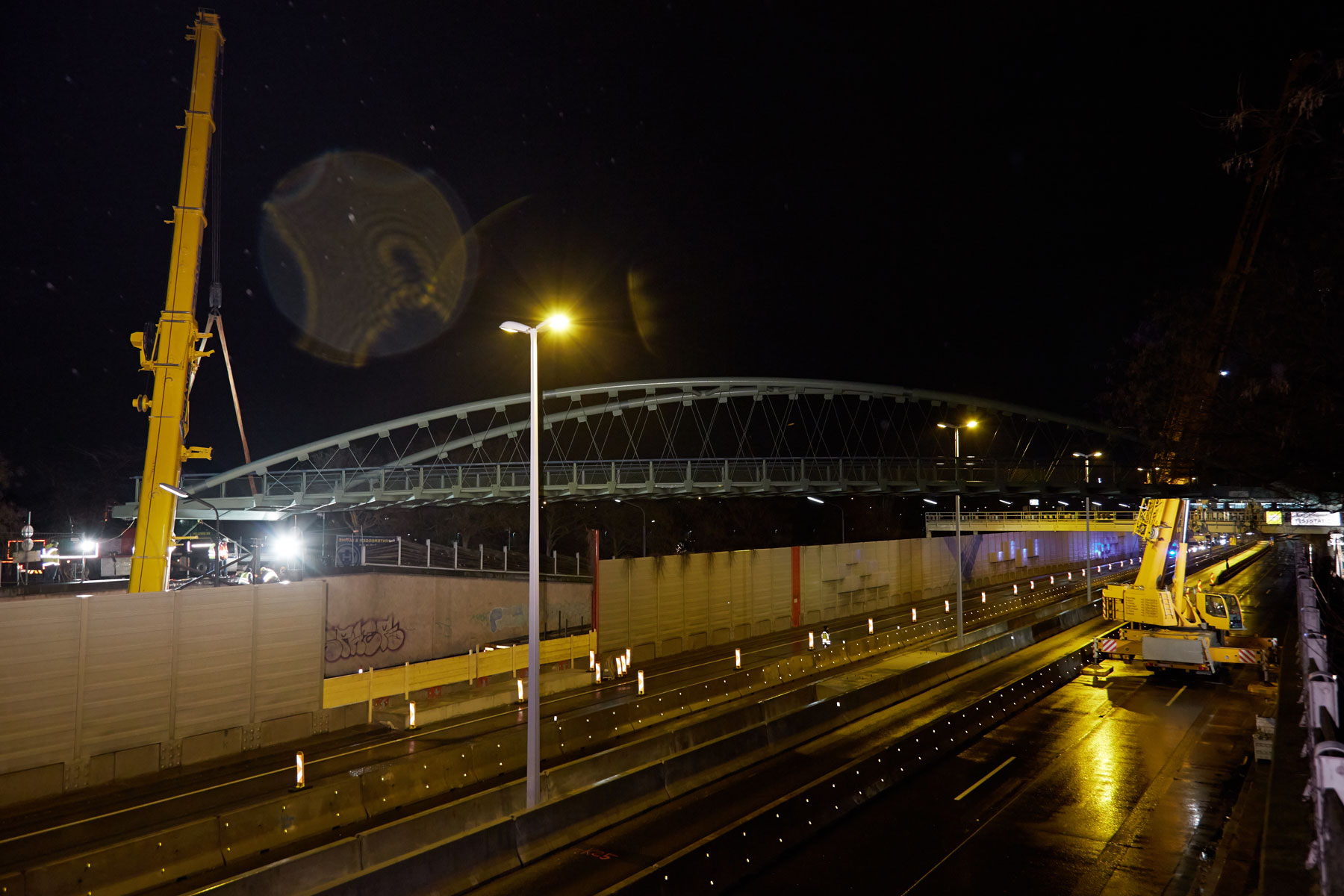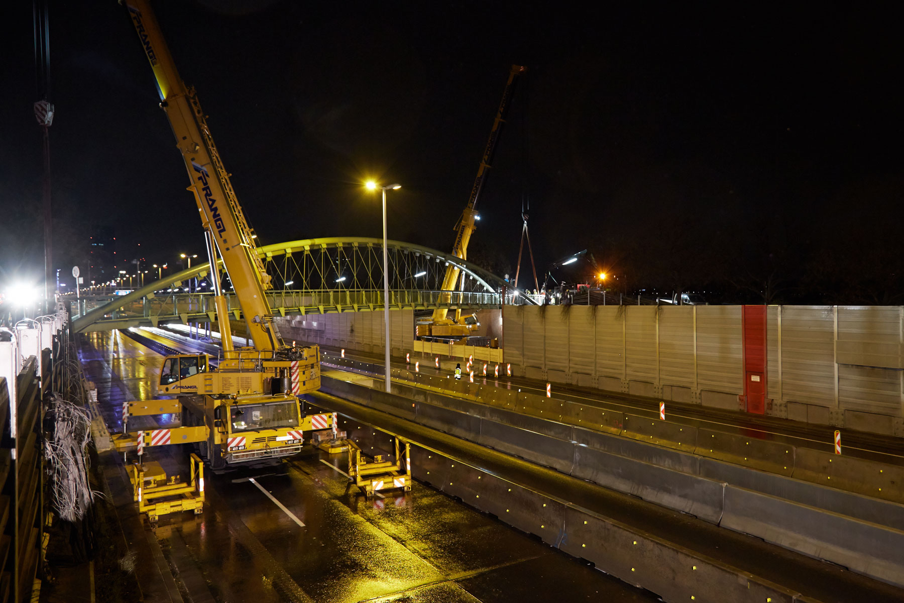 Piratska brv poteka nad avtocesto A22 in povezuje kaisermühlenški nasip s pešpotjo Stara Donava. Za namen prenove smo morali 51 m dolgo in 90 t težko brv dvigniti za pribl. 2,5 m in jo ustrezno podpreti. Za to smo potrebovali teleskopski dvigali nosilnosti 200 t in 120 t. Zaradi ozke stojne površine smo morali na eni strani uporabiti dvigalo nosilnosti 200 t, saj je samo to dvigalo zagotavljalo potrebno dvižno kapaciteto s polovično podporo. Upravljavca obeh dvigal sta morala dvigniti brv popolnoma usklajeno – kljub medsebojni oddaljenosti pribl. 40 m.