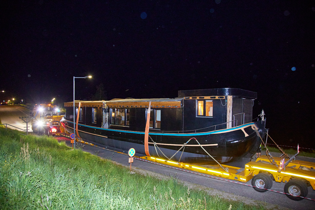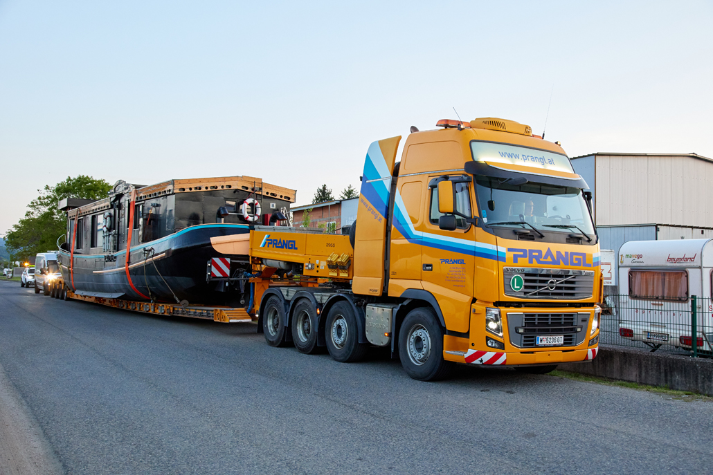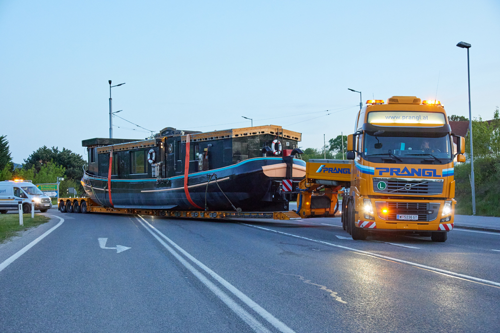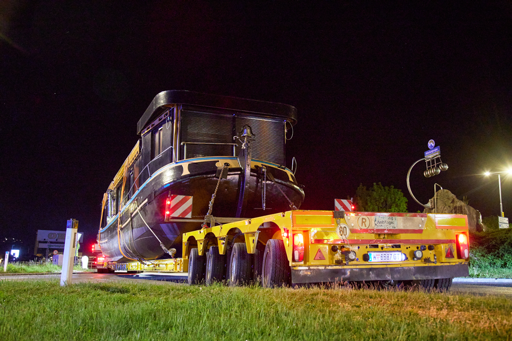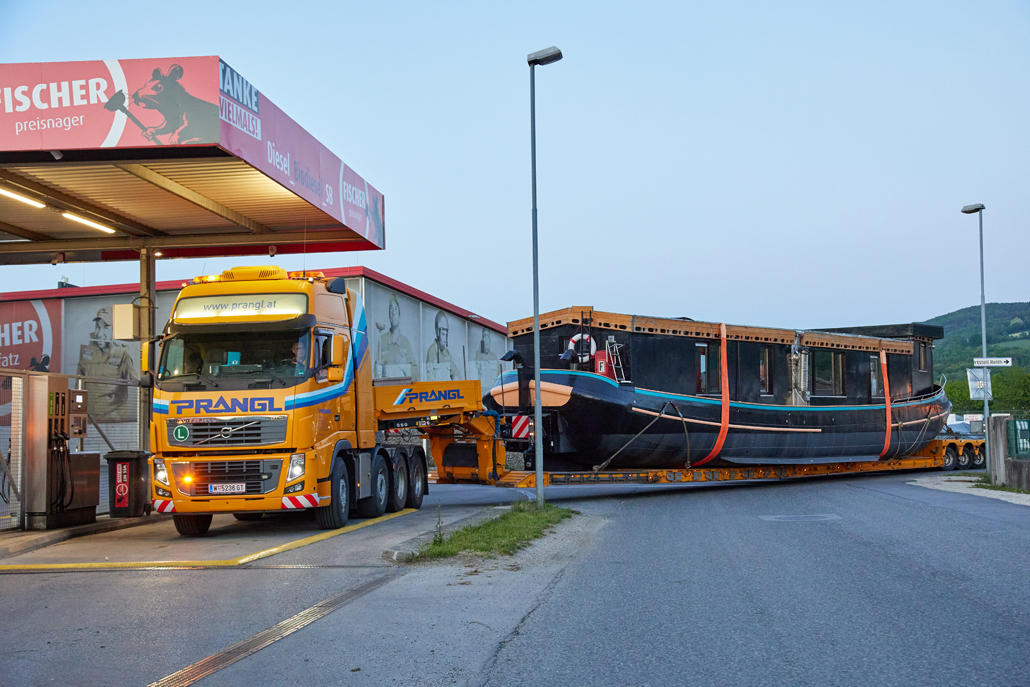 31-tonska plavajoča hiša z dolžino 20,0 metrov, širino 4,3 metra in višino 4,0 metra seveda ni majhen podvig. Prevoz tovora te velikosti postavlja pred prevoznike zelo posebne zahteve. Seveda je bilo treba vnaprej razjasniti, katera pot med Wilhelmsburgom in Pöchlarnom je primerna glede na težo, širino in višino. Poleg tega je bilo treba zagotoviti popolno transportno opremo. Za dvig v skladišču je bilo na voljo 250-tonsko teleskopsko dvigalo, ki je plavajočo hišo dvignilo na 4-osni vlačilec s 4-osnim nizkoprijemnikom.