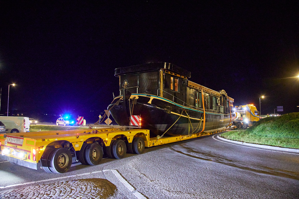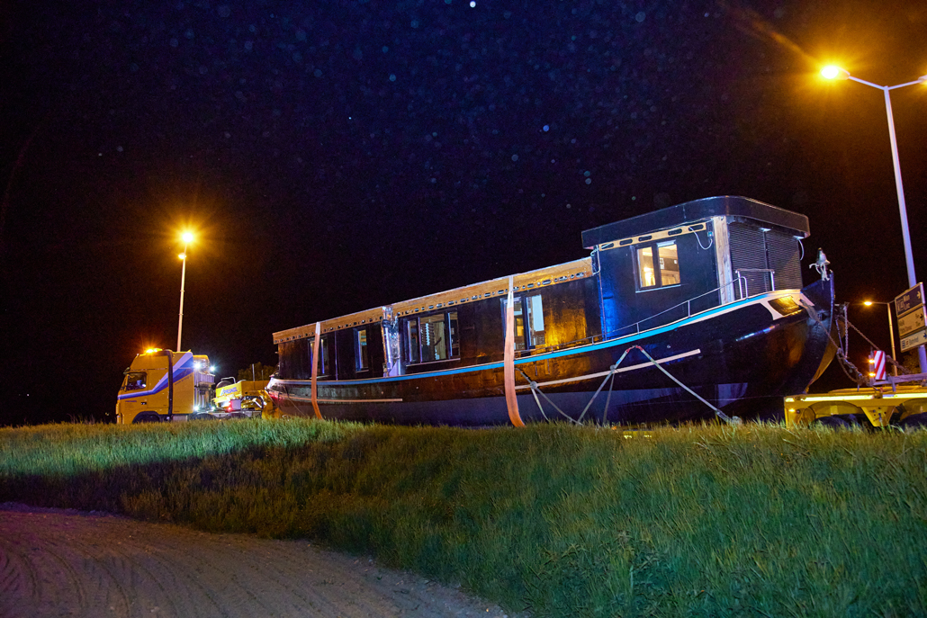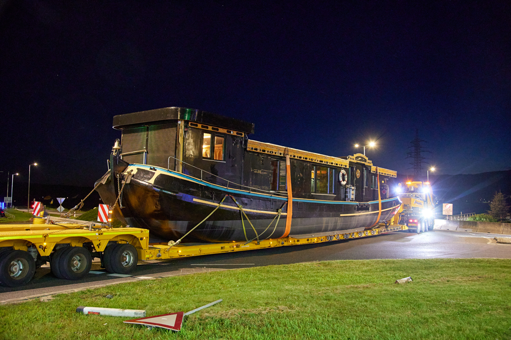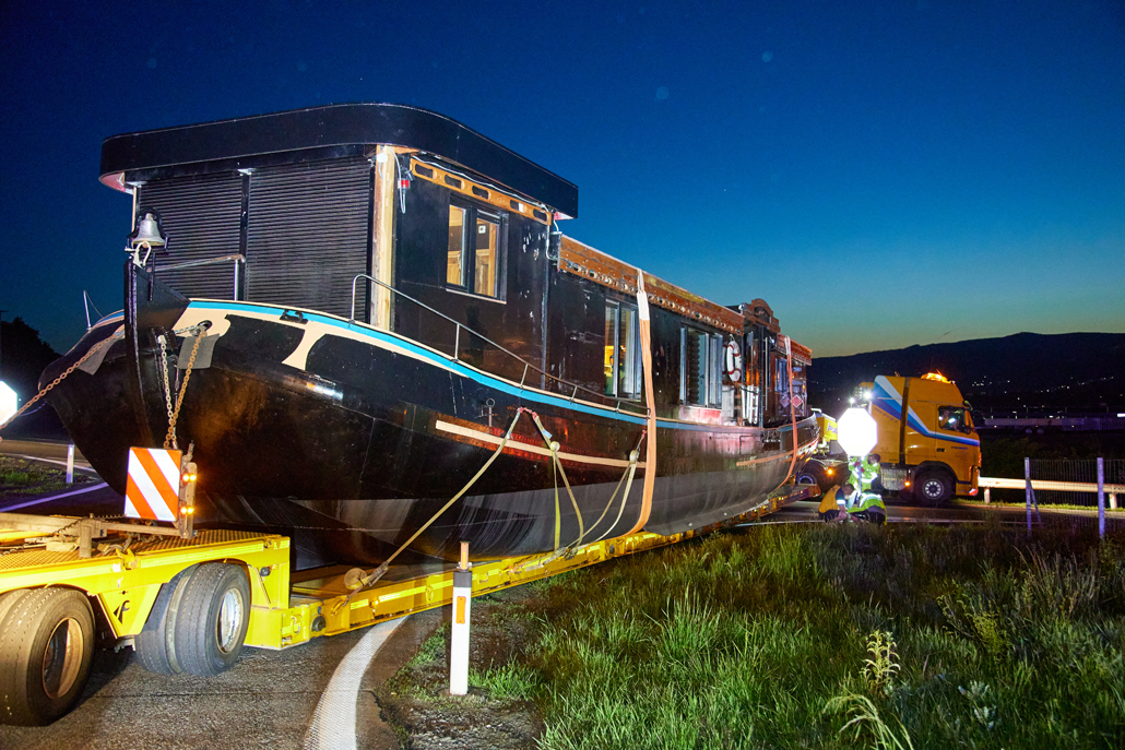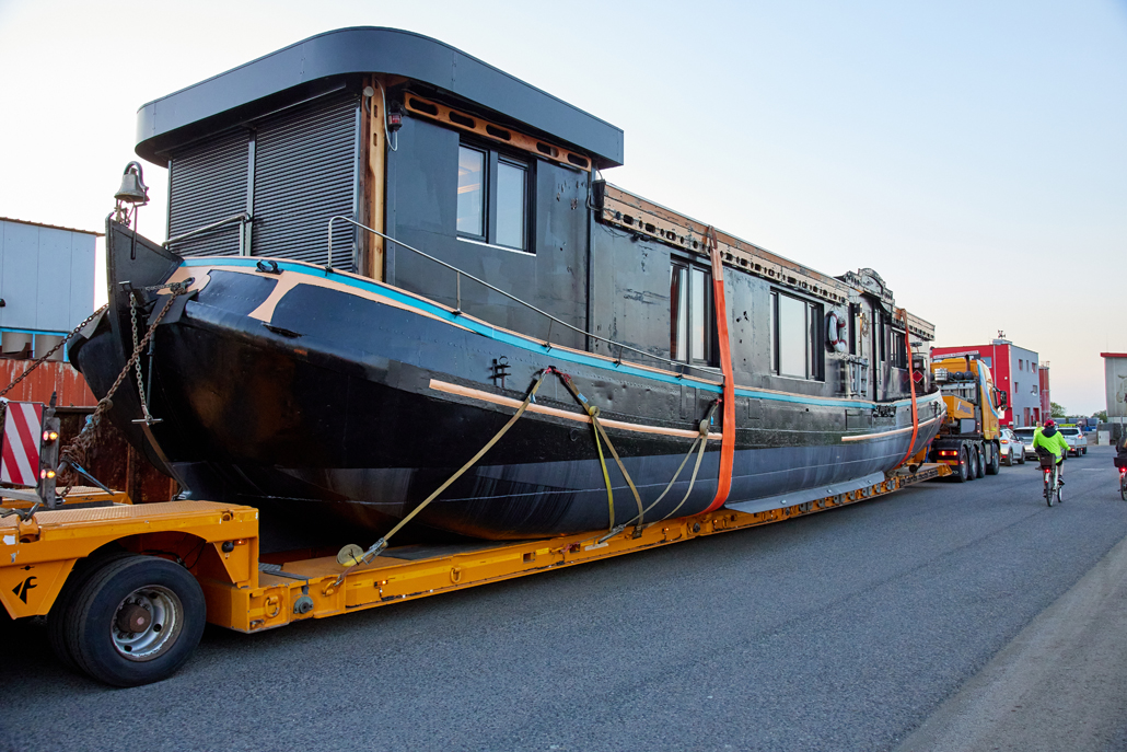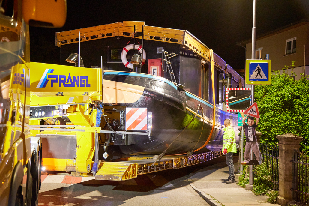 31-tonska plavajoča hiša z dolžino 20,0 metrov, širino 4,3 metra in višino 4,0 metra seveda ni majhen podvig. Prevoz tovora te velikosti postavlja pred prevoznike zelo posebne zahteve. Seveda je bilo treba vnaprej razjasniti, katera pot med Wilhelmsburgom in Pöchlarnom je primerna glede na težo, širino in višino. Poleg tega je bilo treba zagotoviti popolno transportno opremo. Za dvig v skladišču je bilo na voljo 250-tonsko teleskopsko dvigalo, ki je plavajočo hišo dvignilo na 4-osni vlačilec s 4-osnim nizkoprijemnikom.