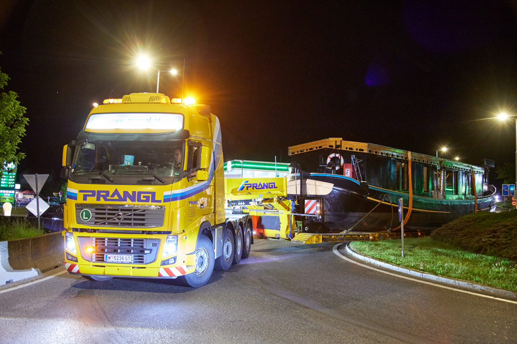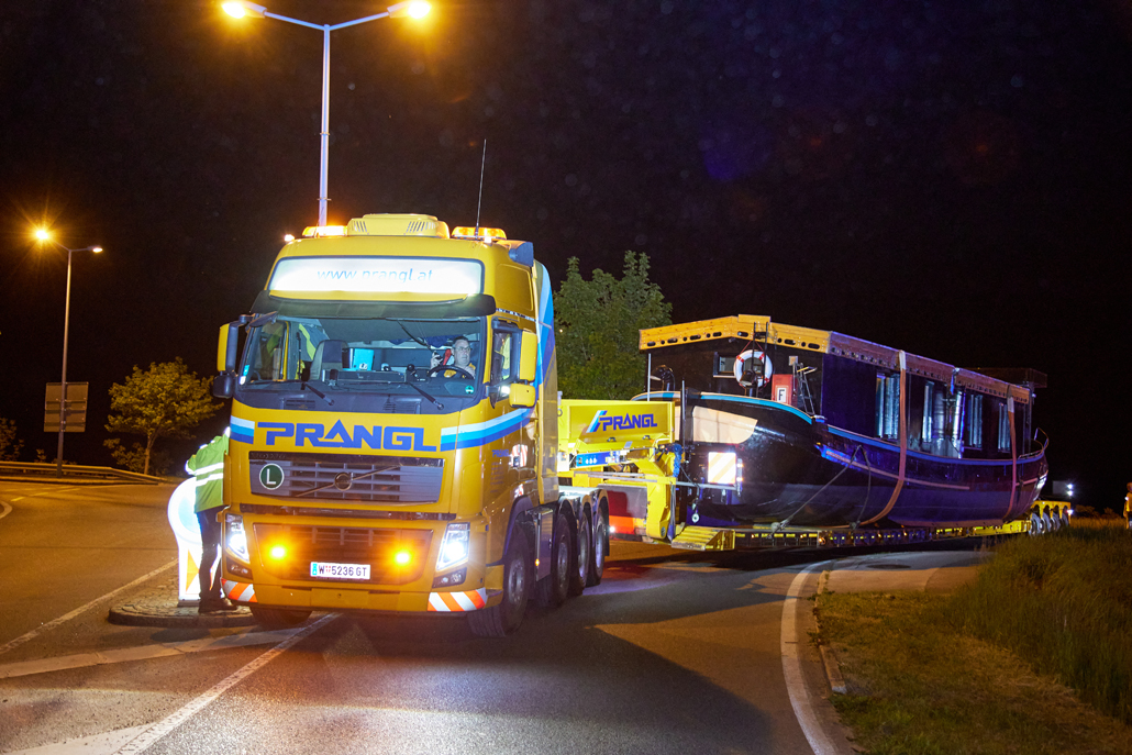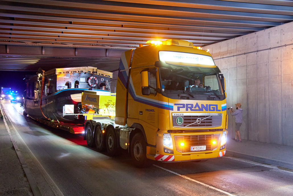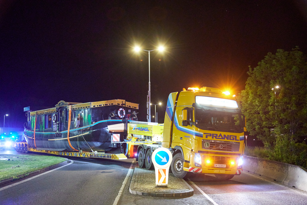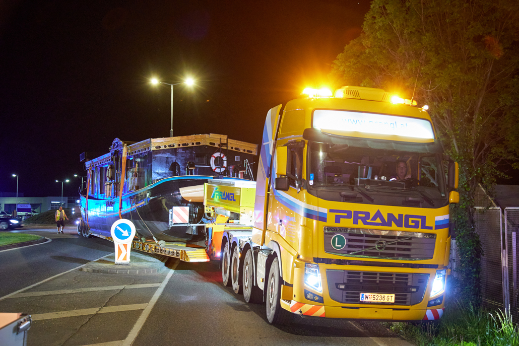 Trajalo je več ur, da je konvoj varno dosegel cilj na Donavi, kjer je voznika in posadko čakala dodatna naloga. Zadnjih 500 metrov je bilo treba premagati v vzvratni prestavi. Na koncu te poti je bil po posebej ostrem ovinku še en ovinek navkreber do Donaulände. Tudi to oviro je premagal v tempu hoje in ob podpori pozornih spremljevalcev. V zgodnjih jutranjih urah je ekipi Prangl na veselje lastnikov končno uspelo čoln spustiti v vodo s pomočjo 250-tonskega teleskopskega dvigala.