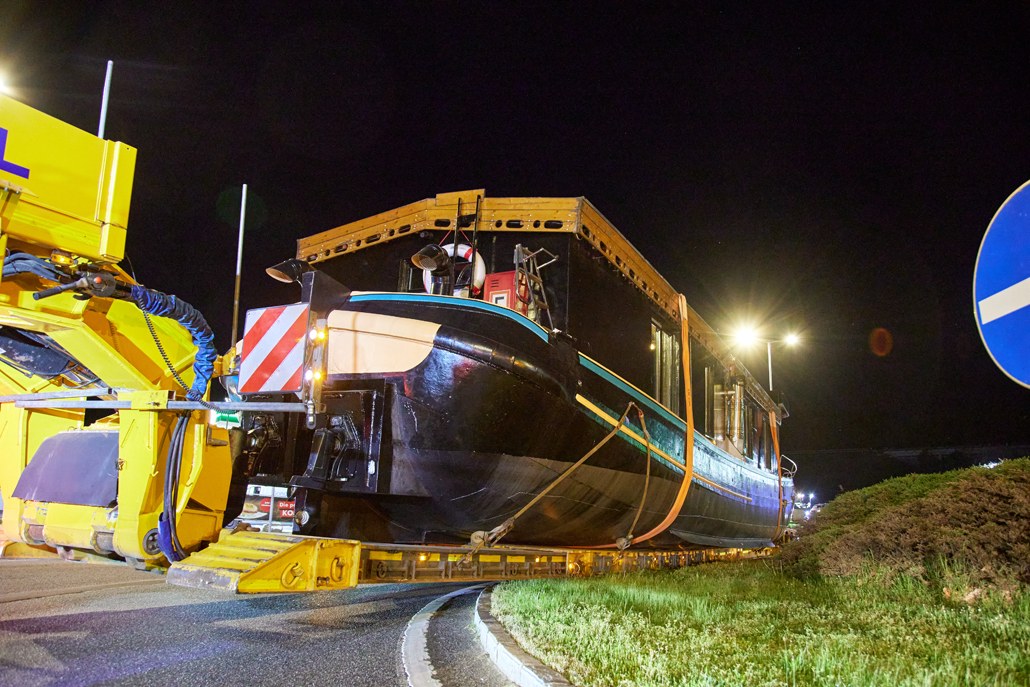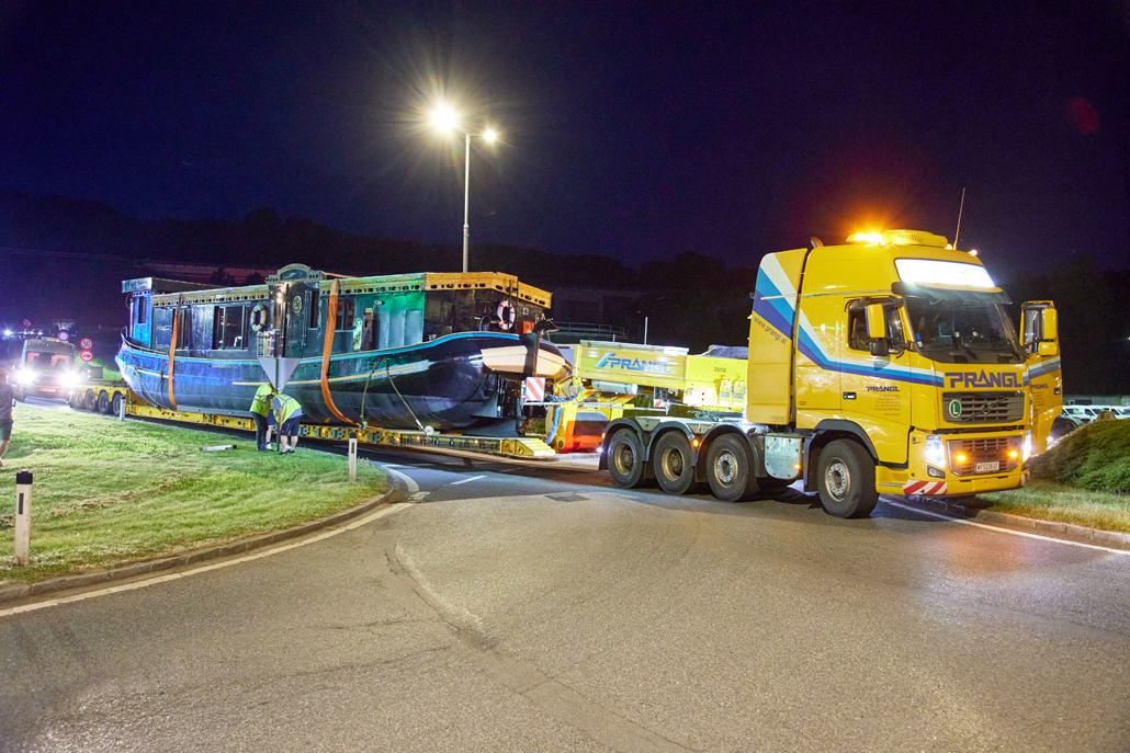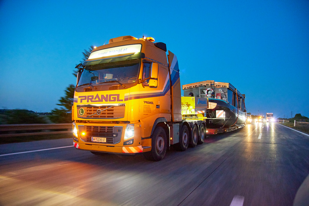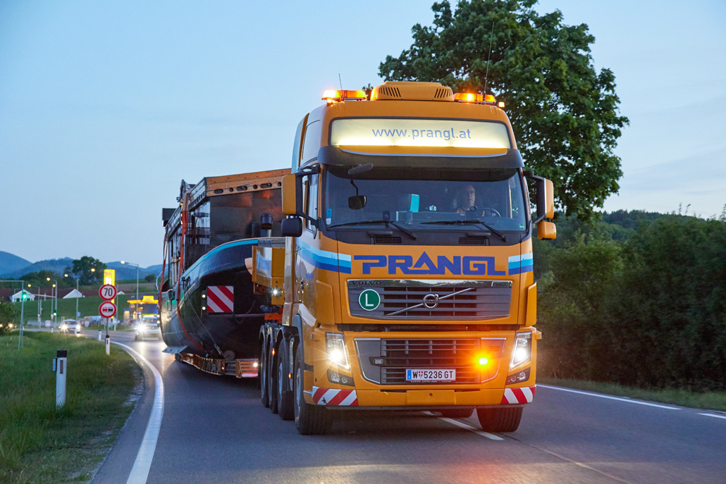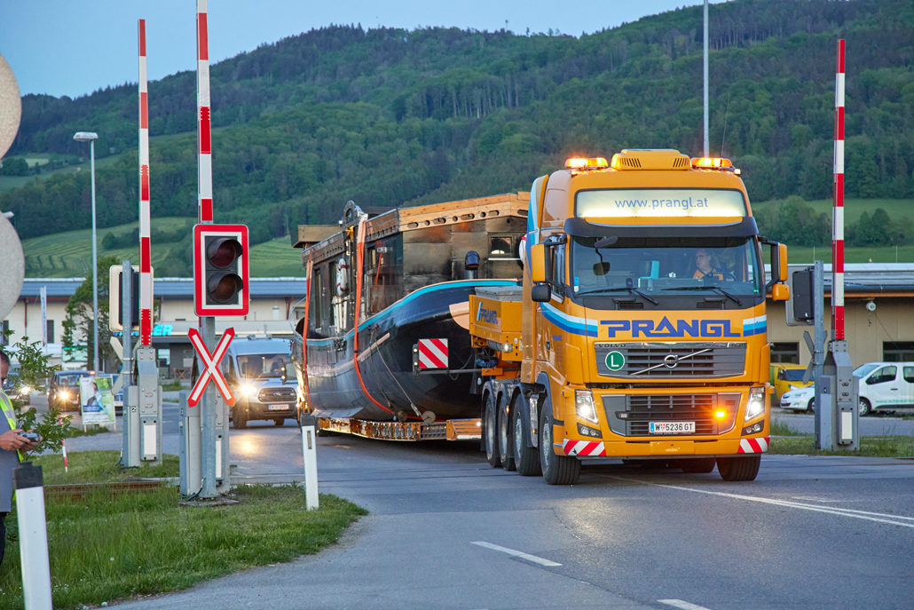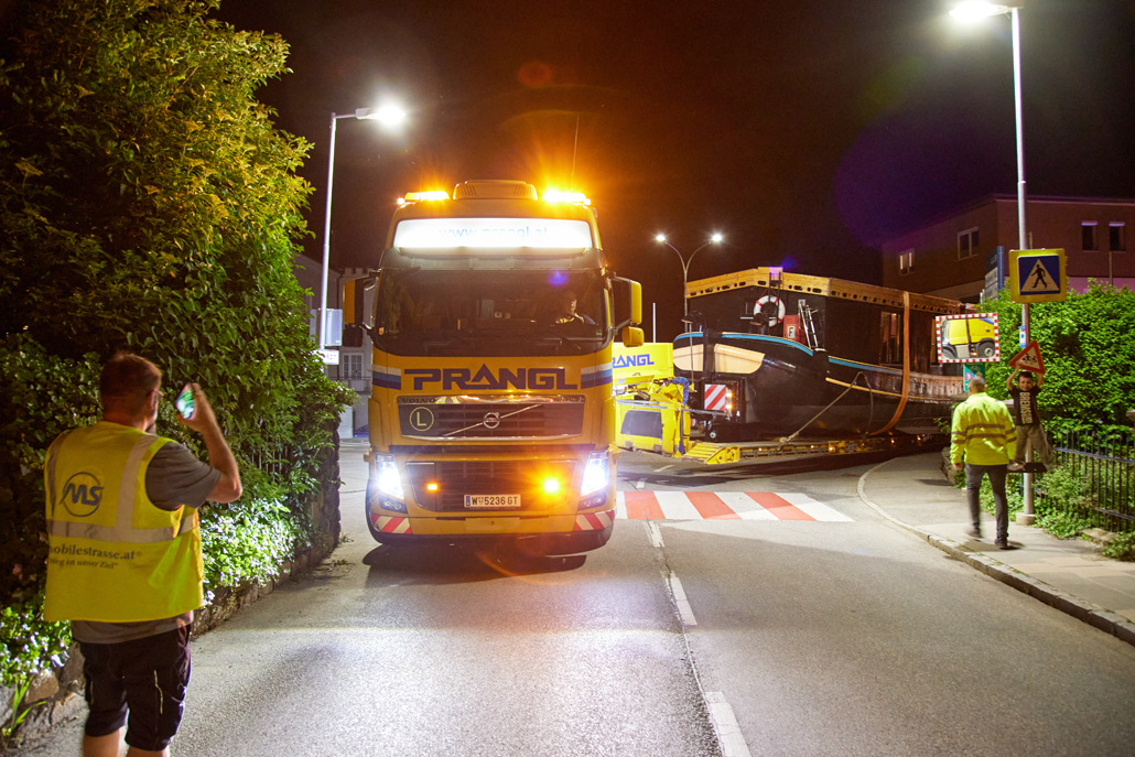 Trajalo je več ur, da je konvoj varno dosegel cilj na Donavi, kjer je voznika in posadko čakala dodatna naloga. Zadnjih 500 metrov je bilo treba premagati v vzvratni prestavi. Na koncu te poti je bil po posebej ostrem ovinku še en ovinek navkreber do Donaulände. Tudi to oviro je premagal v tempu hoje in ob podpori pozornih spremljevalcev. V zgodnjih jutranjih urah je ekipi Prangl na veselje lastnikov končno uspelo čoln spustiti v vodo s pomočjo 250-tonskega teleskopskega dvigala.