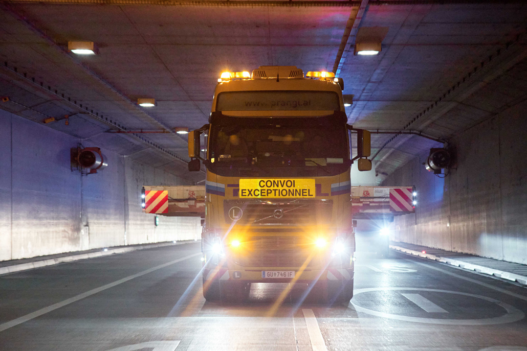 Ekstremne transportne širine zahtevajo transportno opremo, ki je čim bolj mobilna in prilagodljiva. V tem primeru je bil 3-osni vlačilec s 3-osno platformsko prikolico s hidravličnim krmiljenjem odlična izbira. Kratka transportna dolžina v povezavi z zelo dobro sposobnostjo zavijanja je omogočila premagovanje vseh ozkih grl. Nakladalna višina prikolice 1,6 metra je prav tako velika prednost, saj lahko zaniha čez bariere. V kombinaciji z ventilatorjem je tako nastal transportni vlak dolžine 17,5 metra.metra.