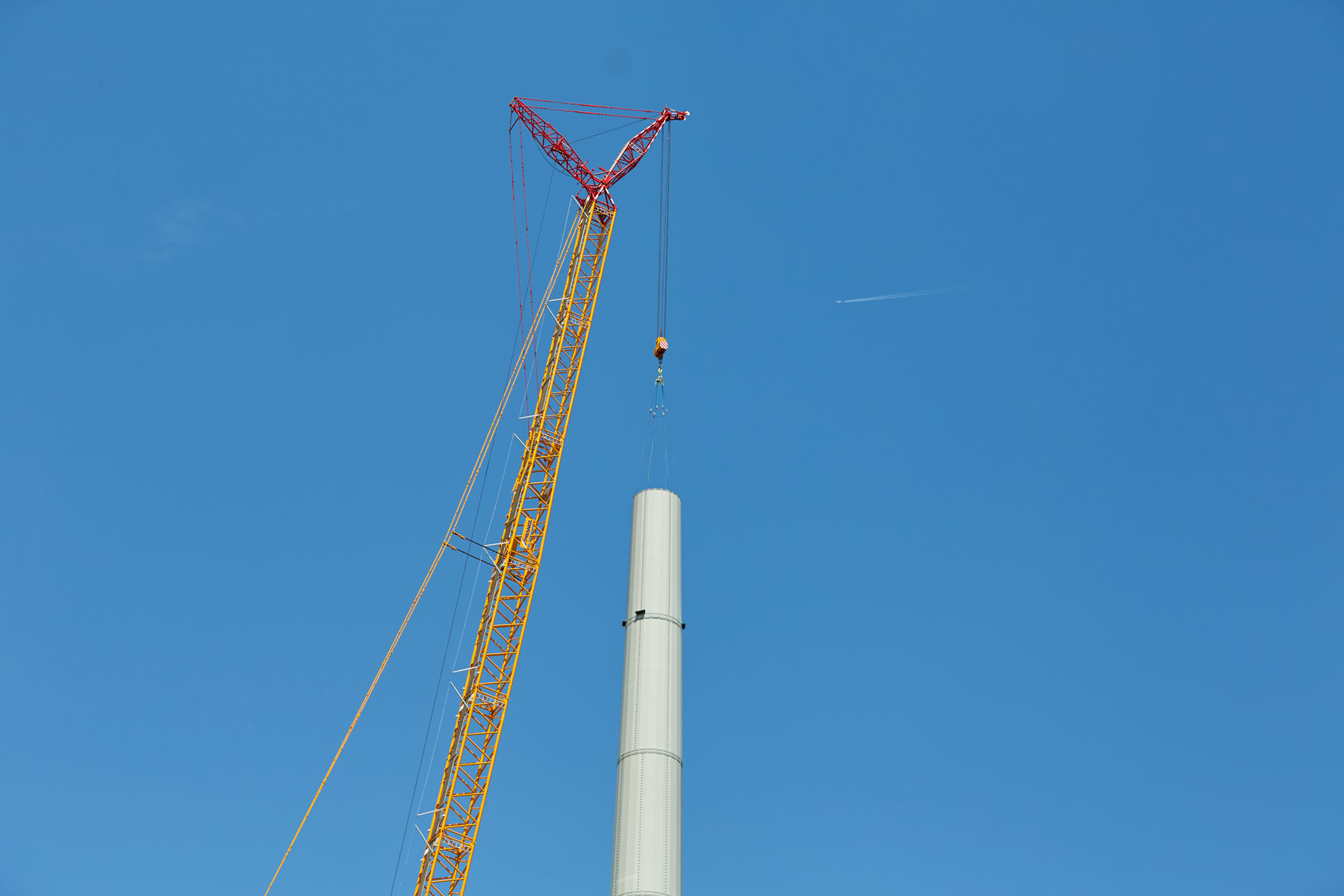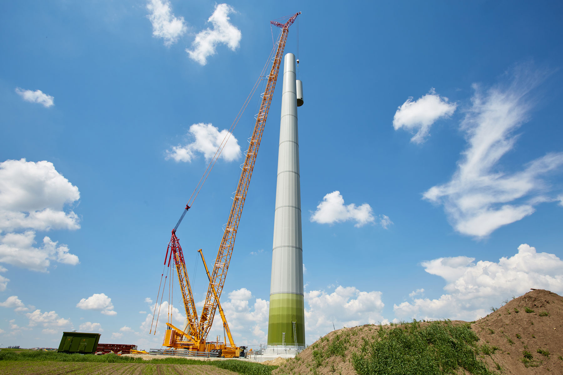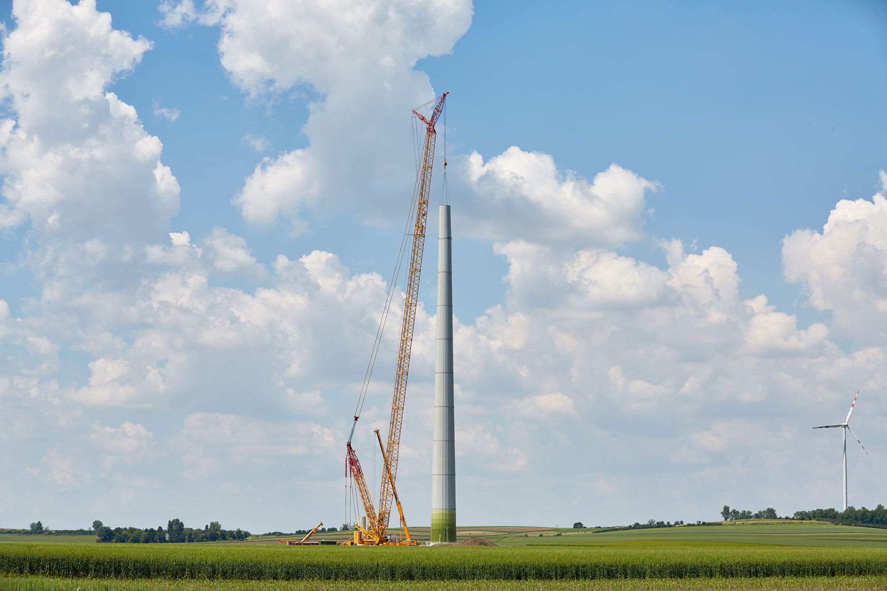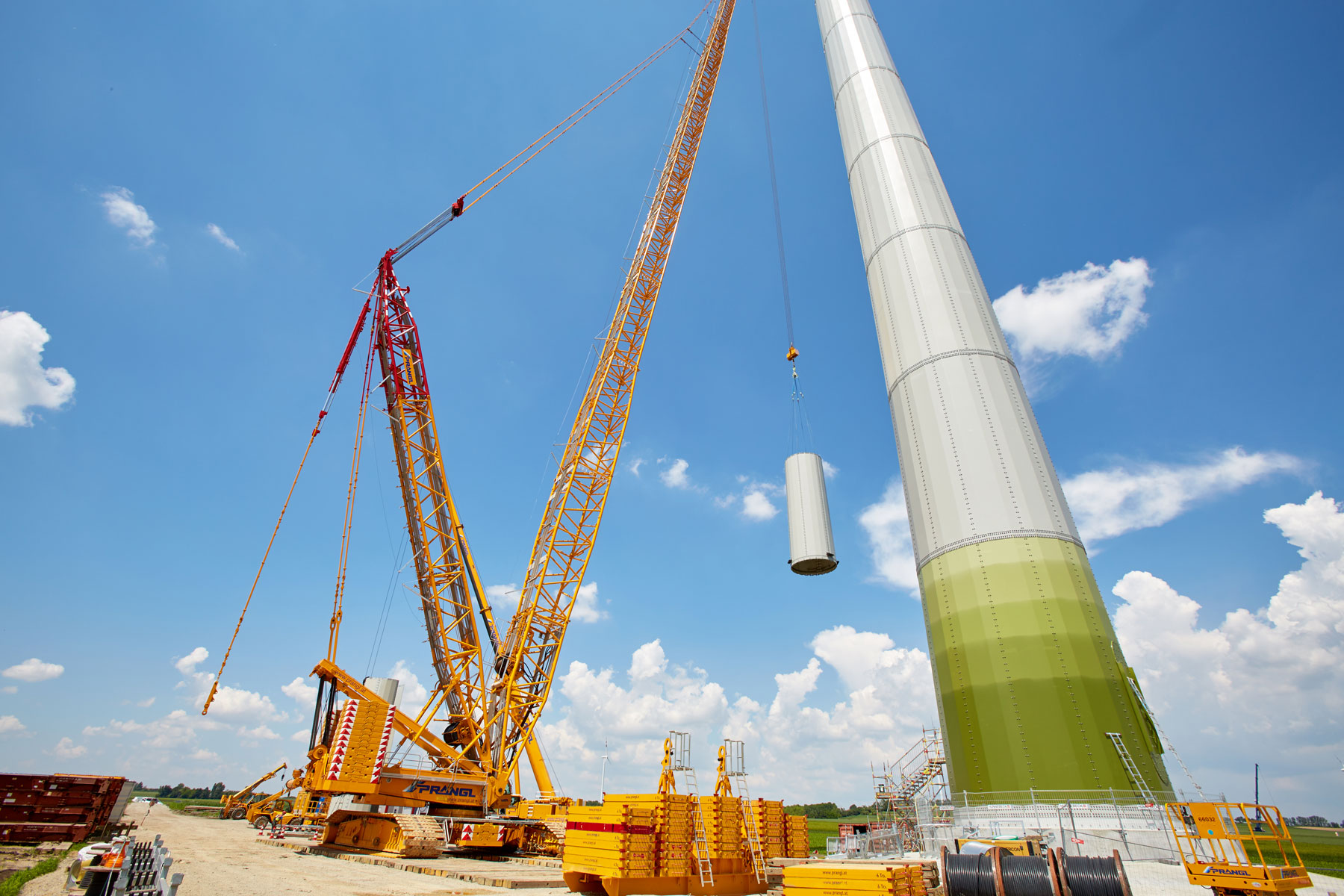 V Scharndorfu, v Spodnji Avstriji, smo na višini 135 m modularnega jeklenega stebra namestili vetrno turbino. Glavna montaža je zahtevala veliko premično dvigalo. Z goseničnim dvigalom nosilnosti 650 t smo na koncu našli ustrezno opremo. Ker je šlo za prototip in s tem nova sredstva za pritrjevanje, je bilo treba celotno glavno roko montirati višje kot običajno. Celoten dvižni sistem je dosegel višino 156 m, tehtal pa je 950 t.